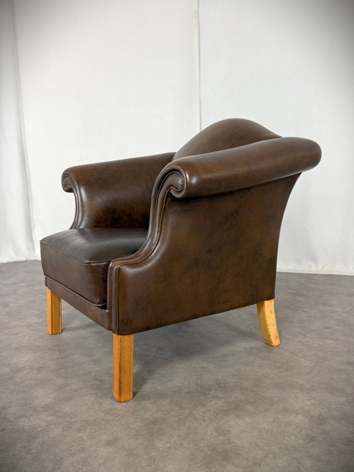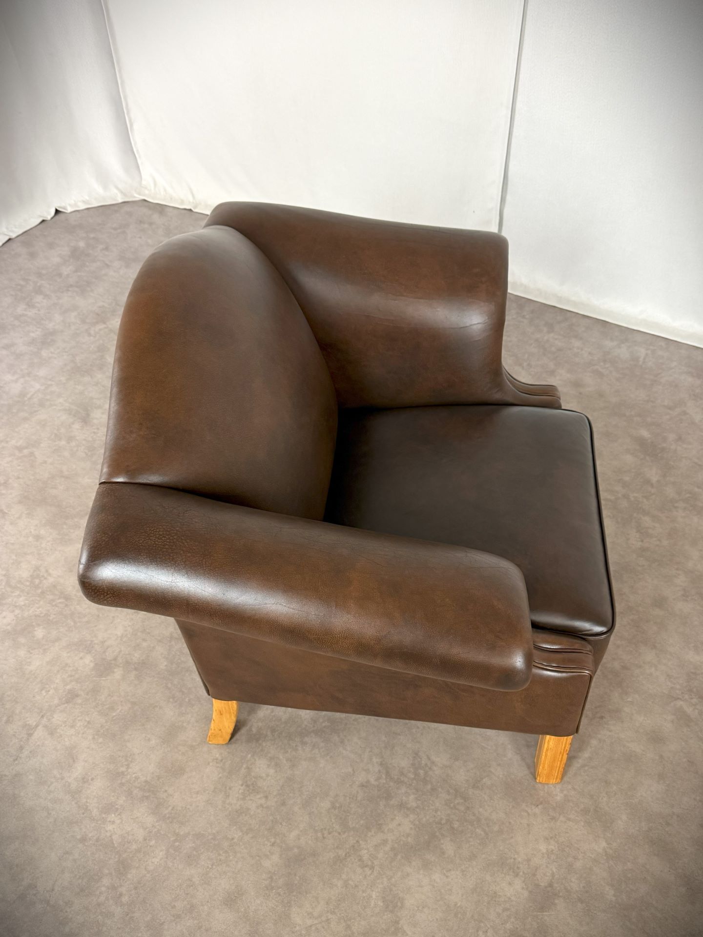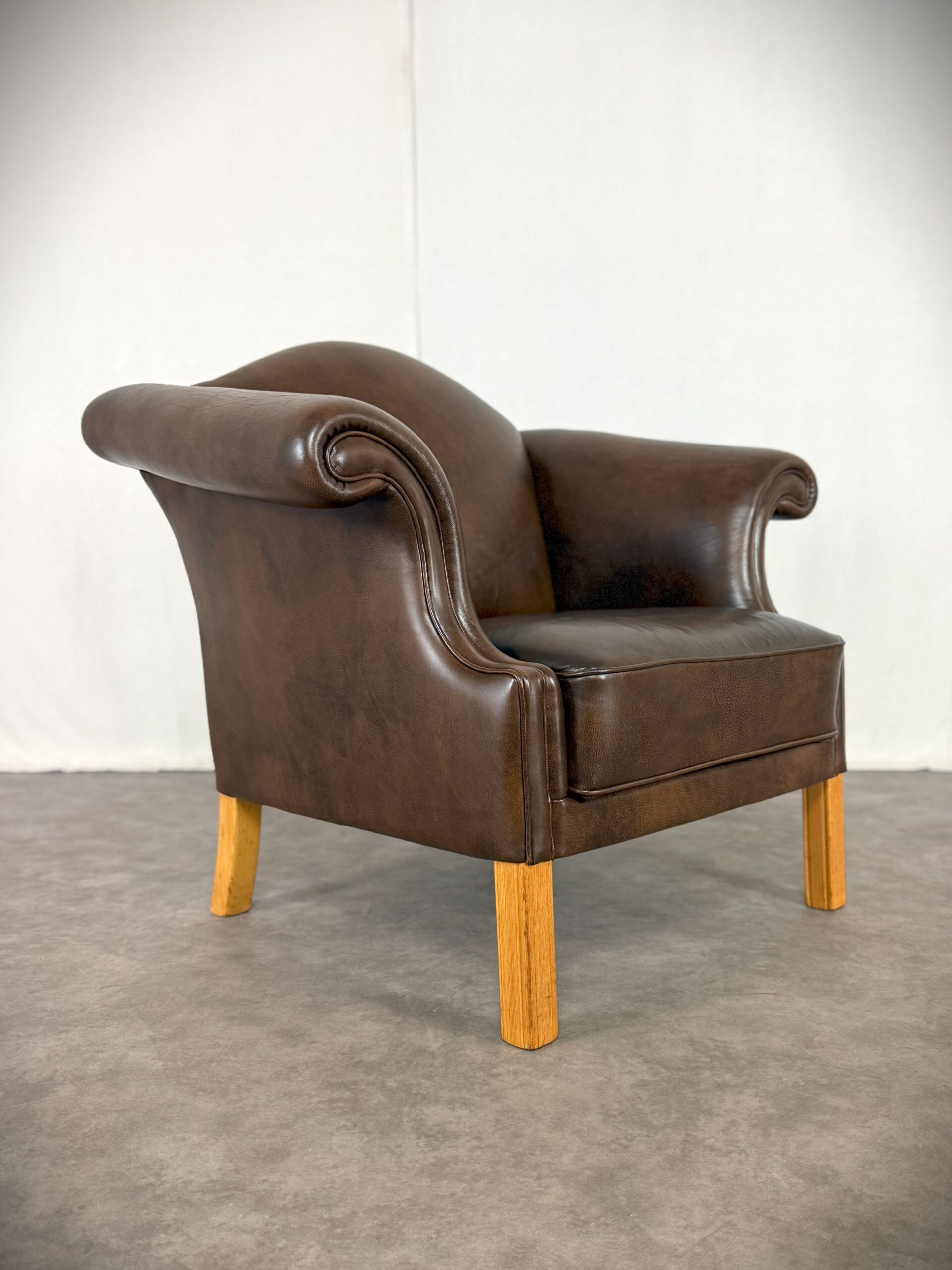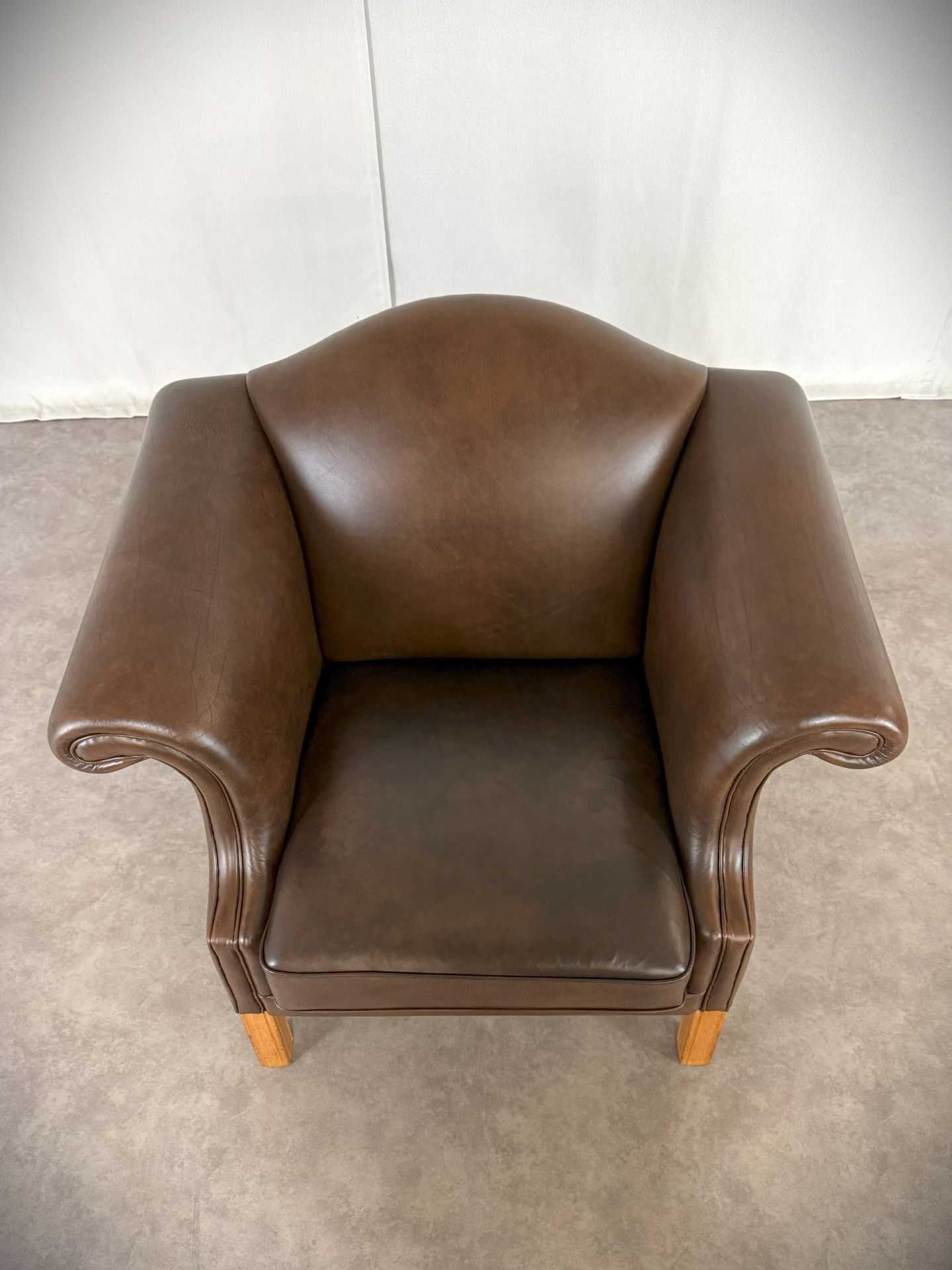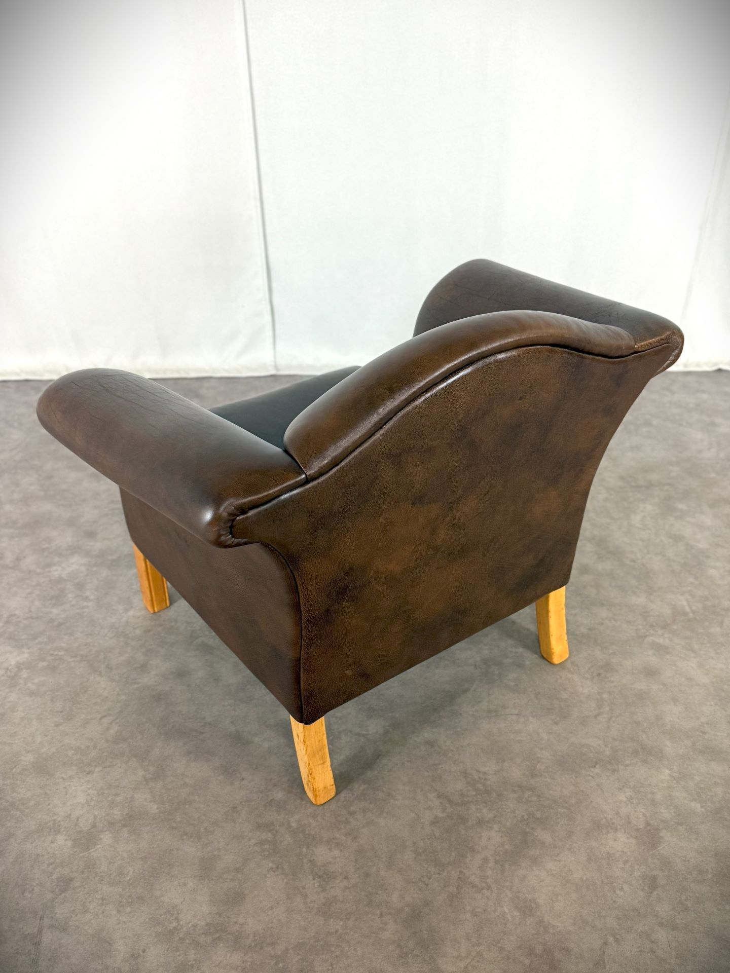 Der Sessel ist vollständig mit hochwertigem, handpatiniertem Rindsleder in einem warmen, tiefen Cognac-Braun bezogen. Das Leder hat im Laufe von über 70 Jahren eine wunderschöne, natürliche Patina entwickelt – tiefe Farbnuancen, leichte Craquelé-Strukturen und charakteristische Gebrauchsspuren, die jedem Kenner sofort die Authentizität und das Alter bestätigen.