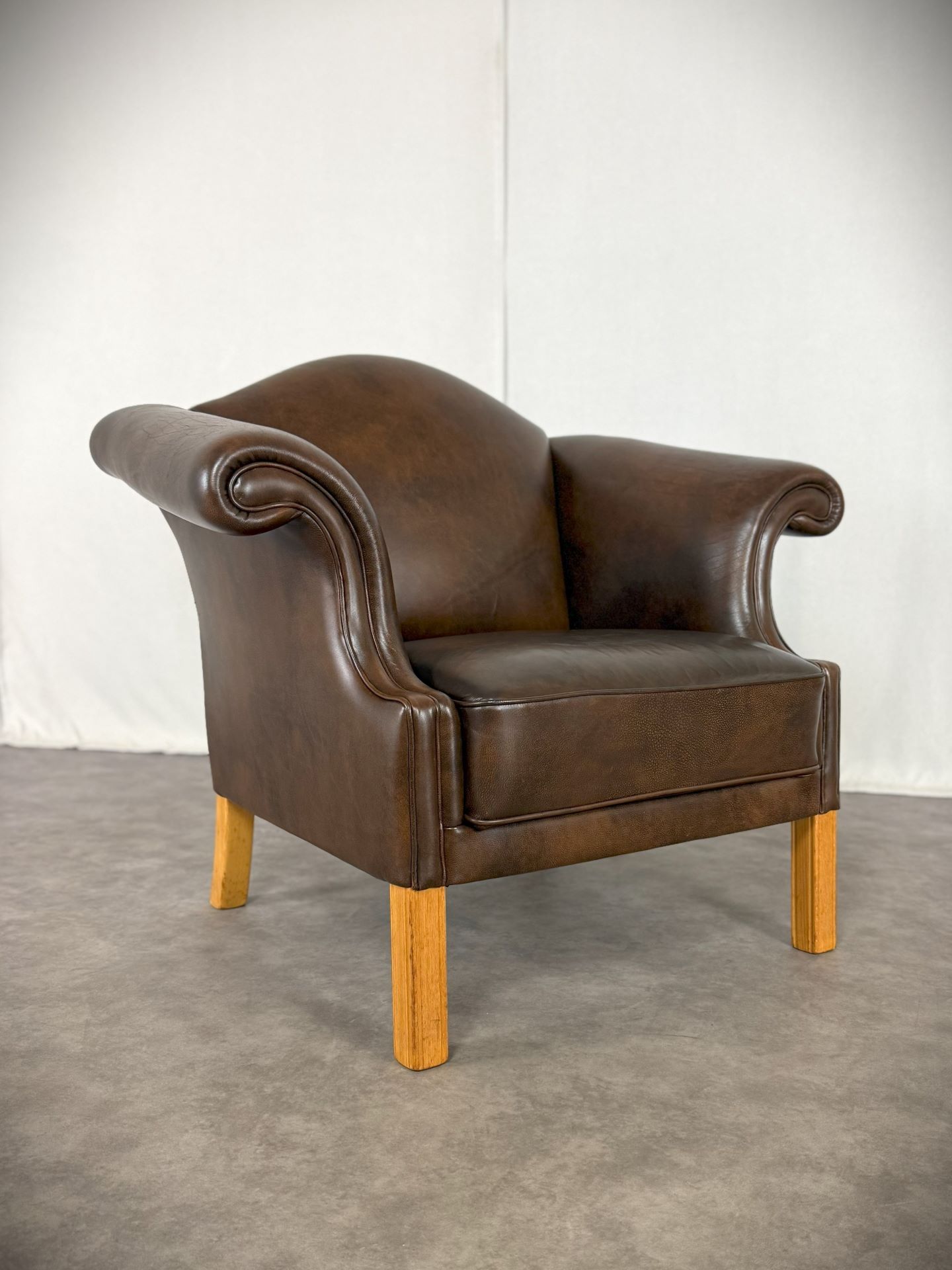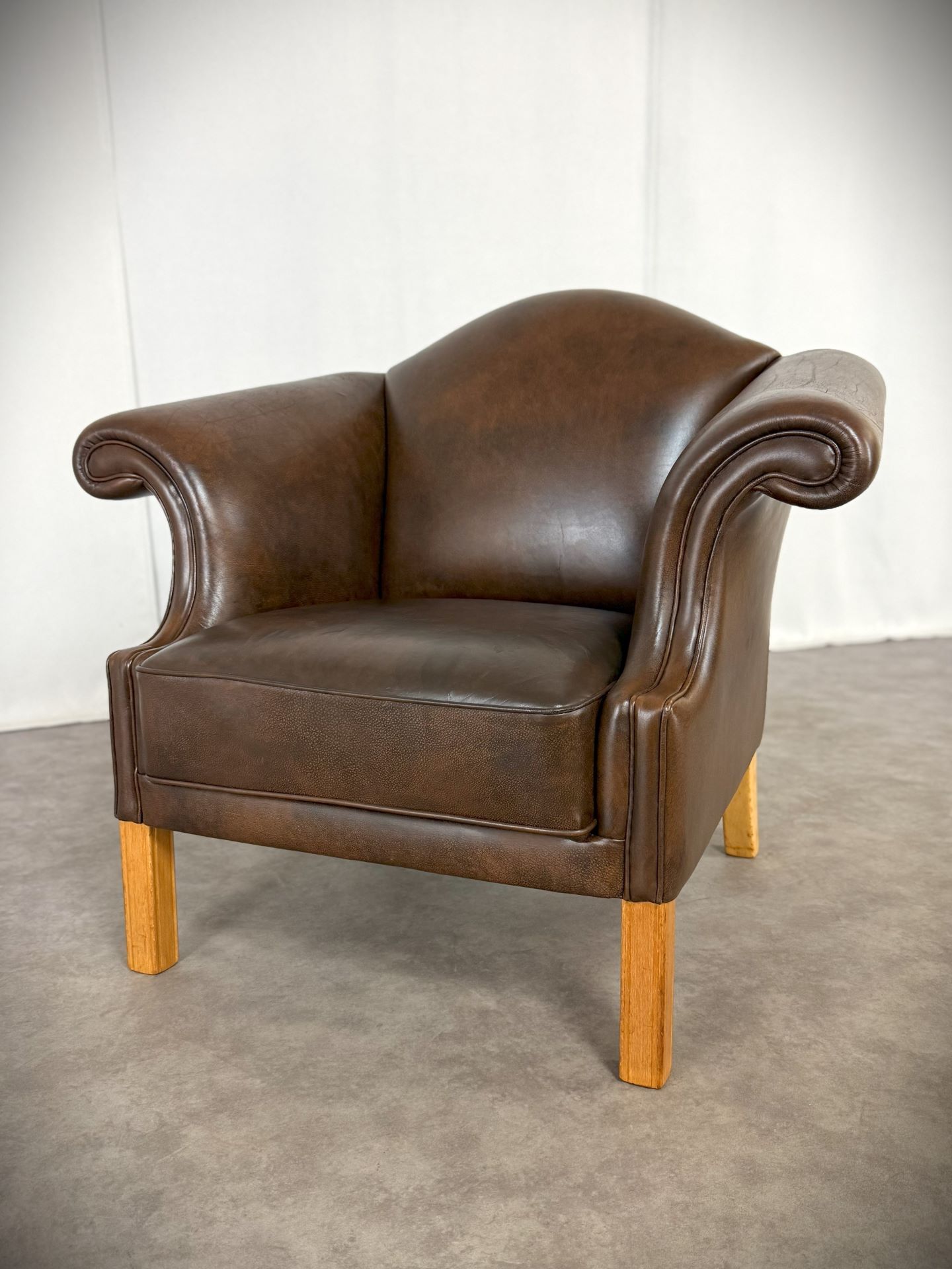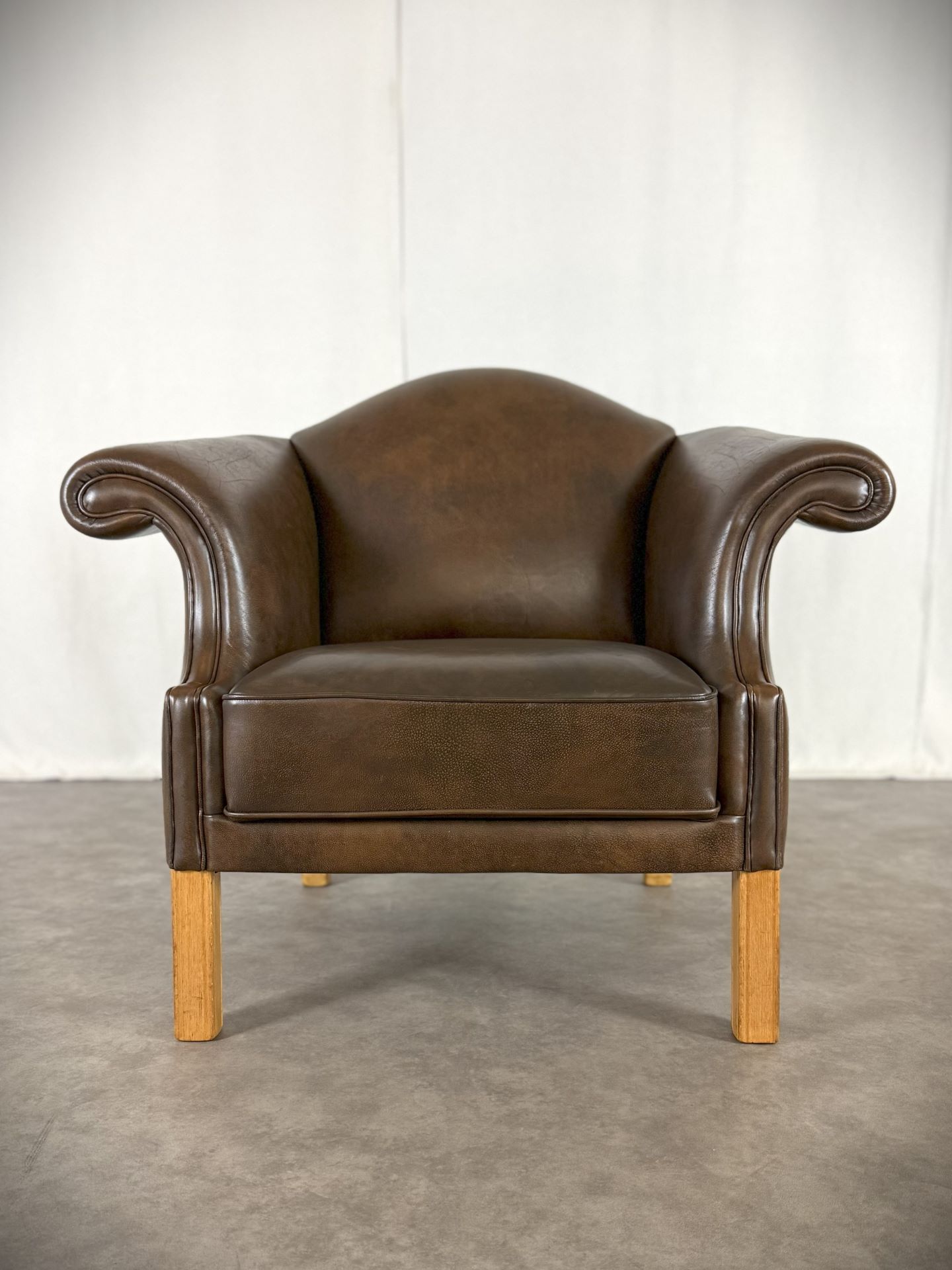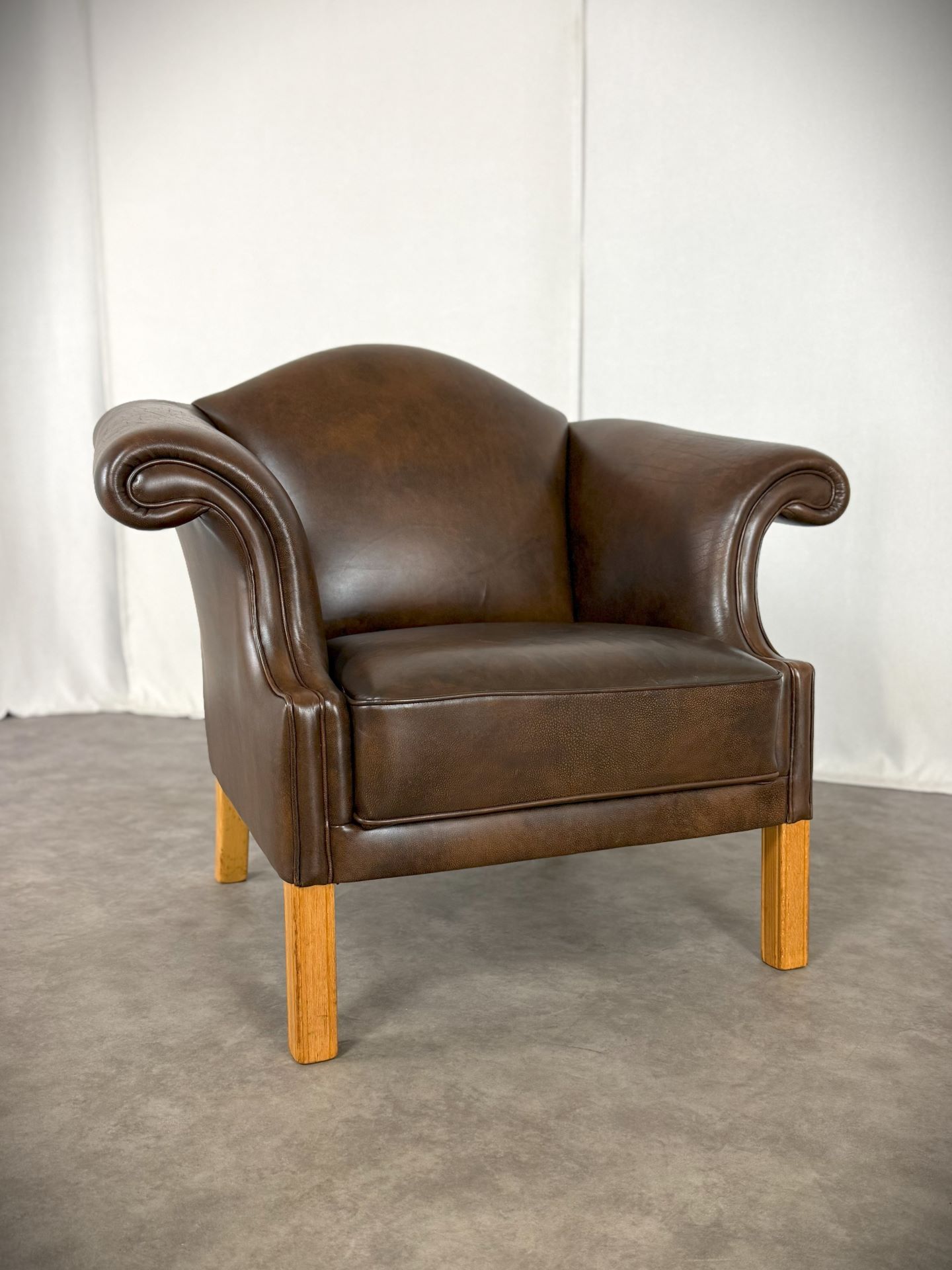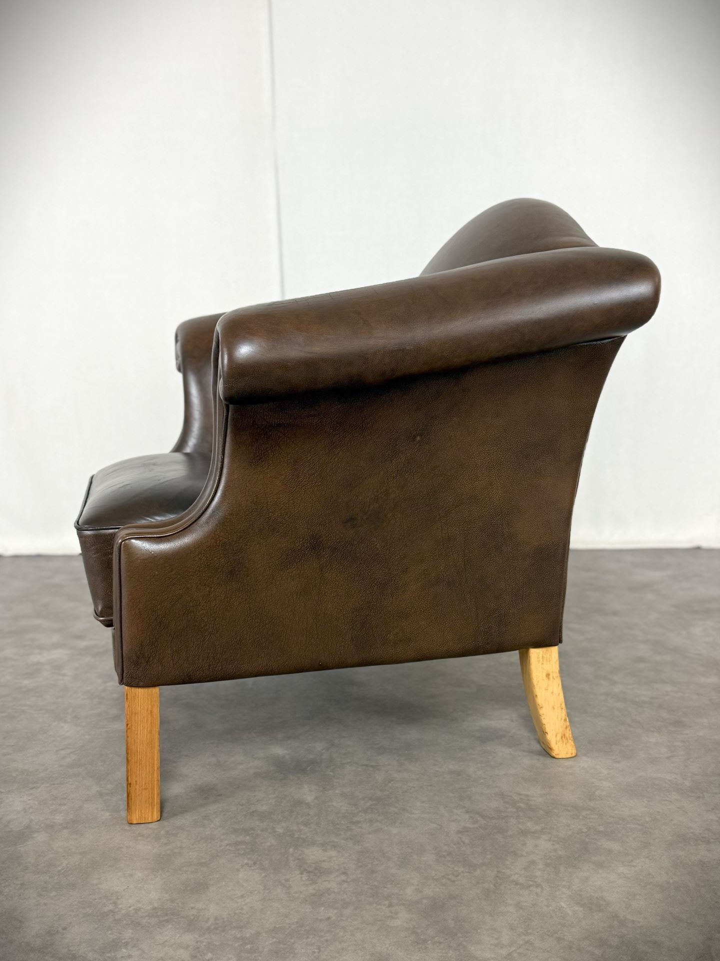 Der Sessel ist vollständig mit hochwertigem, handpatiniertem Rindsleder in einem warmen, tiefen Cognac-Braun bezogen. Das Leder hat im Laufe von über 70 Jahren eine wunderschöne, natürliche Patina entwickelt – tiefe Farbnuancen, leichte Craquelé-Strukturen und charakteristische Gebrauchsspuren, die jedem Kenner sofort die Authentizität und das Alter bestätigen.