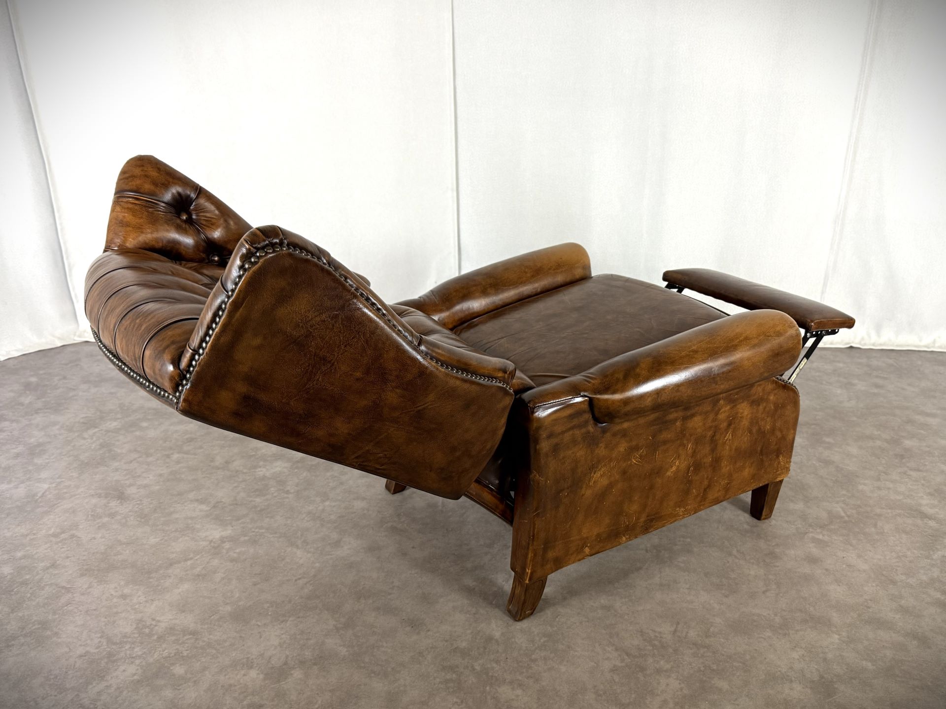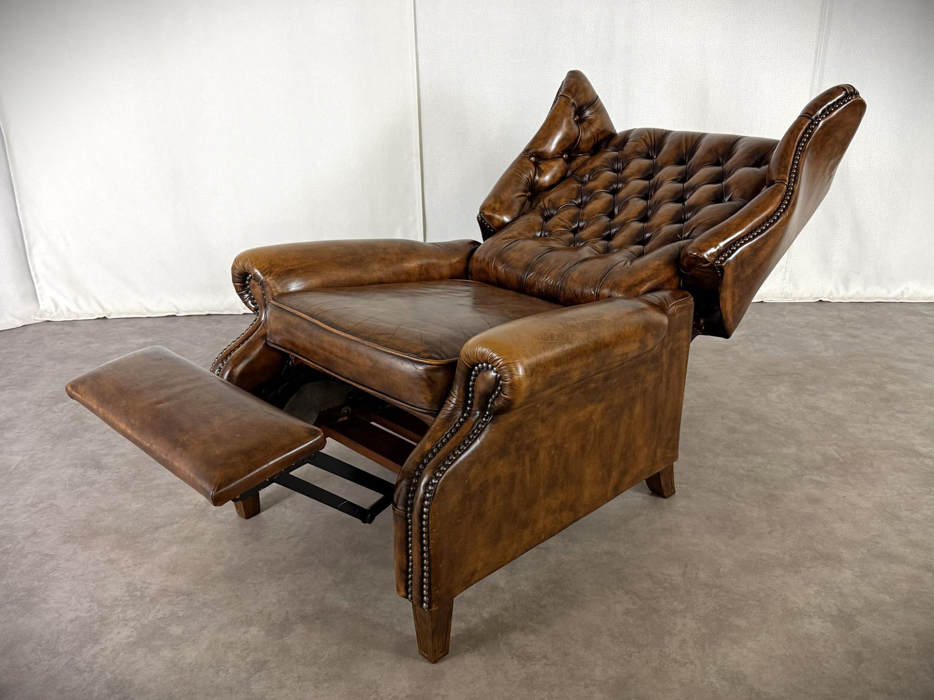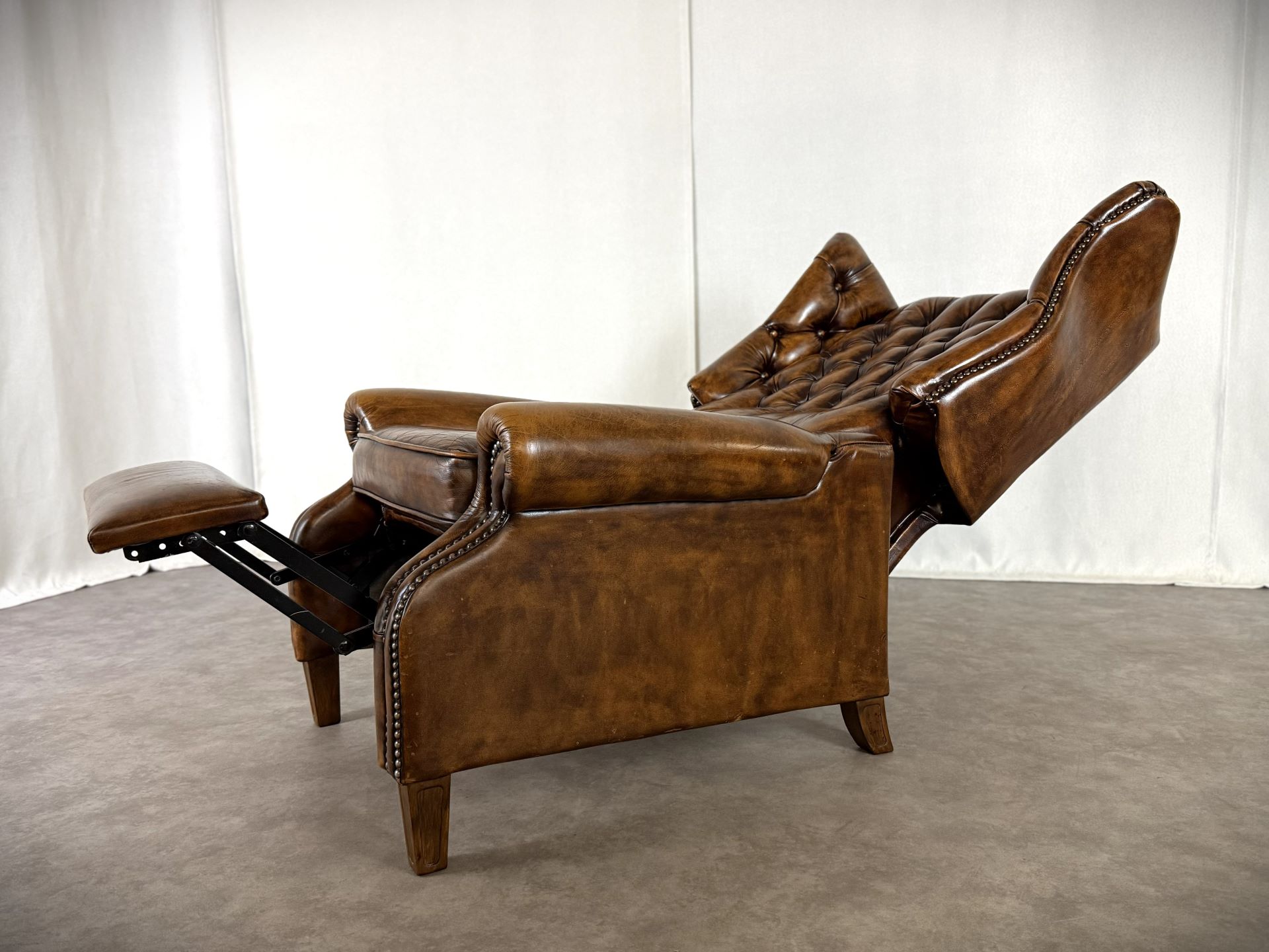 Entdecken Sie diesen wunderschönen Chesterfield-Relaxsessel in edlem, braunen Rindleder – ein echtes Highlight für jedes stilvolle Wohnzimmer, Leseecke oder Herrenzimmer. Der Sessel verbindet den traditionellen Chesterfield-Stil mit der praktischen Funktion eines modernen Relaxsessels und bietet puren Luxus und Entspannung.