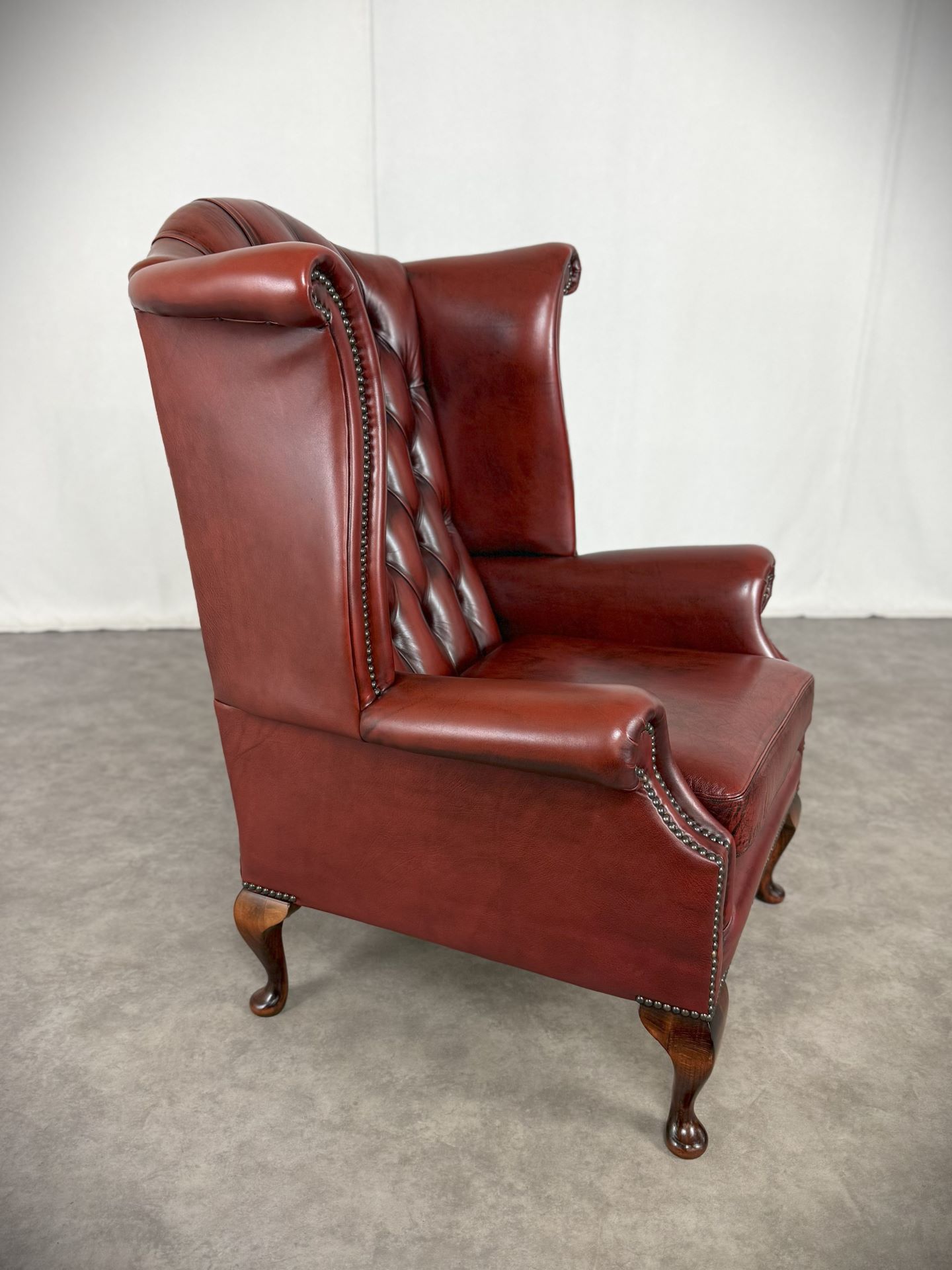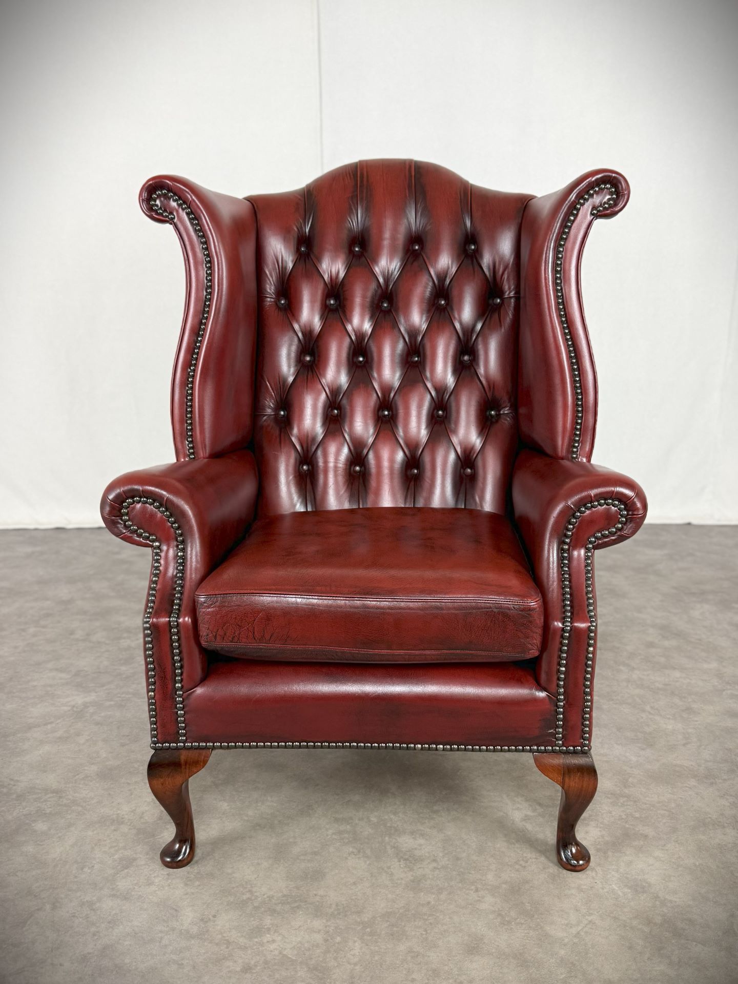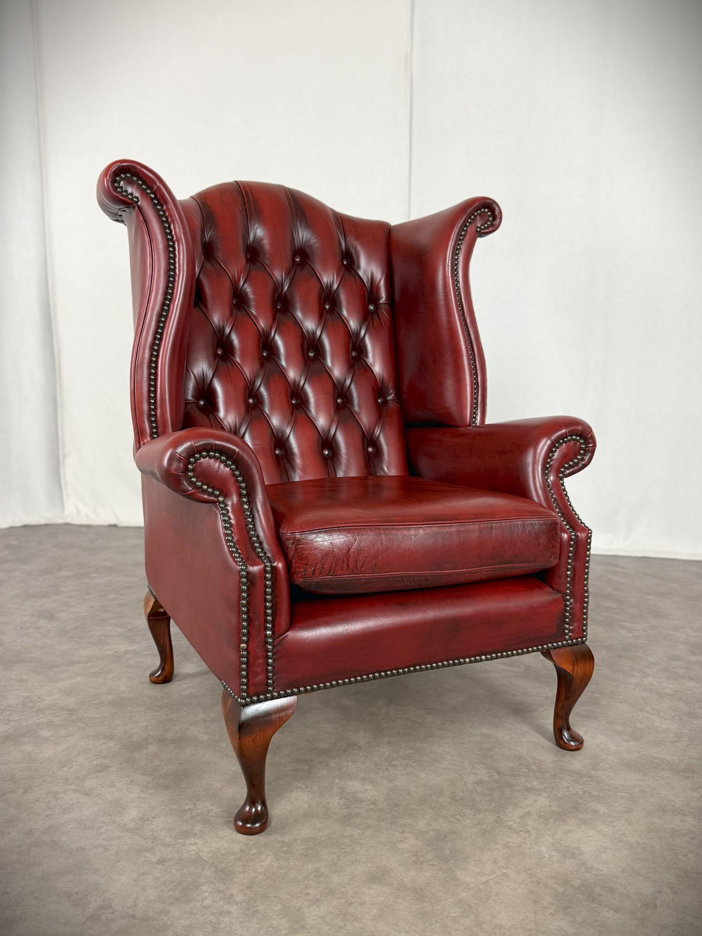 Die gepolsterteten Armlehnen und der hochwertige Oxblood-Rindleder Bezug sorgen für Komfort und eine lange Lebensdauer. Der Sessel ist mit dekorativen Nieten verziert und steht auf vier stabilen, schön geformten Holzfüßen. Ideal für stillvolle Wohnräume, Büros oder Bibliotheken.