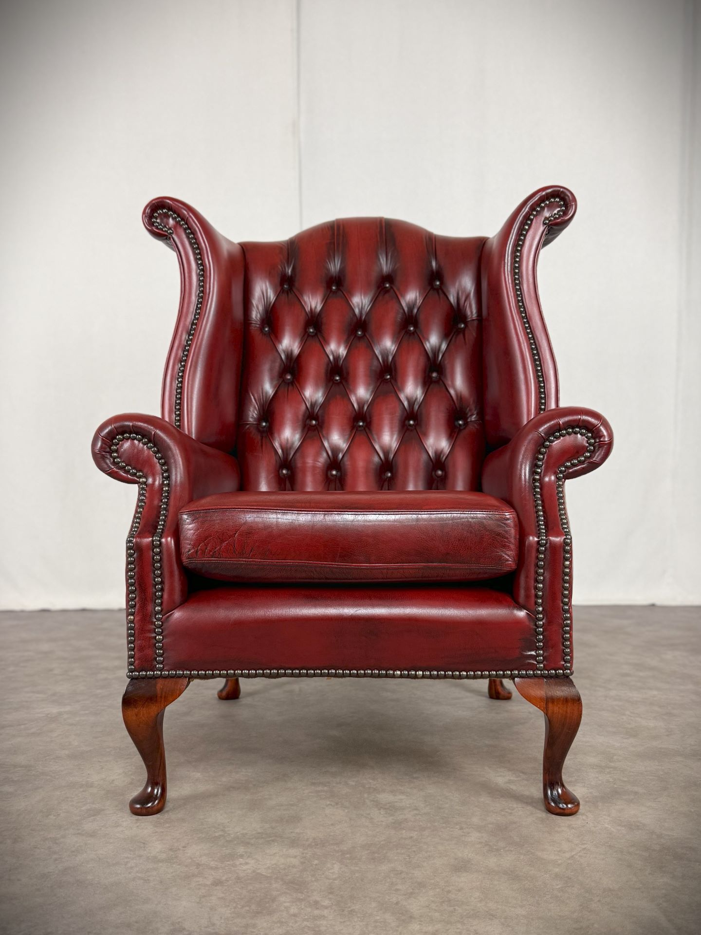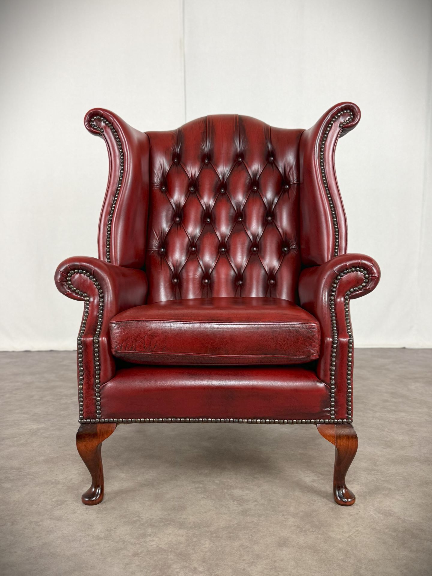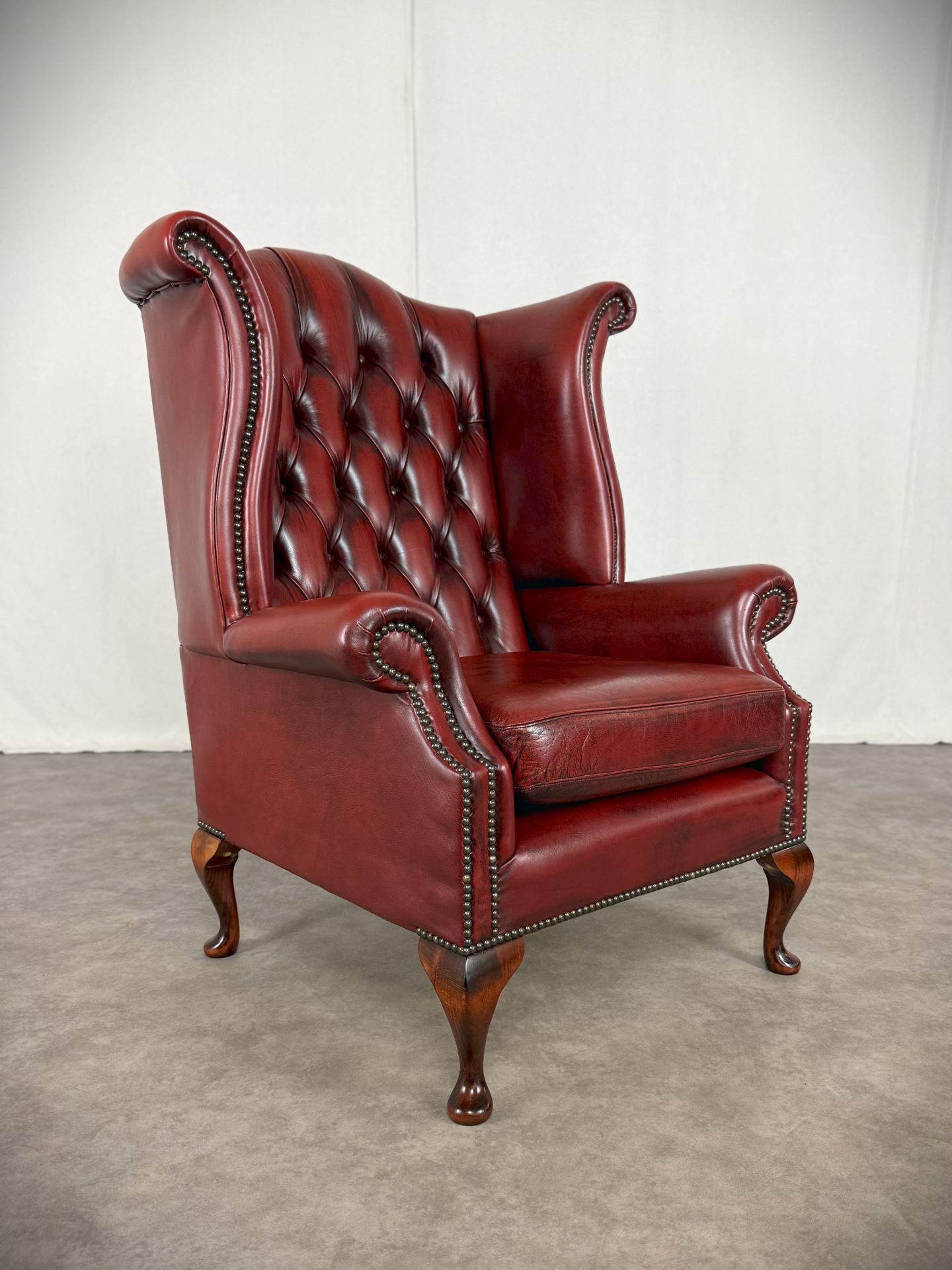 Die gepolsterteten Armlehnen und der hochwertige Oxblood-Rindleder Bezug sorgen für Komfort und eine lange Lebensdauer. Der Sessel ist mit dekorativen Nieten verziert und steht auf vier stabilen, schön geformten Holzfüßen. Ideal für stillvolle Wohnräume, Büros oder Bibliotheken.