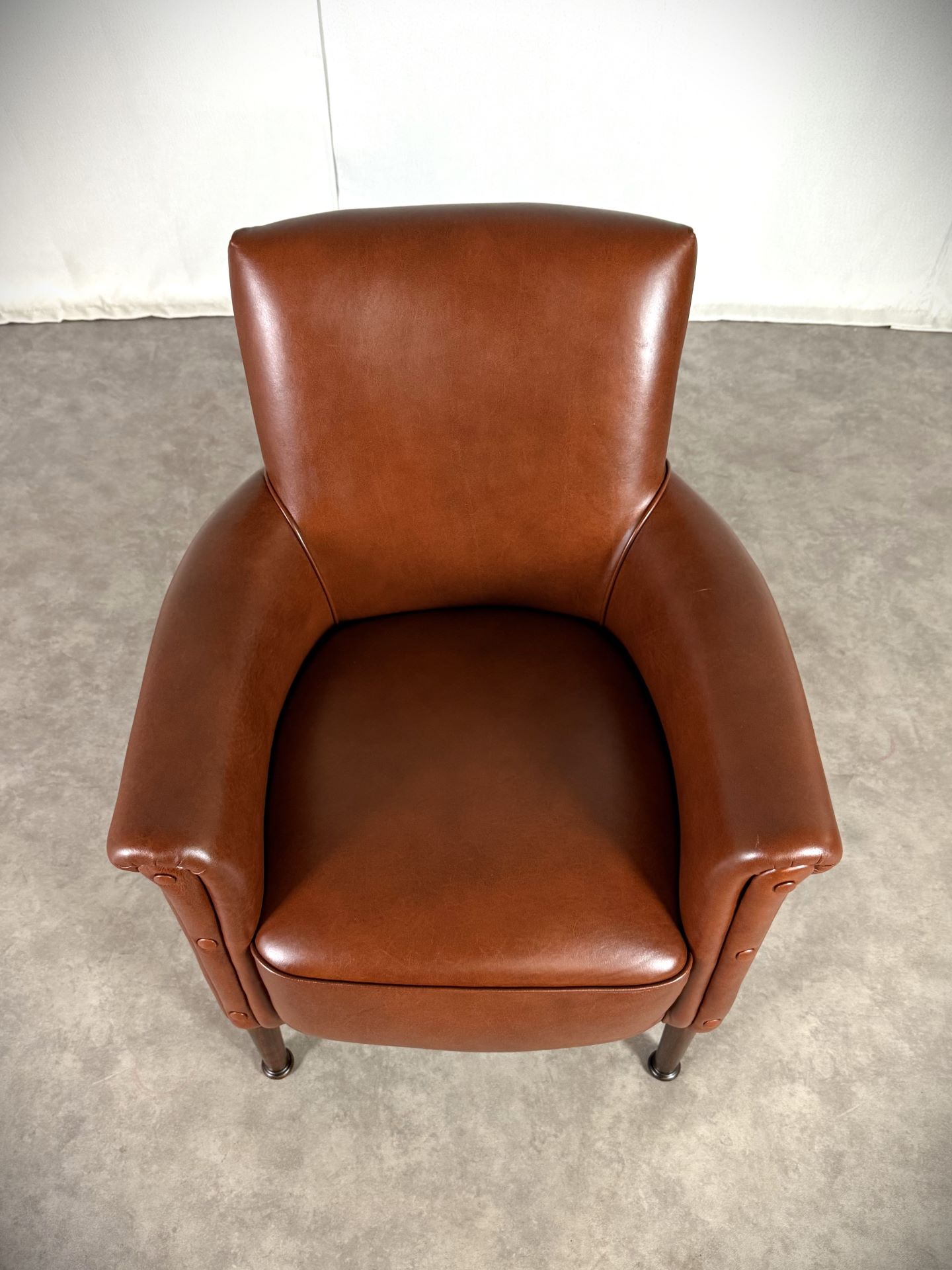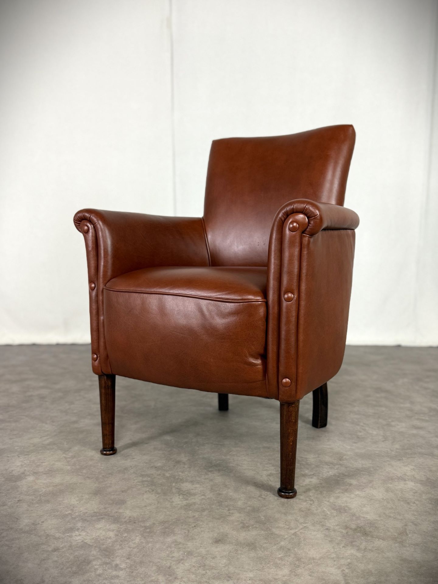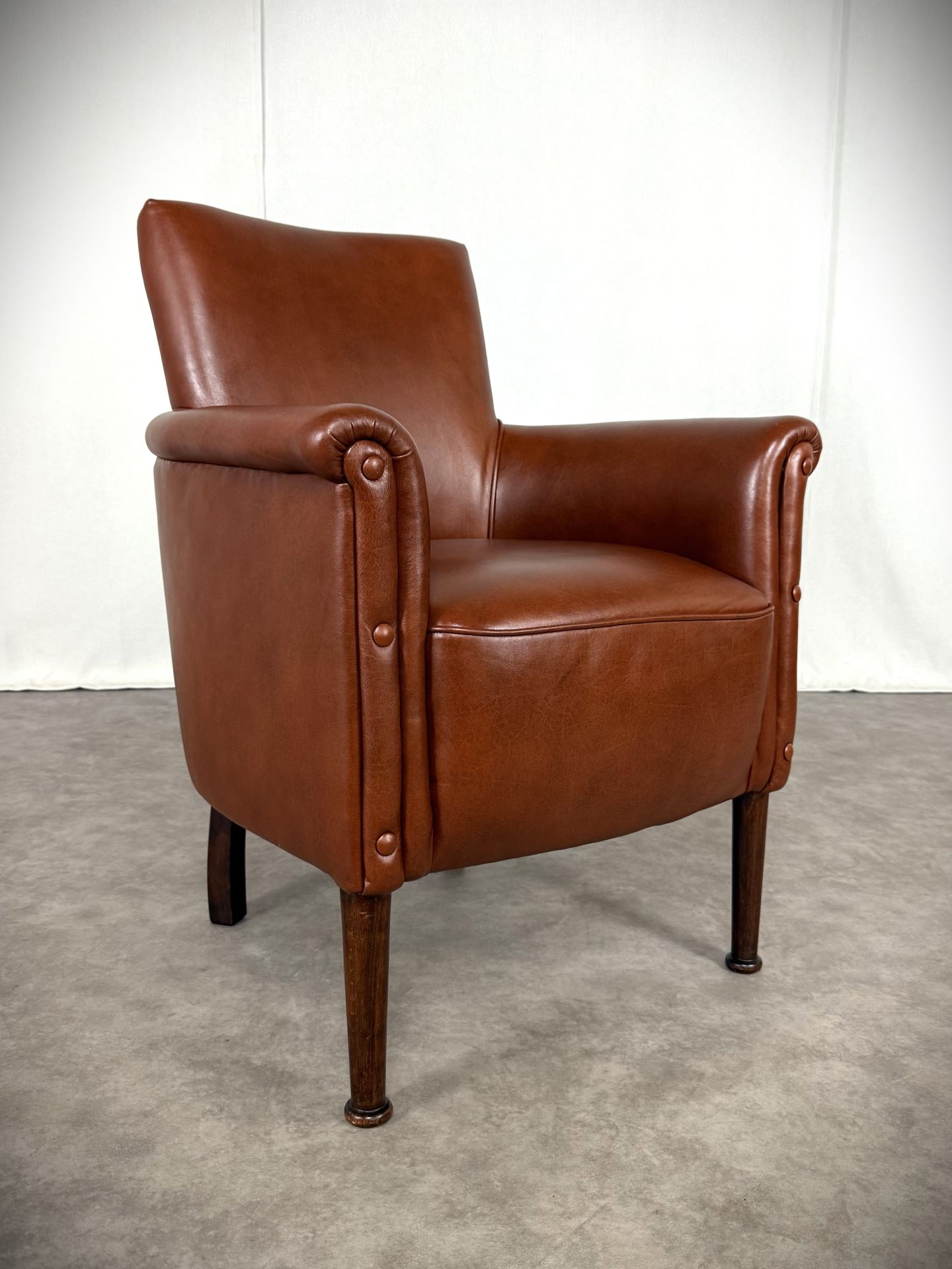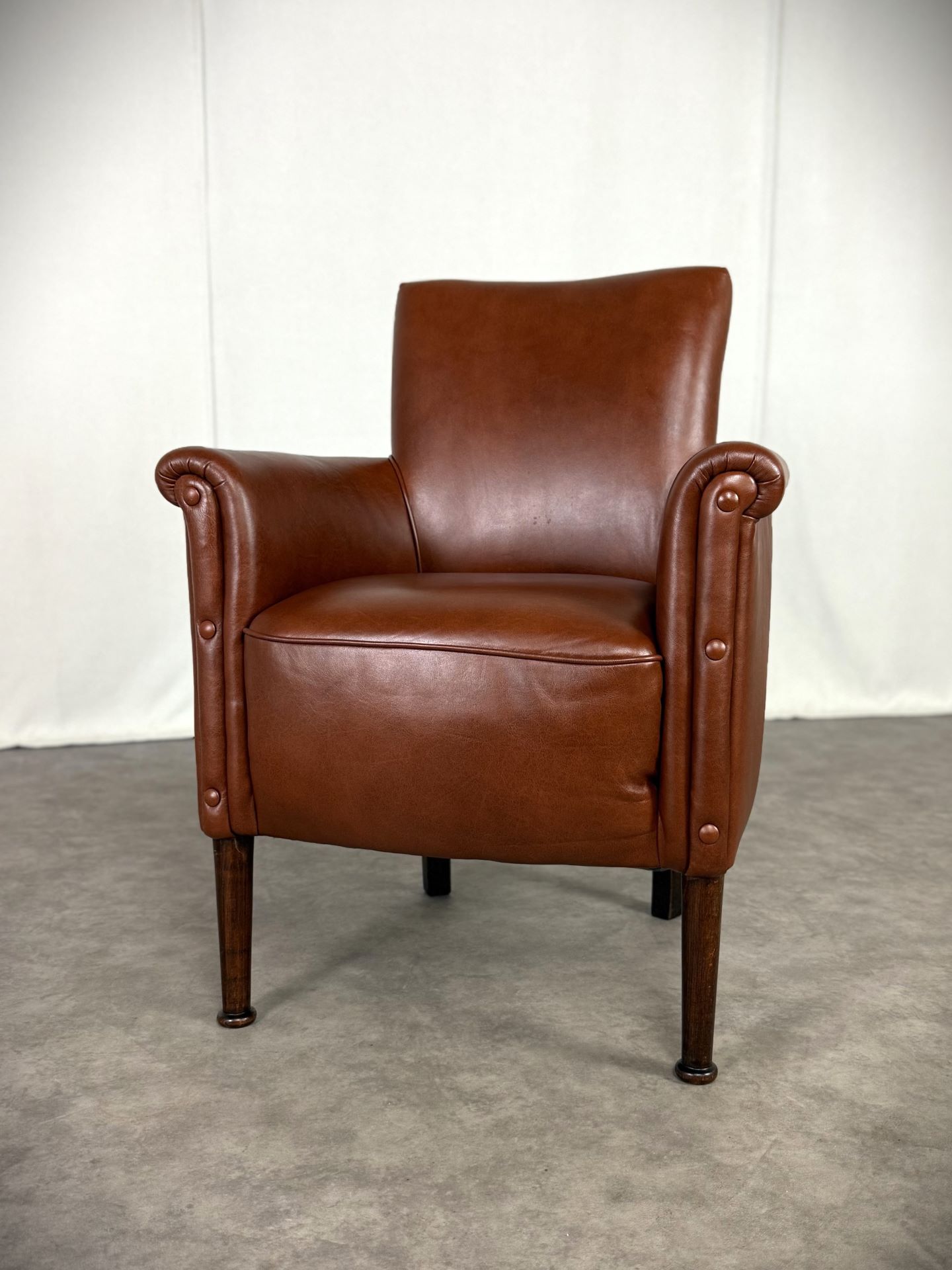 Zum Verkauf steht ein stilvoller Chesterfield „Highback“ Clubessel in edlem Cognacbraun. Der Sessel überzeugt durch seine klassische Form mit charakteristisch gerollten Armlehnen, eleganten Zierknöpfen und hochwertigem Echtlederbezug. Die hohen Holzfüße unterstreichen den traditionellen Look und sorgen gleichzeitig für Stabilität.