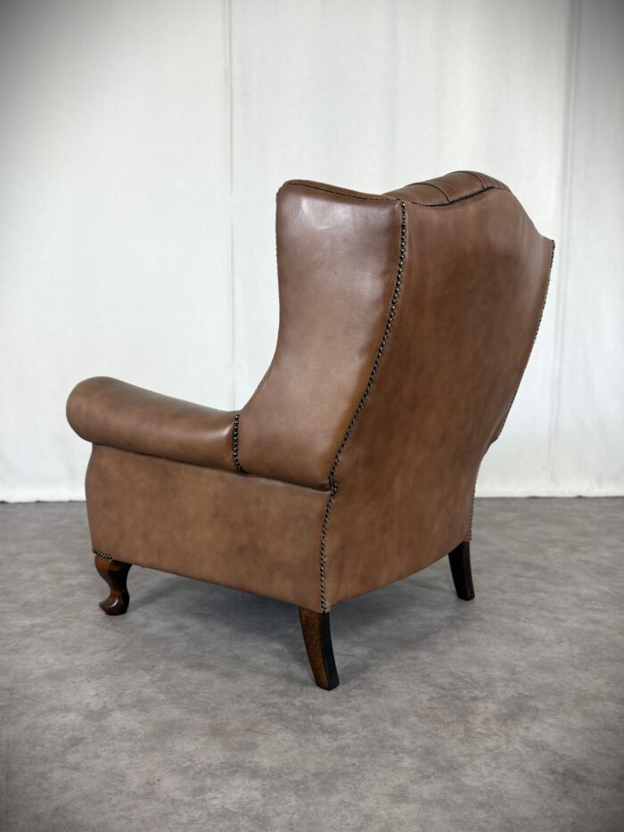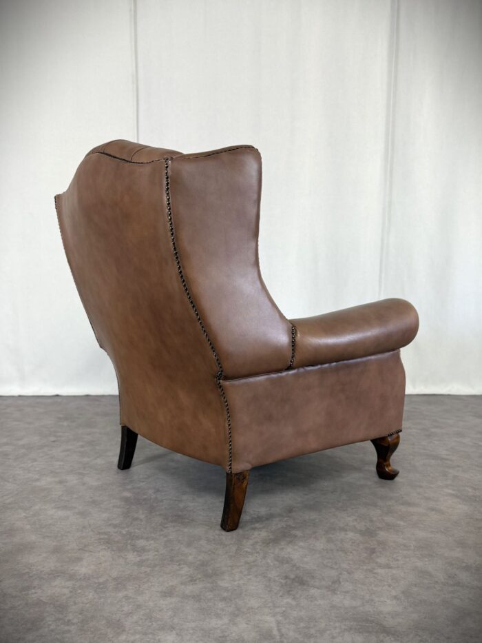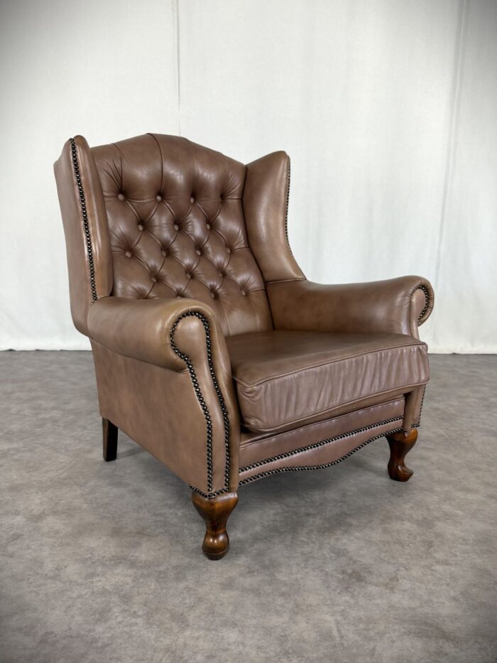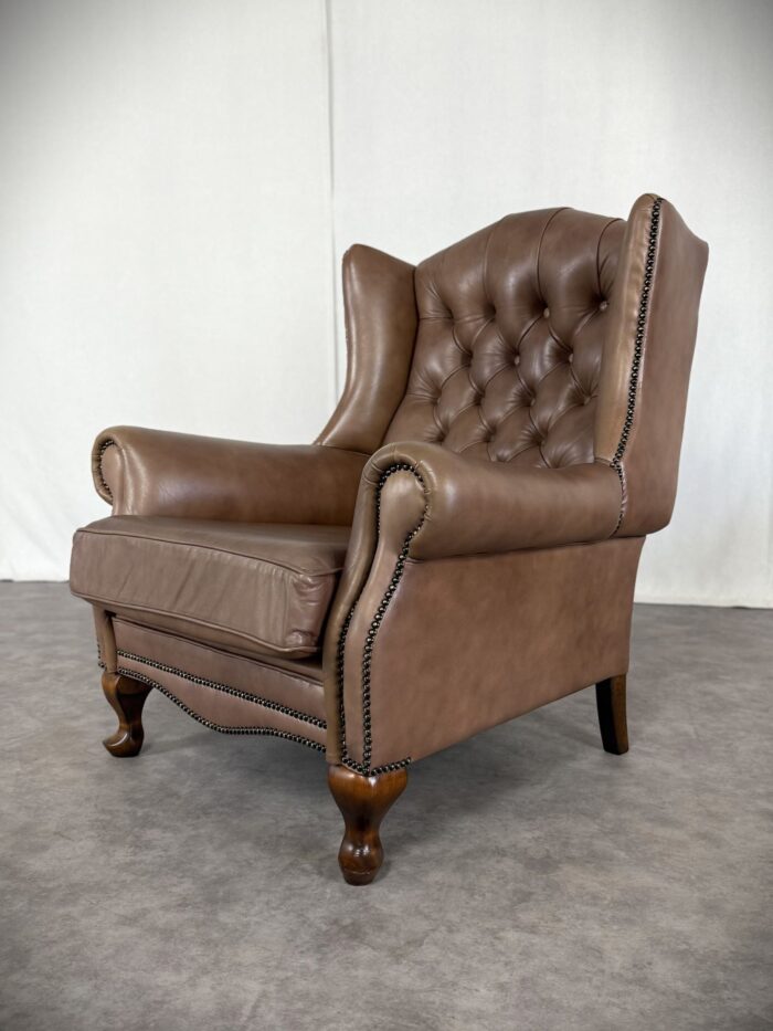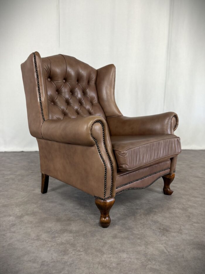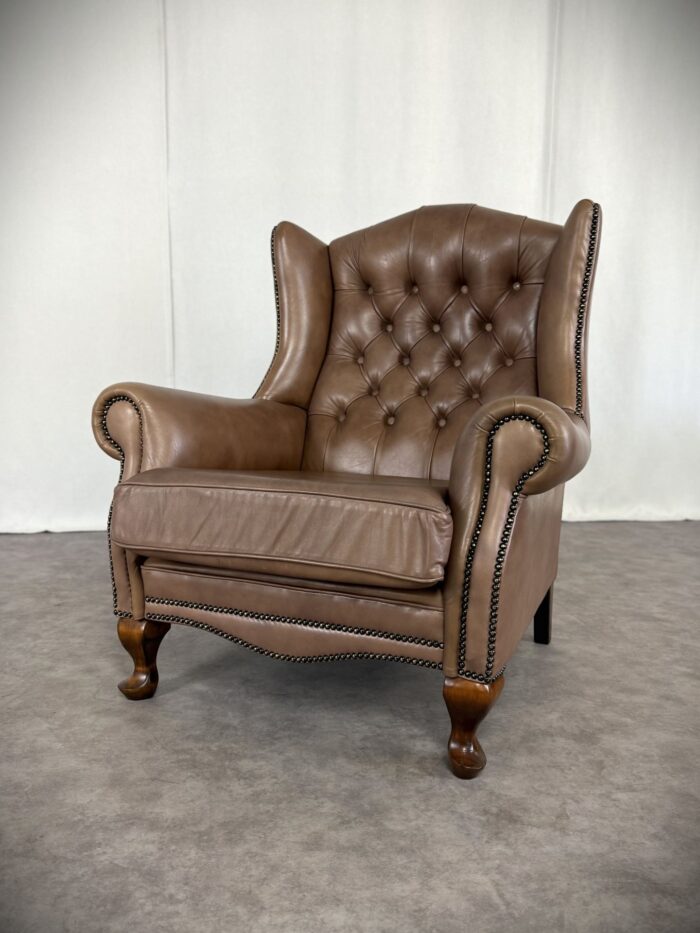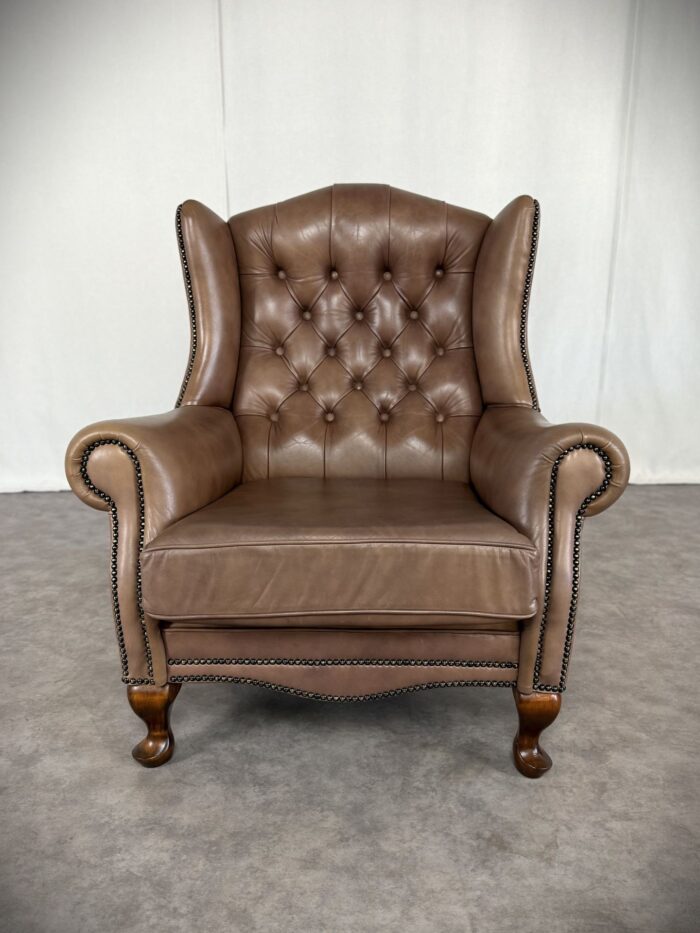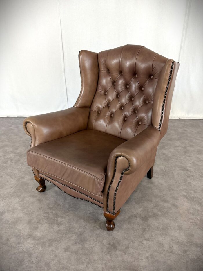 Der Sessel ist mit dekorativen Nieten verziert und steht auf stabilen Holzfüßen, die den klassischen Look abrunden. Ideal für stillvolle Wohnräume, Büros oder Bibliotheken.