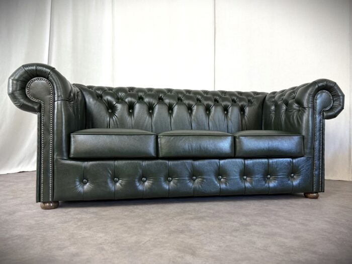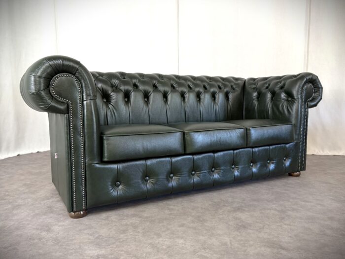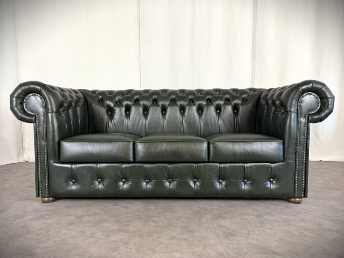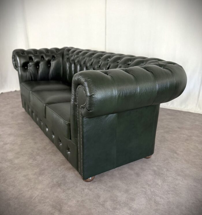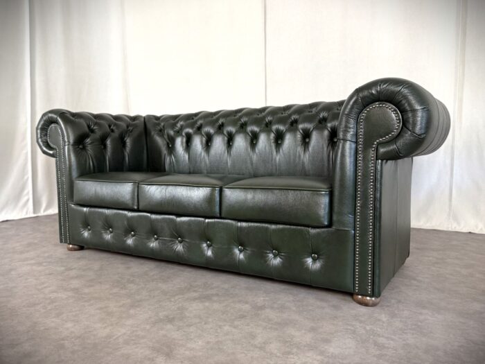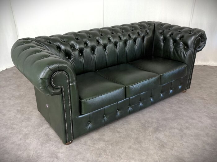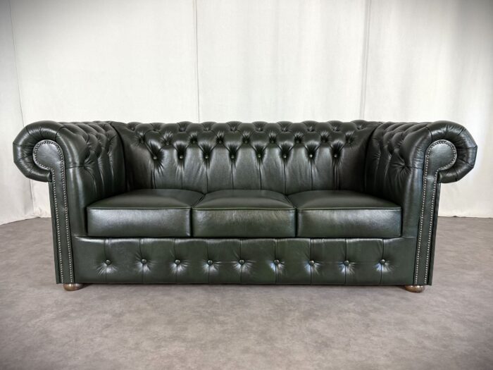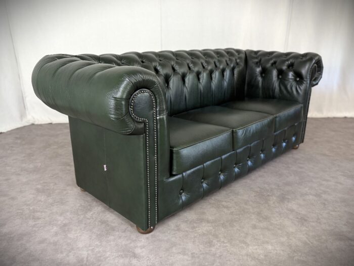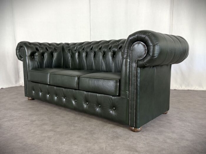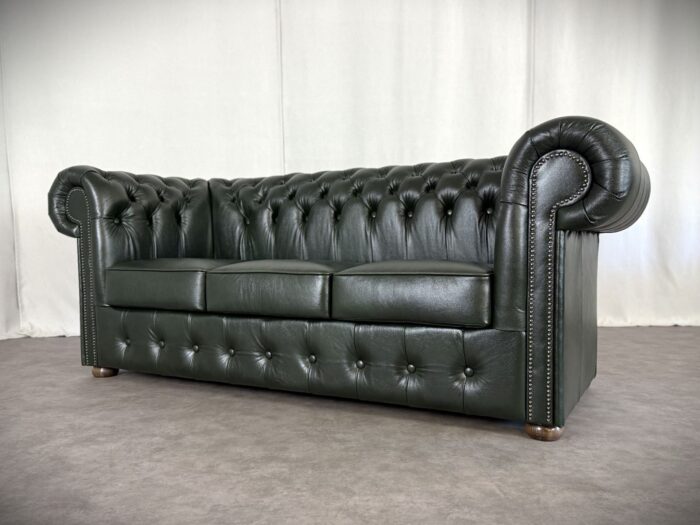 Zum Verkauf steht ein elegantes und klassisches Chesterfield Ledersofa. Dieses Original „Classic“ Design Dreisitzer Sofa überzeugt durch eine runde Rückenlehne und die charakteristische Knopfsteppung, die ihm zeitlose und luxuriöse Ausstrahlung verleiht. Die breit geschwungenen Armlehnen und der hochwertige Rindleder Bezug sorgen für Komfort und eine lange Lebensdauer. Das Sofa ist mit dekorativen Nieten verziert und steht auf runden, stabilen Holzfüßen die den klassischen Look abrunden. Ideal für stillvolle Wohnräume, Büros oder Bibliotheken.