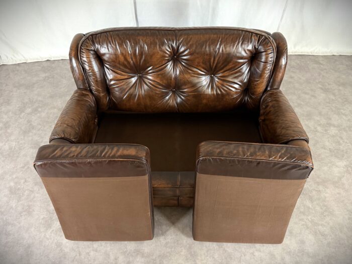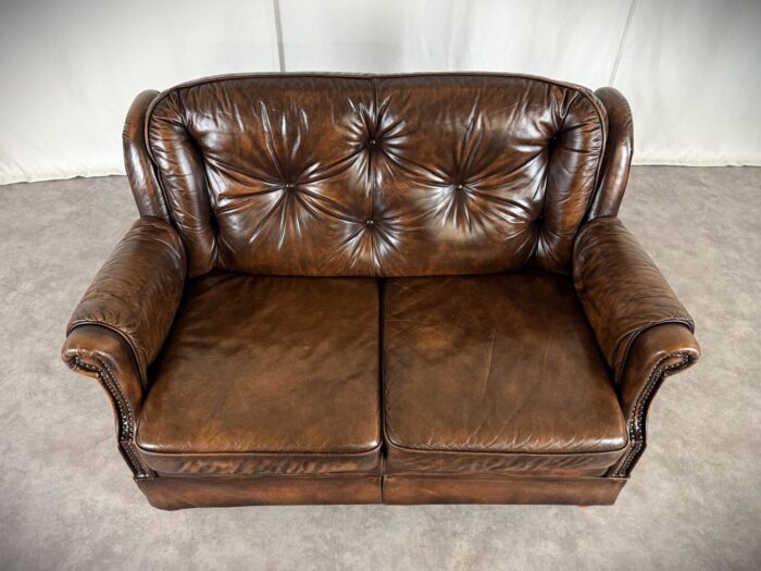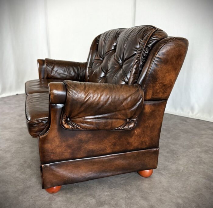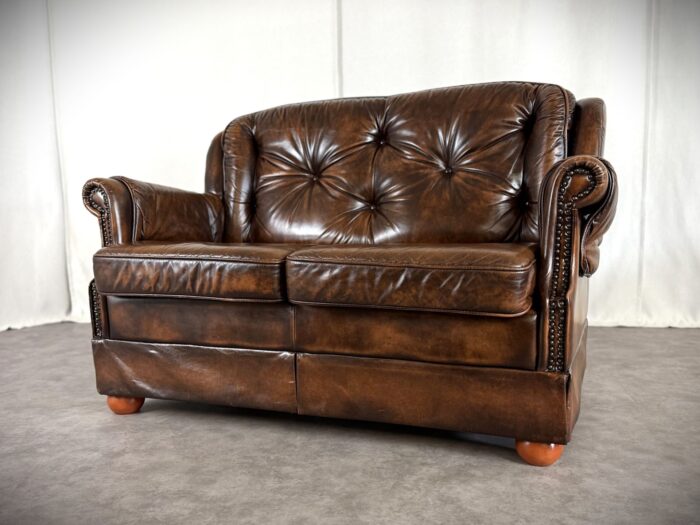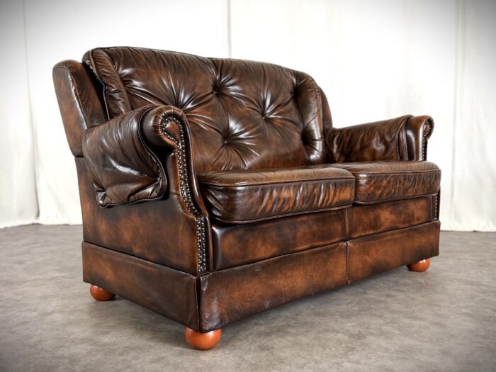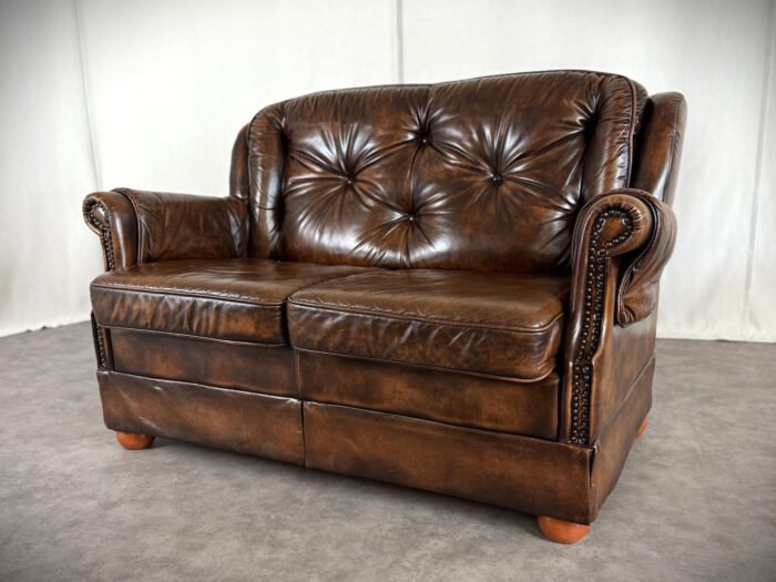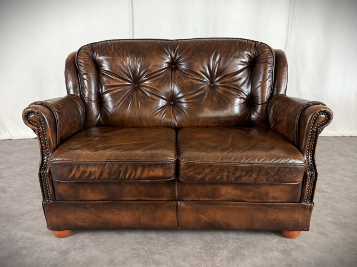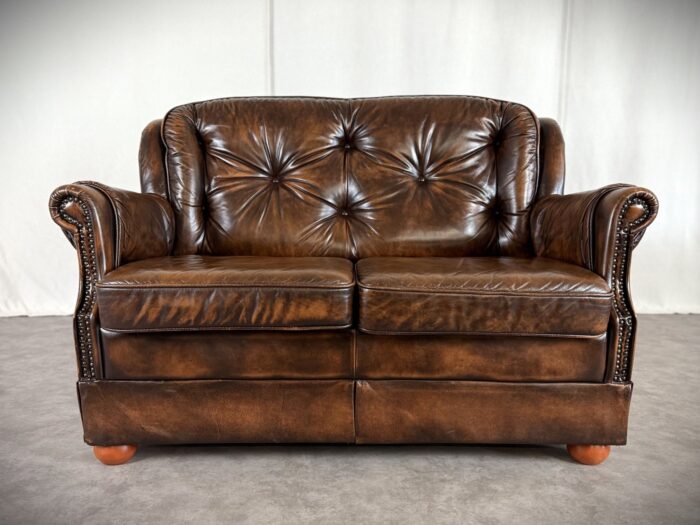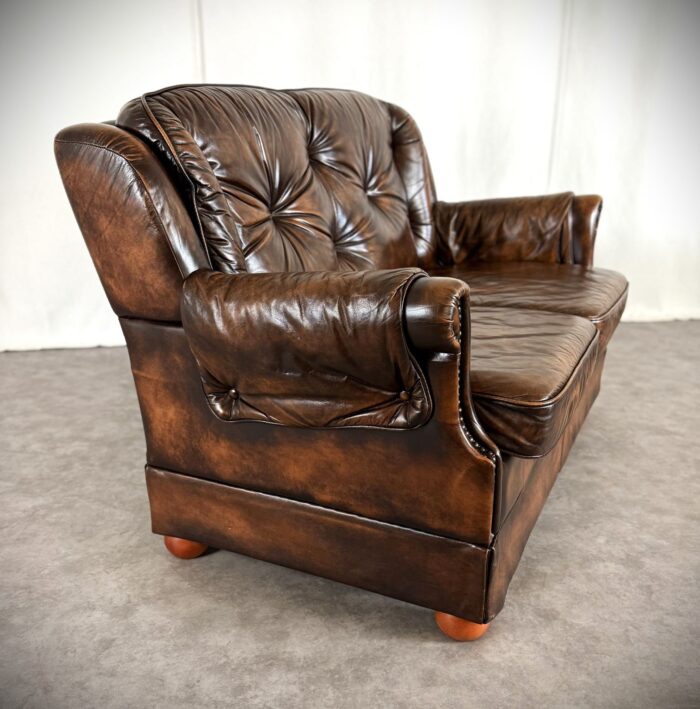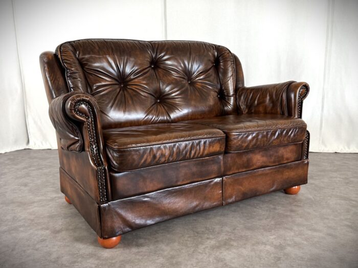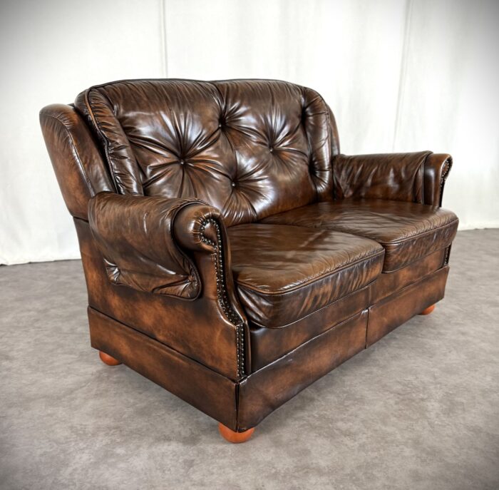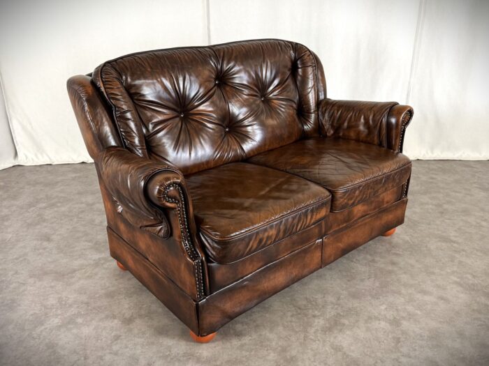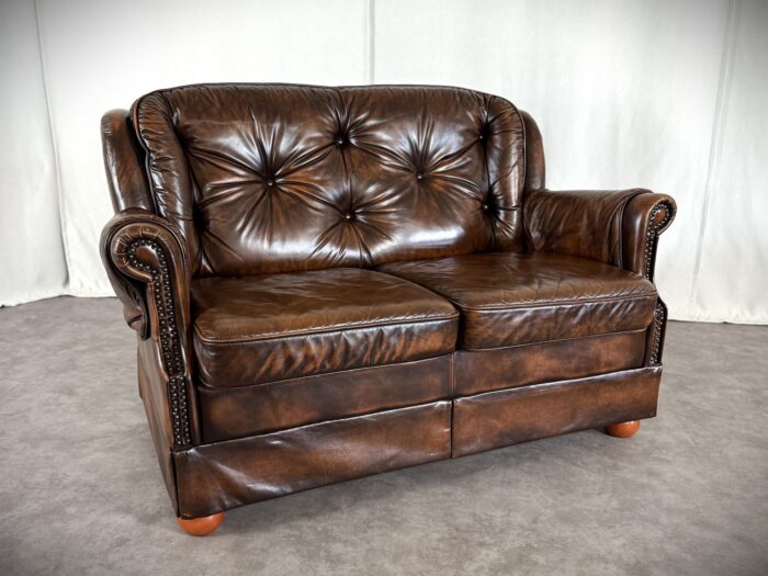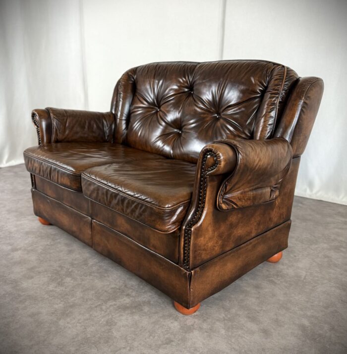 Erleben Sie zeitlose Eleganz mit diesem englischen Chesterfield Ledersofa. Eine Luxuriöse Zweisitzer „Country House“ Couch aus den 1960er Jahren, mit getuftetem Rindleder, Ziernägeln und einem massiven Echtholzgestell auf runden Holzfüßen.