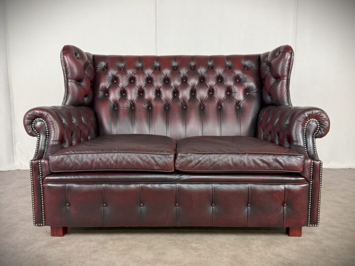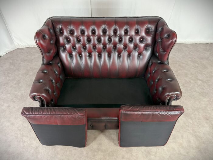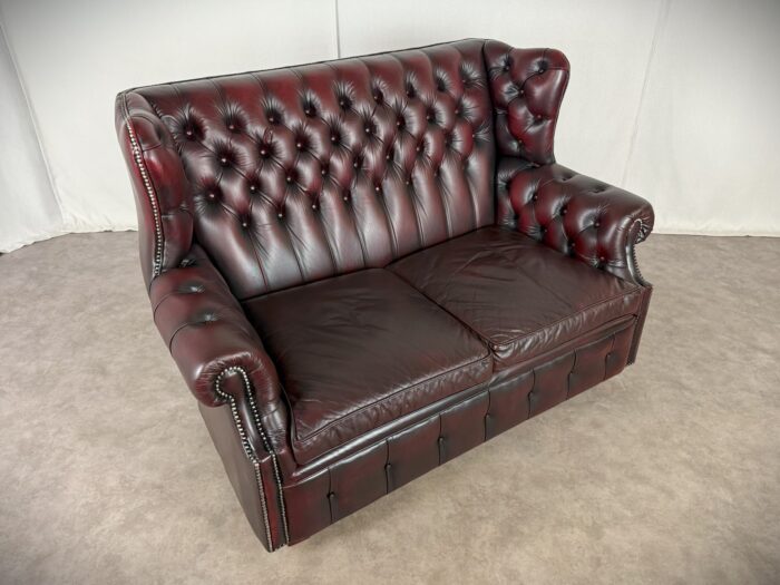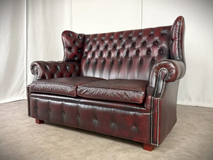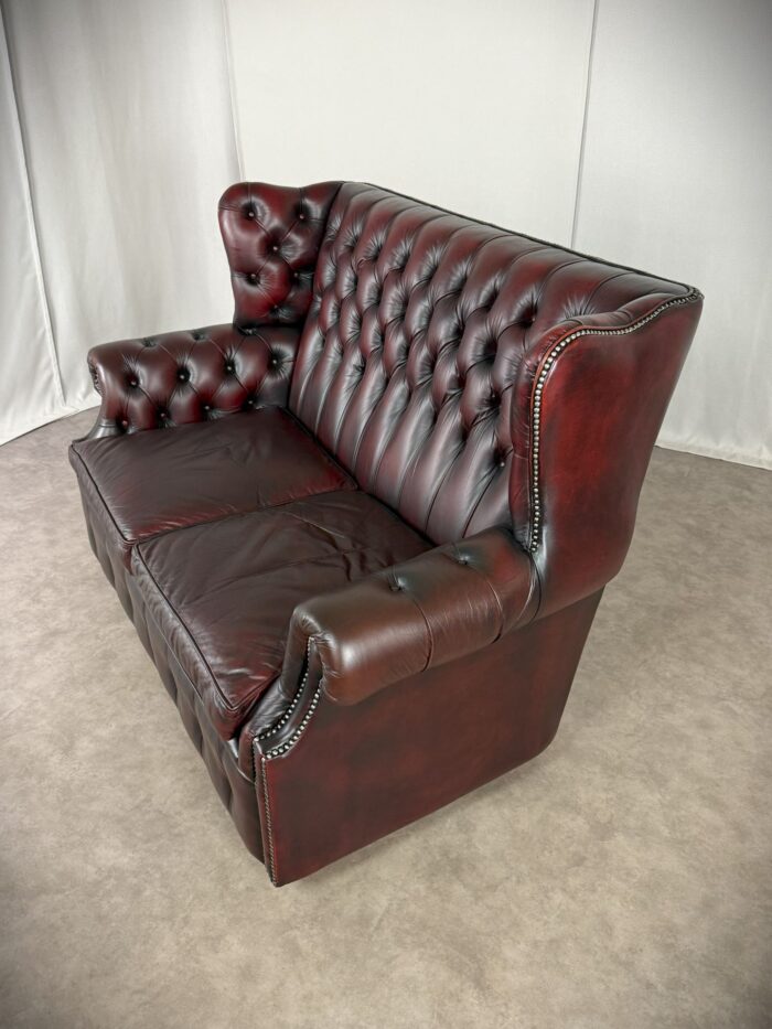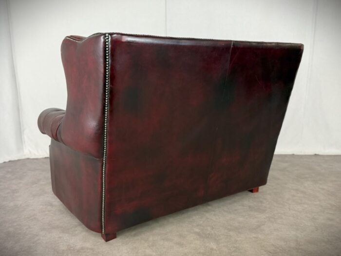 Die gepolsterteten Armlehnen und der hochwertige Oxblood-Rindleder Bezug sorgen für Komfort und eine lange Lebensdauer. Das Sofa ist mit dekorativen Nieten verziert und steht auf vier stabilen Holzfüßen. Ideal für stillvolle Wohnräume, Büros oder Bibliotheken.