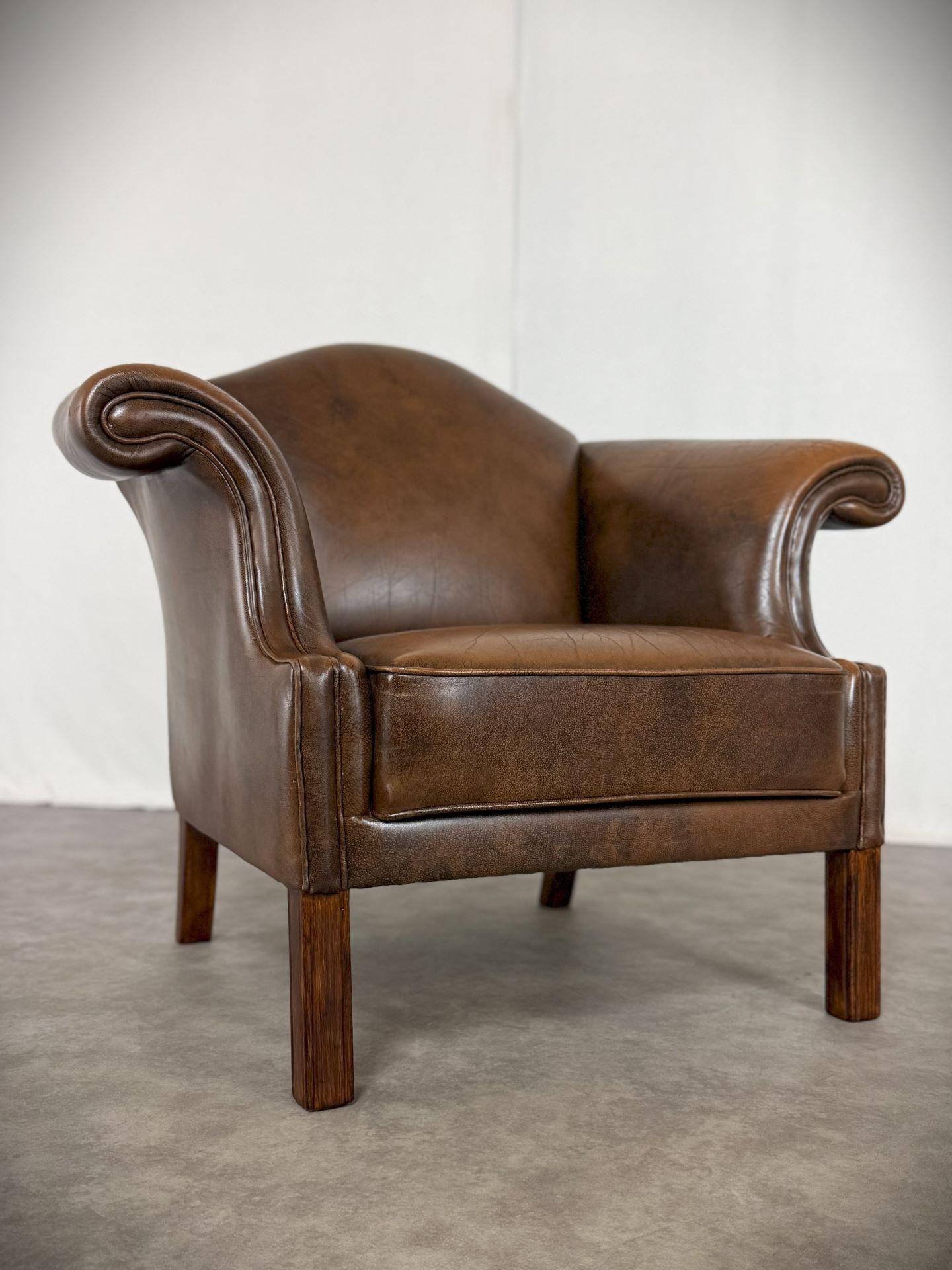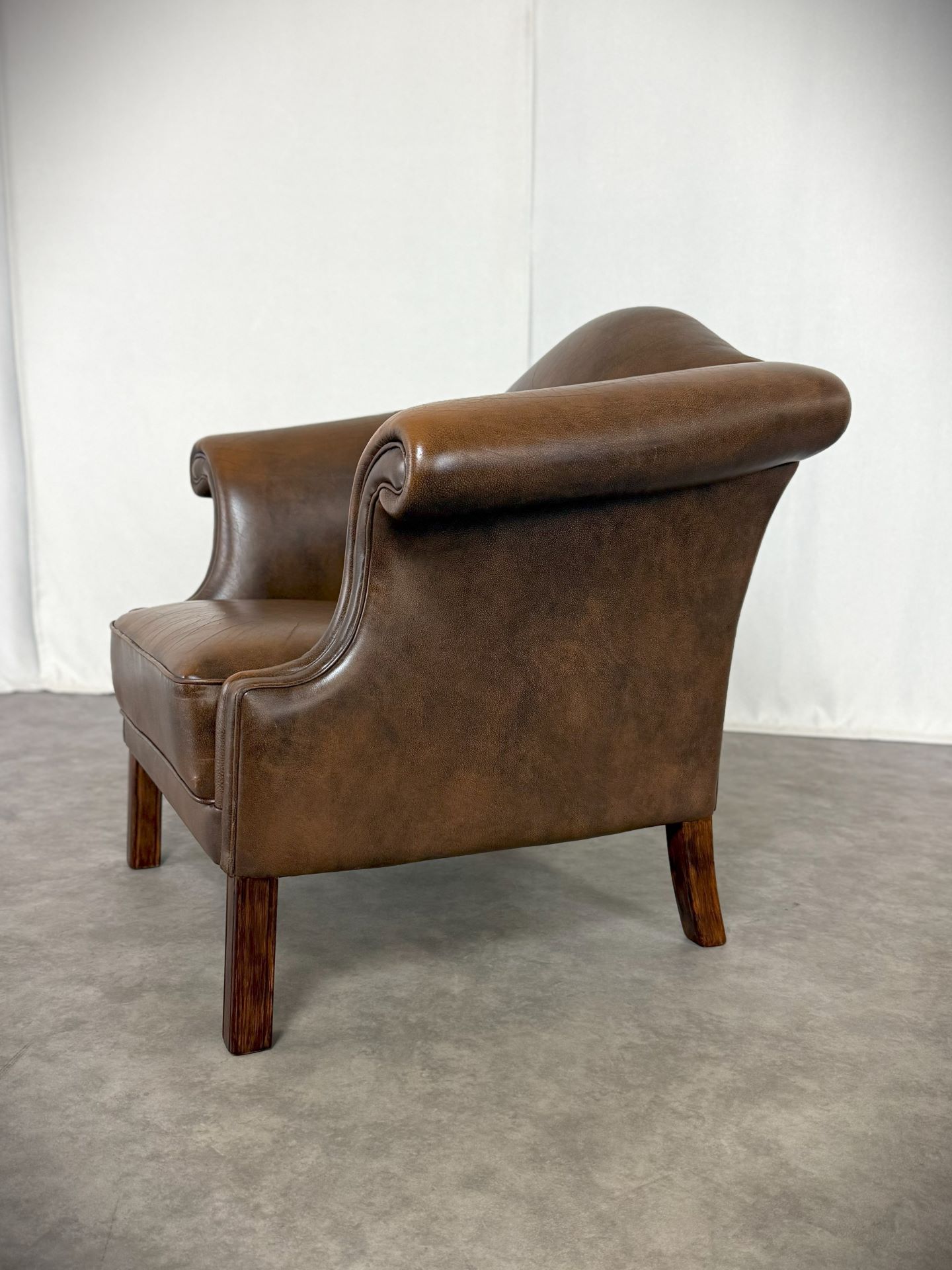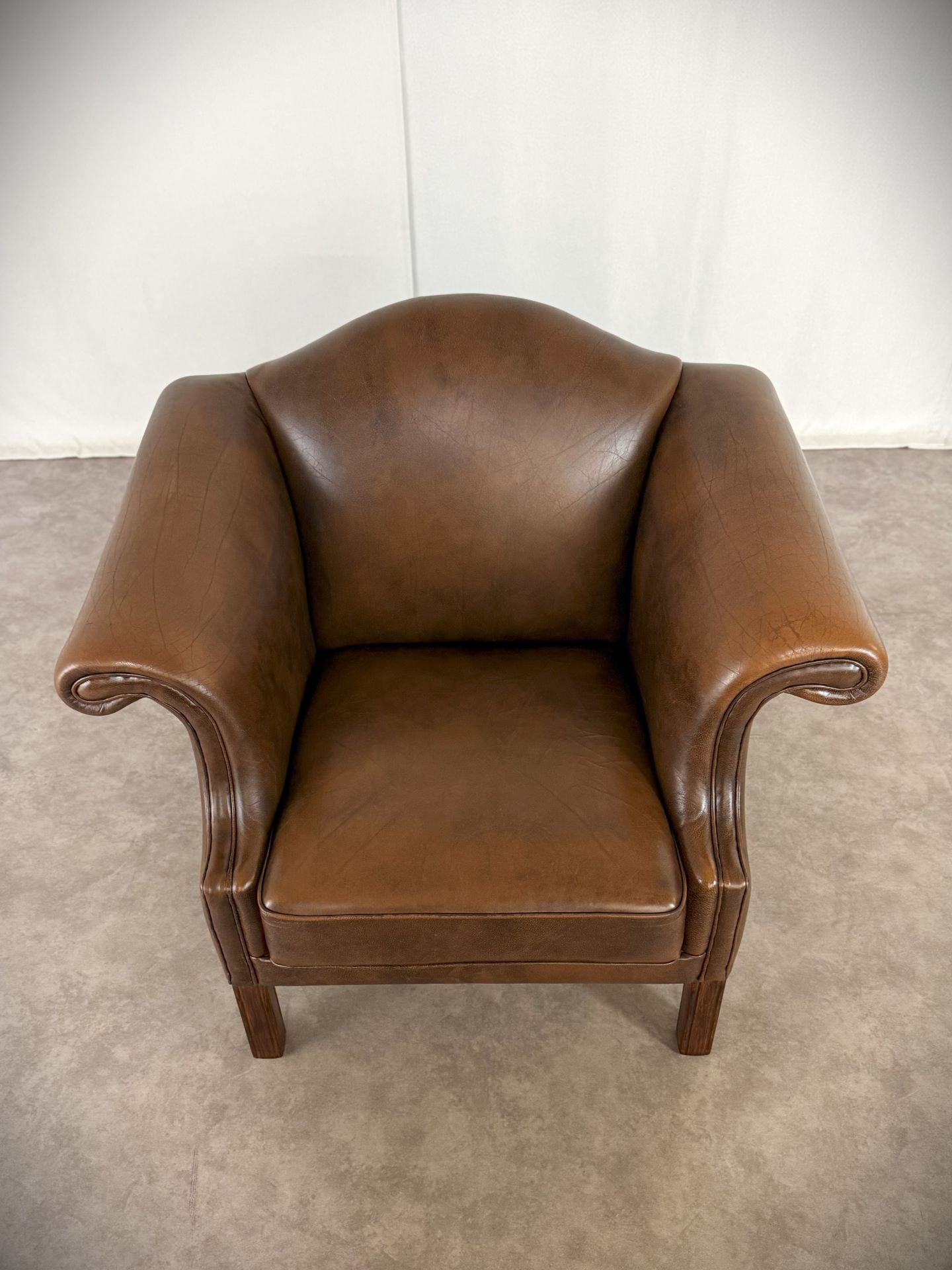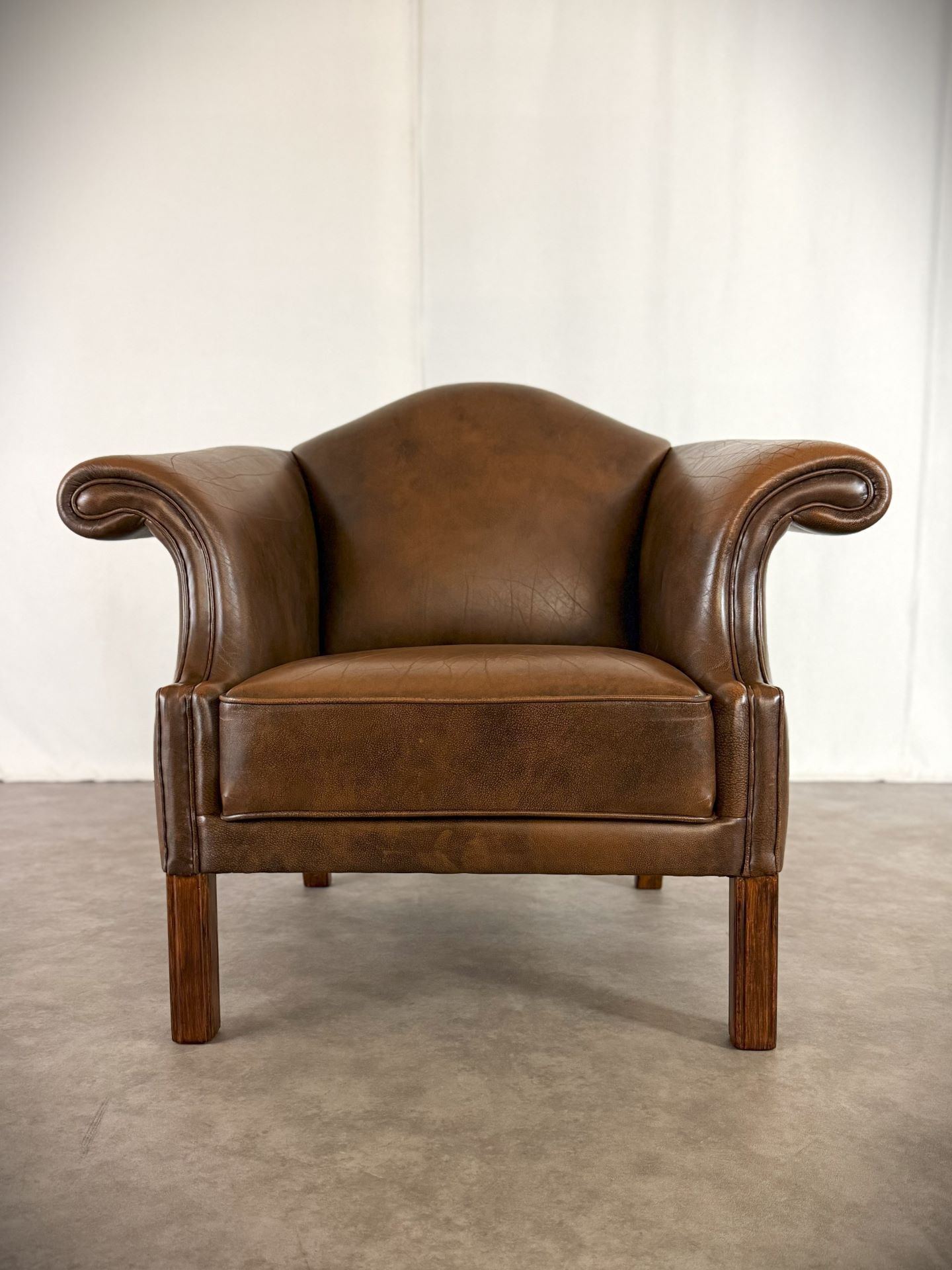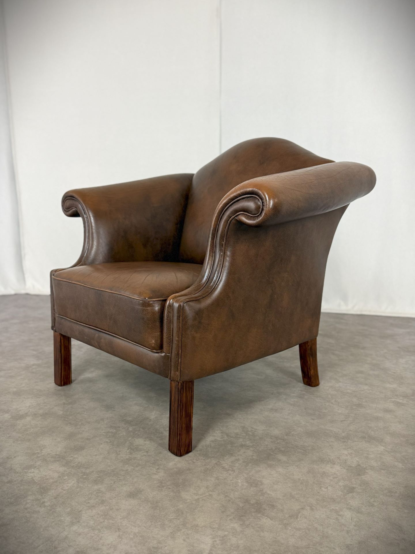 Der Sessel ist vollständig mit hochwertigem, handpatiniertem Rindsleder in einem warmen, tiefen Cognac-Braun bezogen. Das Leder hat im Laufe von über 70 Jahren eine wunderschöne, natürliche Patina entwickelt – tiefe Farbnuancen, leichte Craquelé-Strukturen und charakteristische Gebrauchsspuren, die jedem Kenner sofort die Authentizität und das Alter bestätigen.