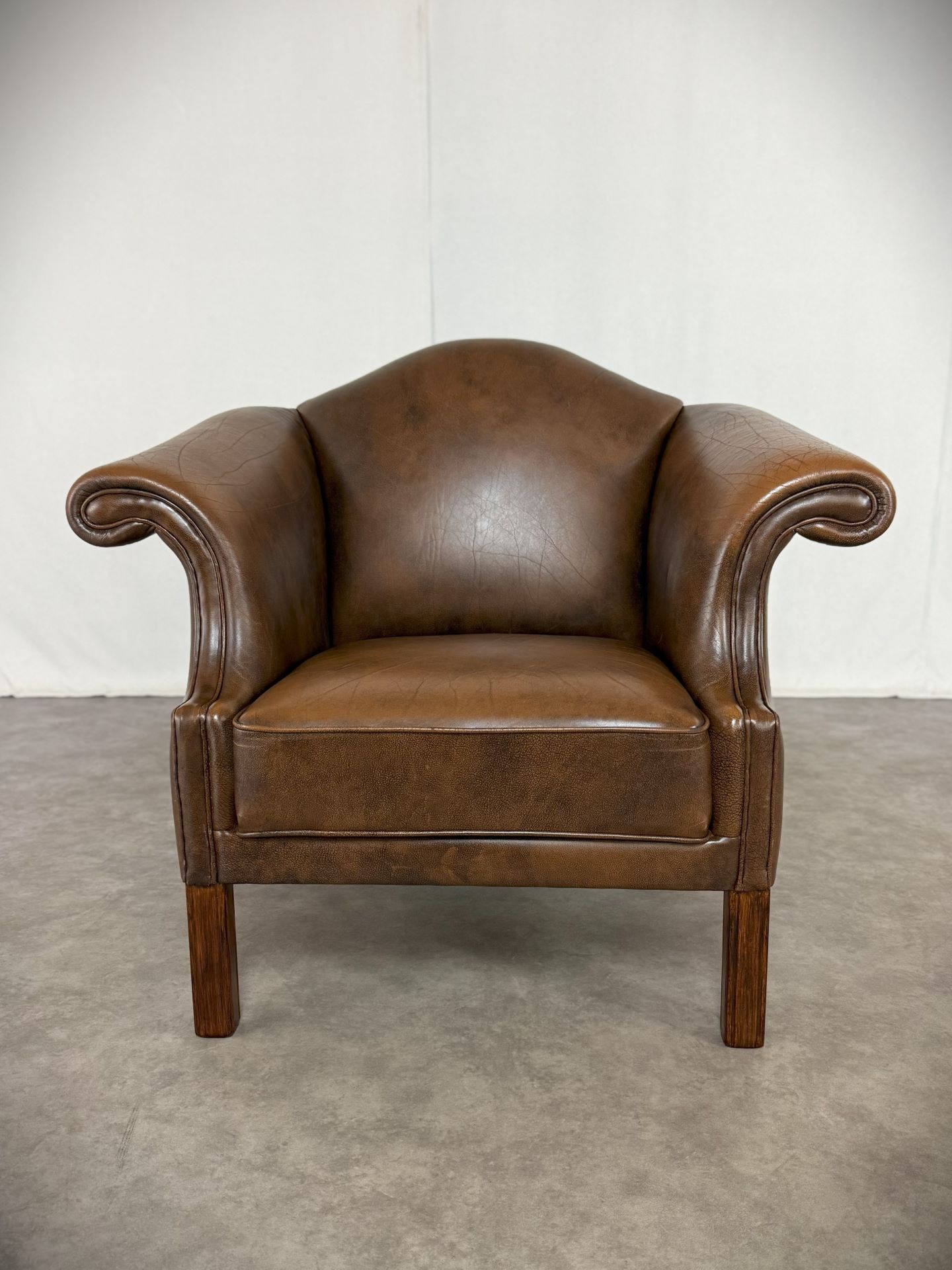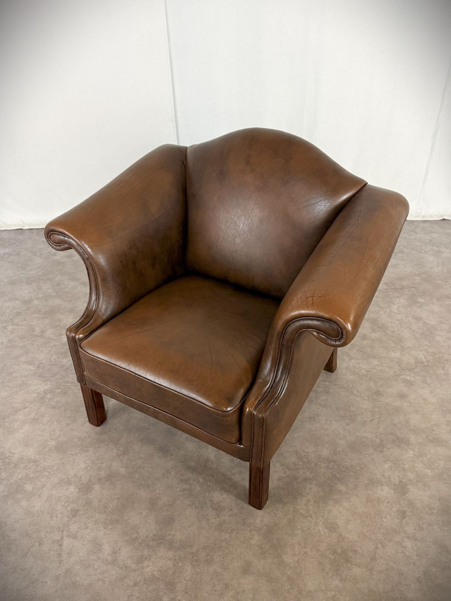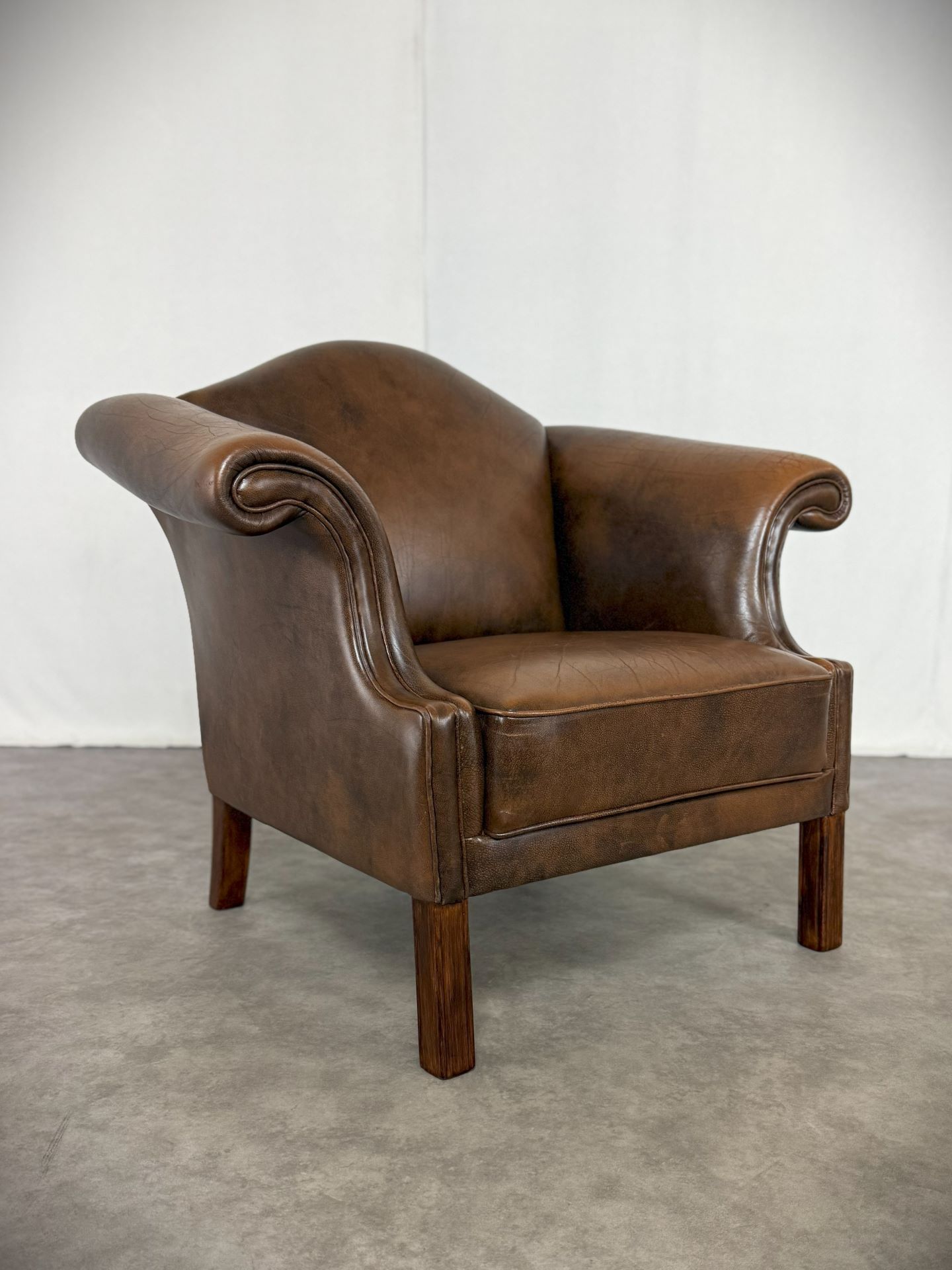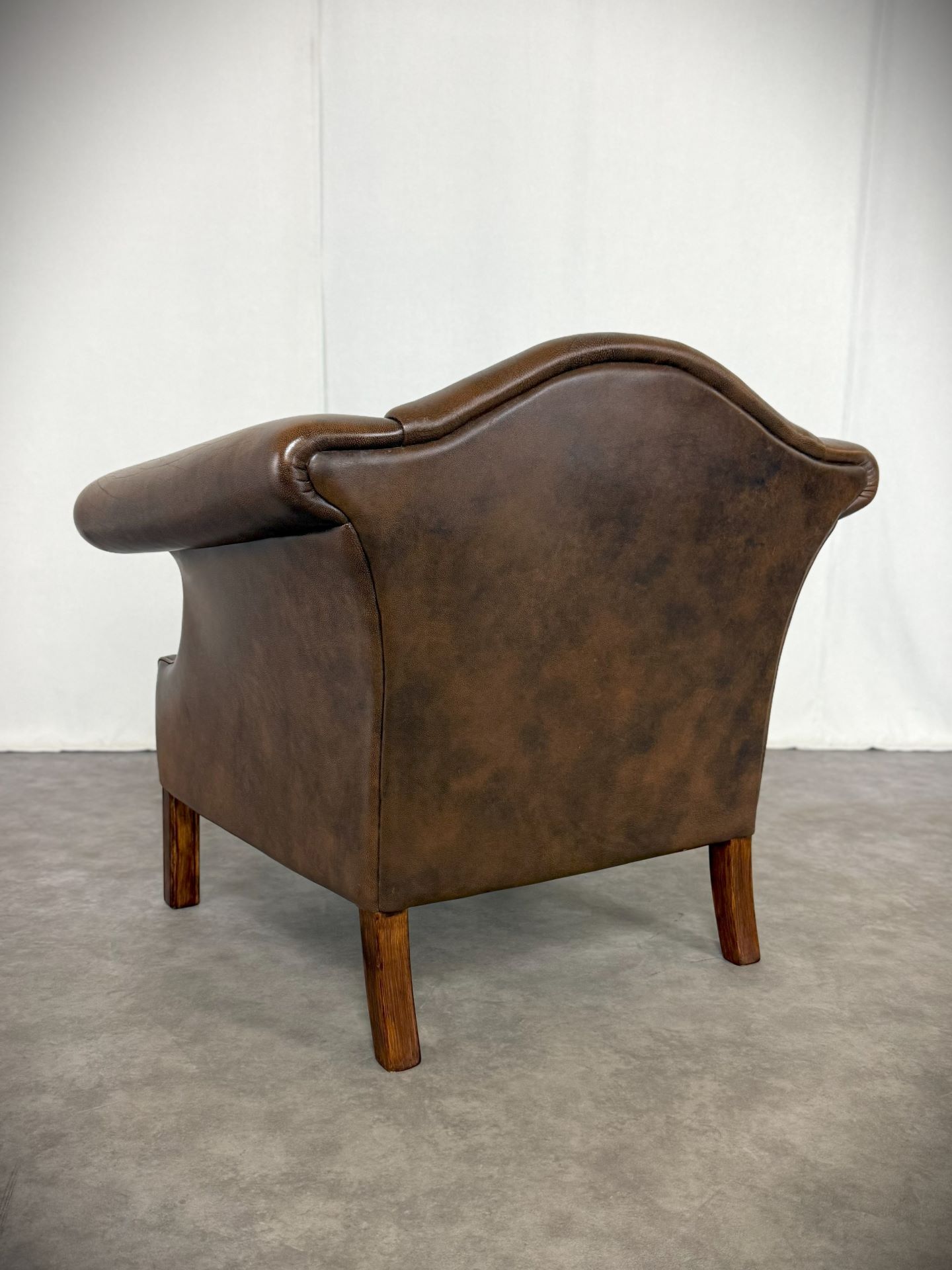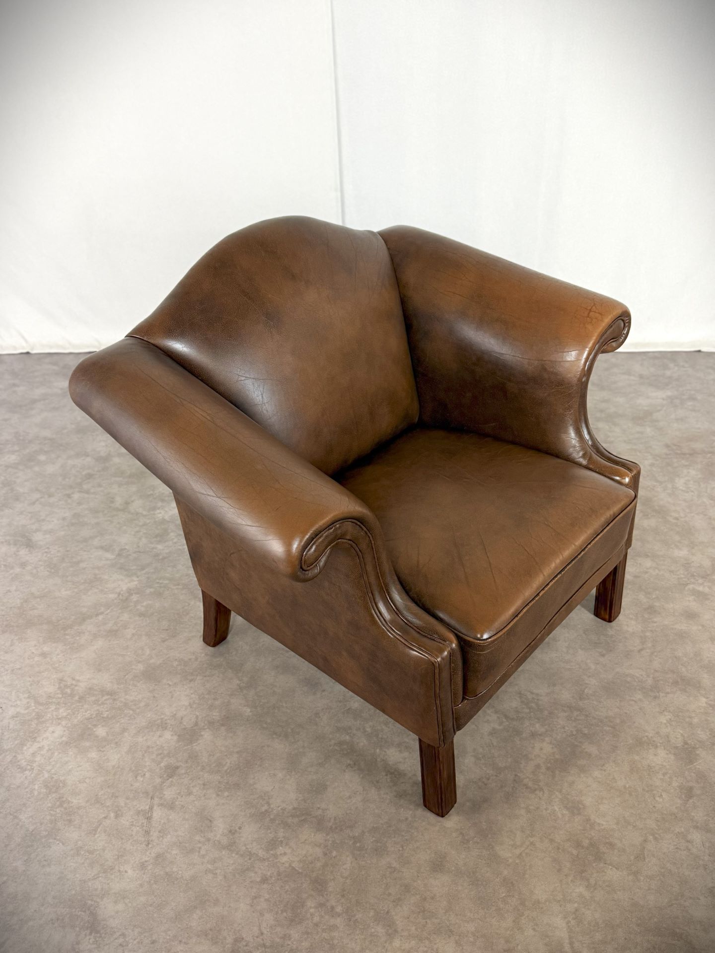 Der Sessel ist vollständig mit hochwertigem, handpatiniertem Rindsleder in einem warmen, tiefen Cognac-Braun bezogen. Das Leder hat im Laufe von über 70 Jahren eine wunderschöne, natürliche Patina entwickelt – tiefe Farbnuancen, leichte Craquelé-Strukturen und charakteristische Gebrauchsspuren, die jedem Kenner sofort die Authentizität und das Alter bestätigen.