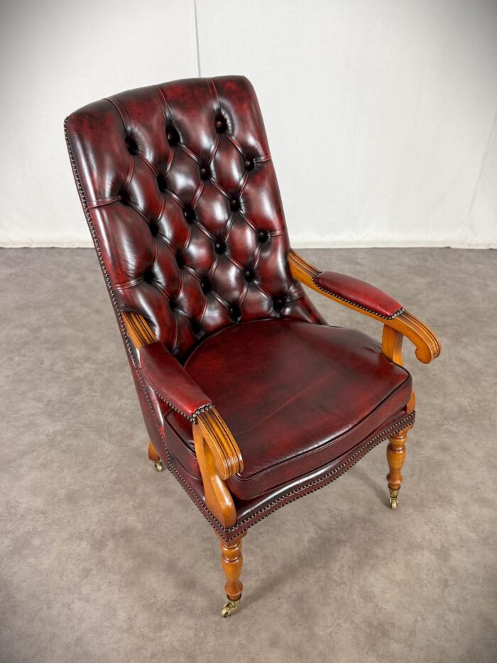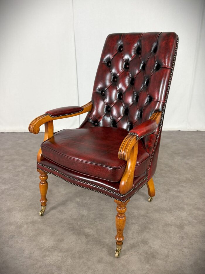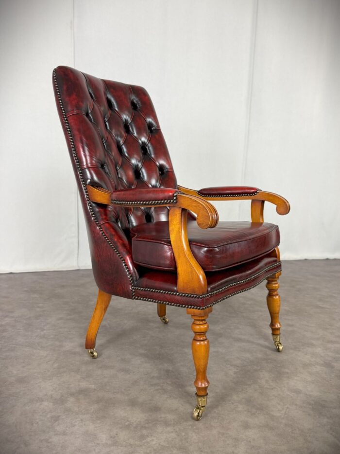Dieser originale Chesterfield Library Sessel in tiefem Oxblood-Rot verkörpert den klassischen englischen Vintage Stil. Das hochwertige Rindsleder zeigt jene charakteristische Tiefe und Wärme, die nur echte Vintage-Möbel besitzen.