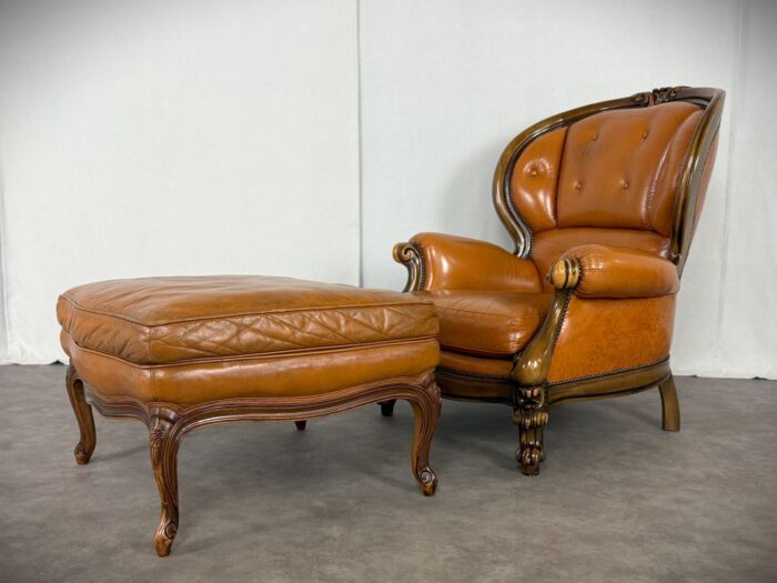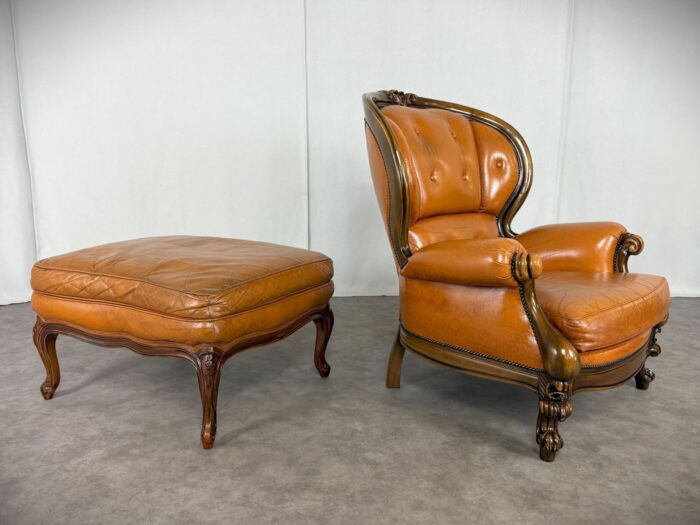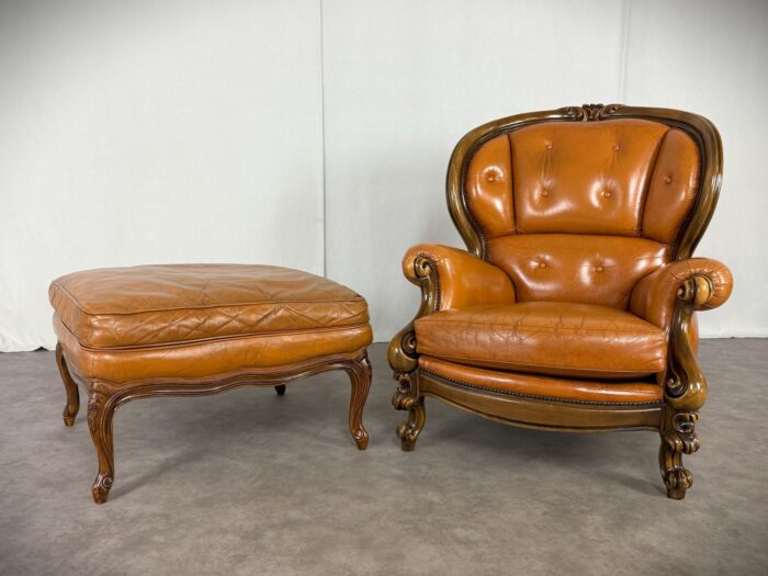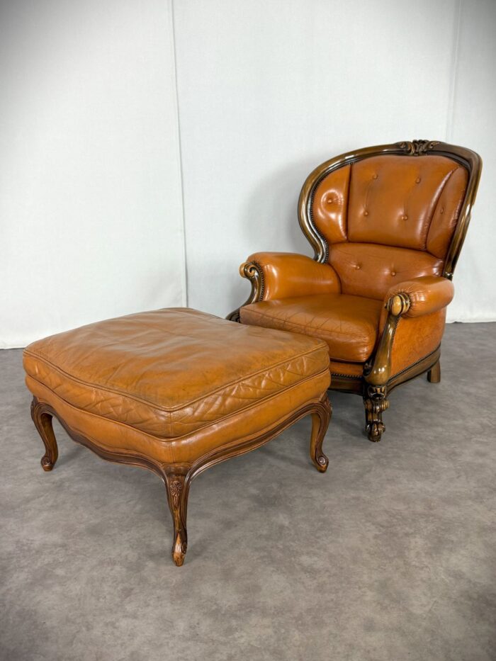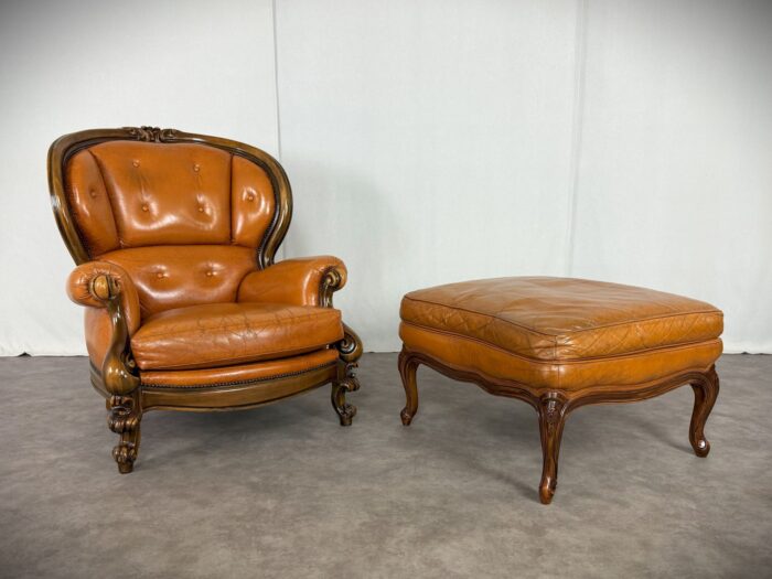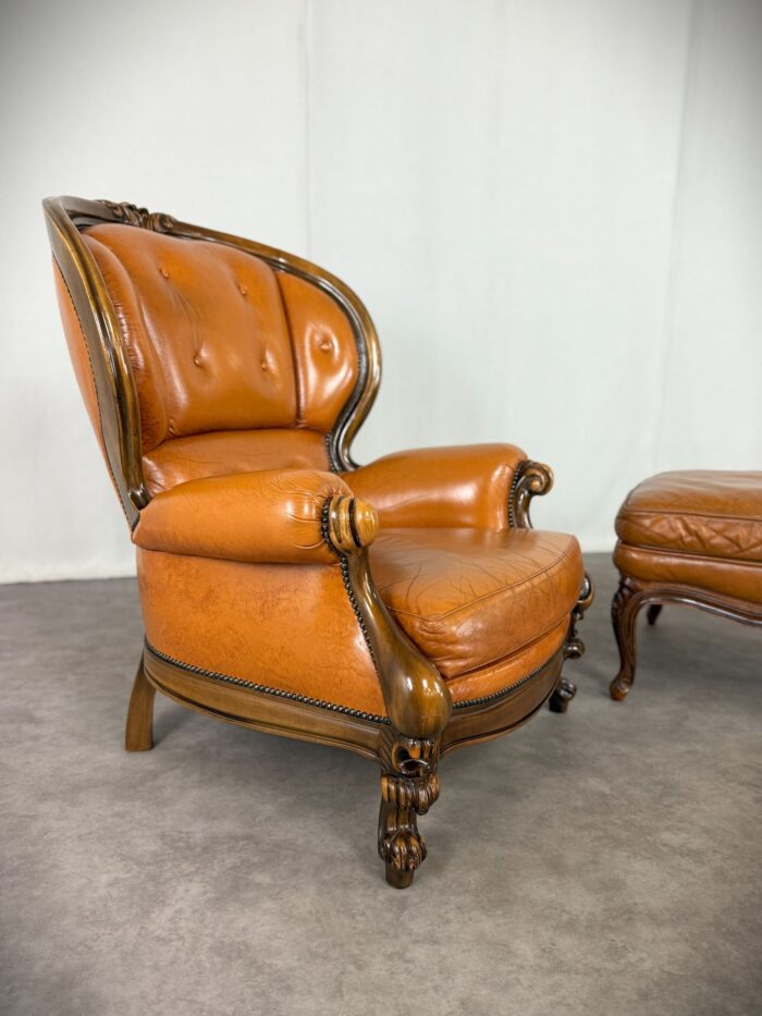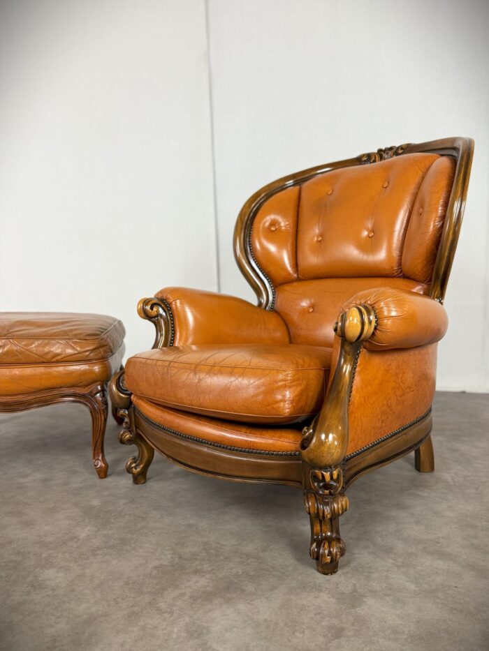 Erleben Sie zeitlose Eleganz mit diesem Chippendale Ledersessel inklusive großem Hocker von 1970. Eine Luxuriöses „Barock“ Design Set mit handgearbeitetem Rindleder und einem massiven Echtholzgestell in geschwungener Form auf handgearbeiteten, schön verzierten Holzfüßen. Dieses edle und zeitlose Klassik-Set bietet nicht nur unvergleichlichen Sitzkomfort, sondern verleiht Ihrem Wohnraum auch einen Hauch von Raffinesse. Der Sessel verfügt über breit gerundete Armlehnen und eine sehr gute Polsterung. Qualität die Sie sehen und fühlen können.