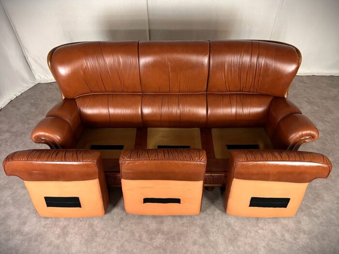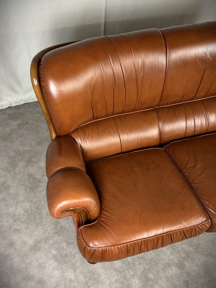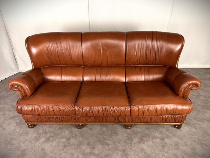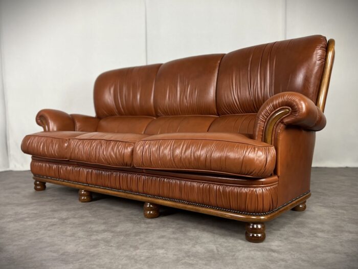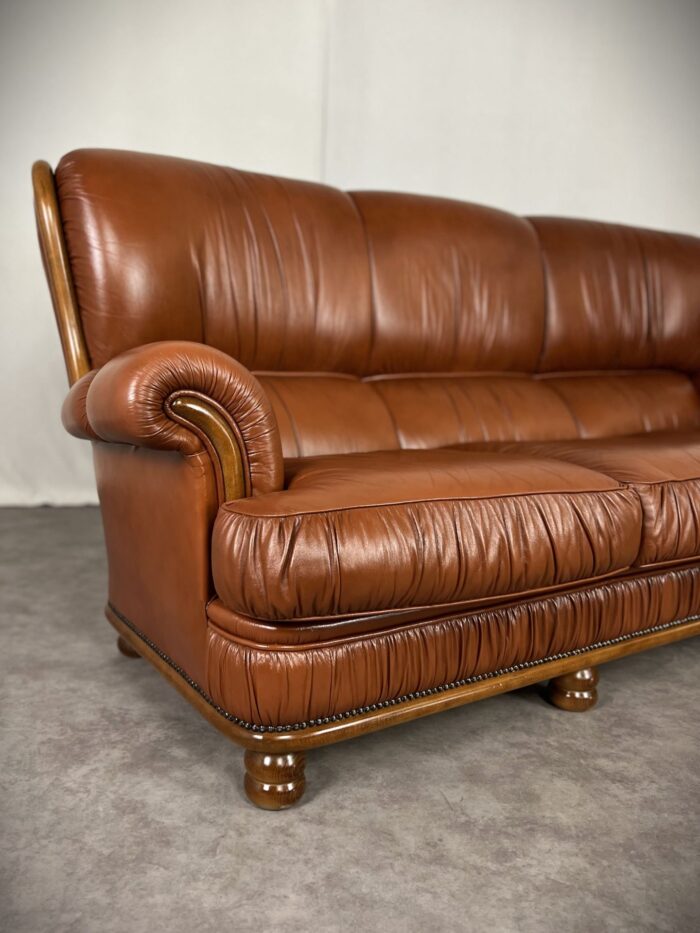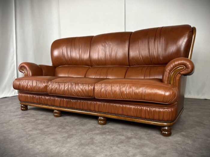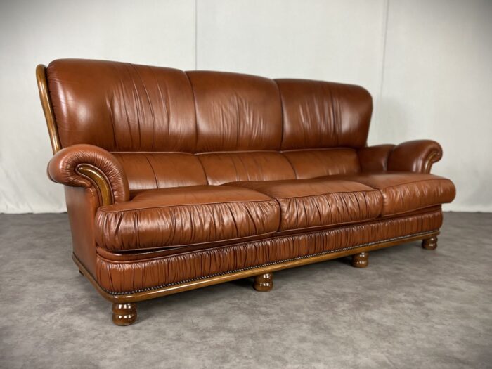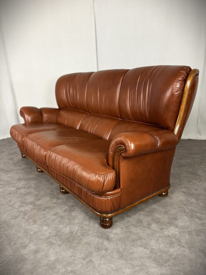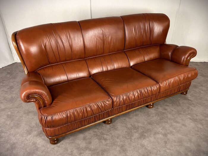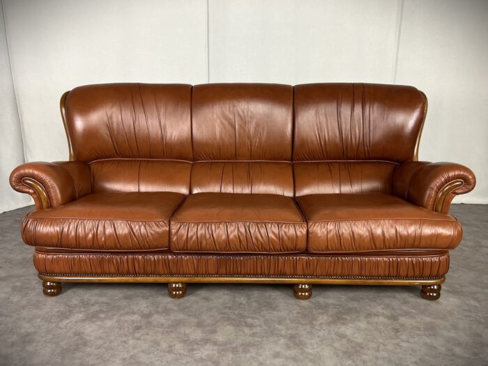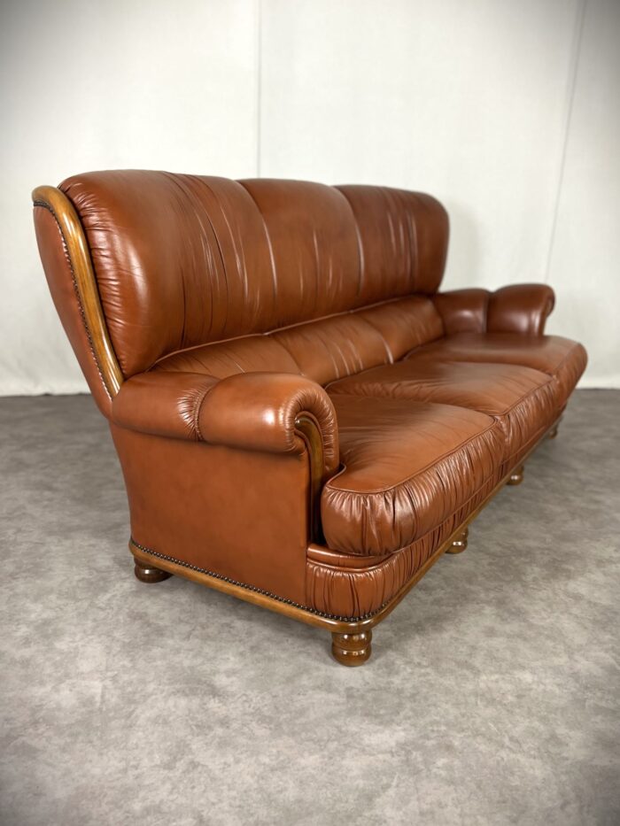 Erleben Sie zeitlose Eleganz mit diesem Chippendale Ledersofa von 1960. Eine Luxuriöse Dreisitzer „Barock“ Design Couch mit handgearbeitetem Rindleder und einem massiven Echtholzgestell in geschwungener Form auf Holzfüßen.