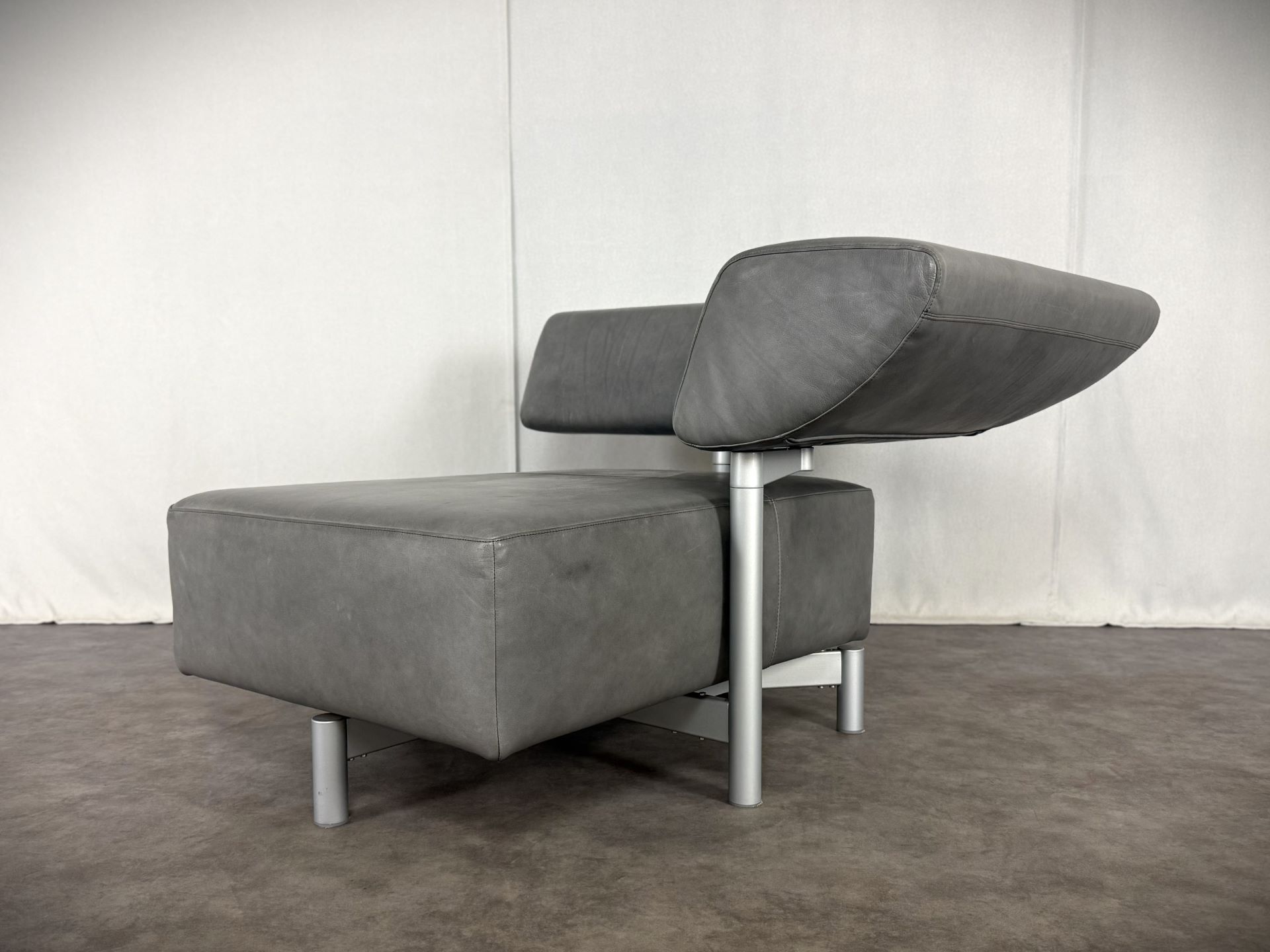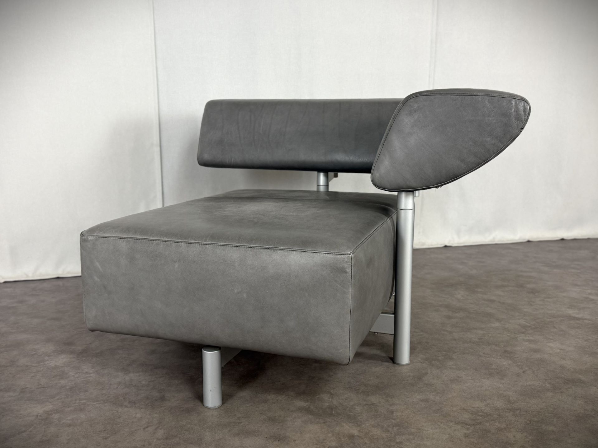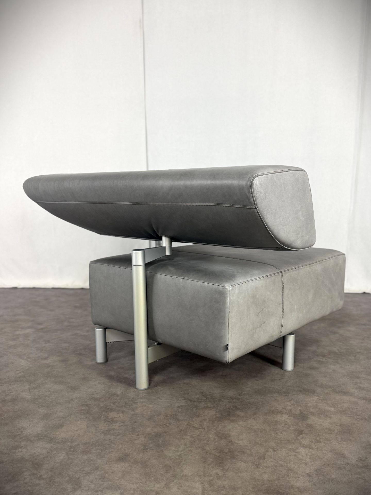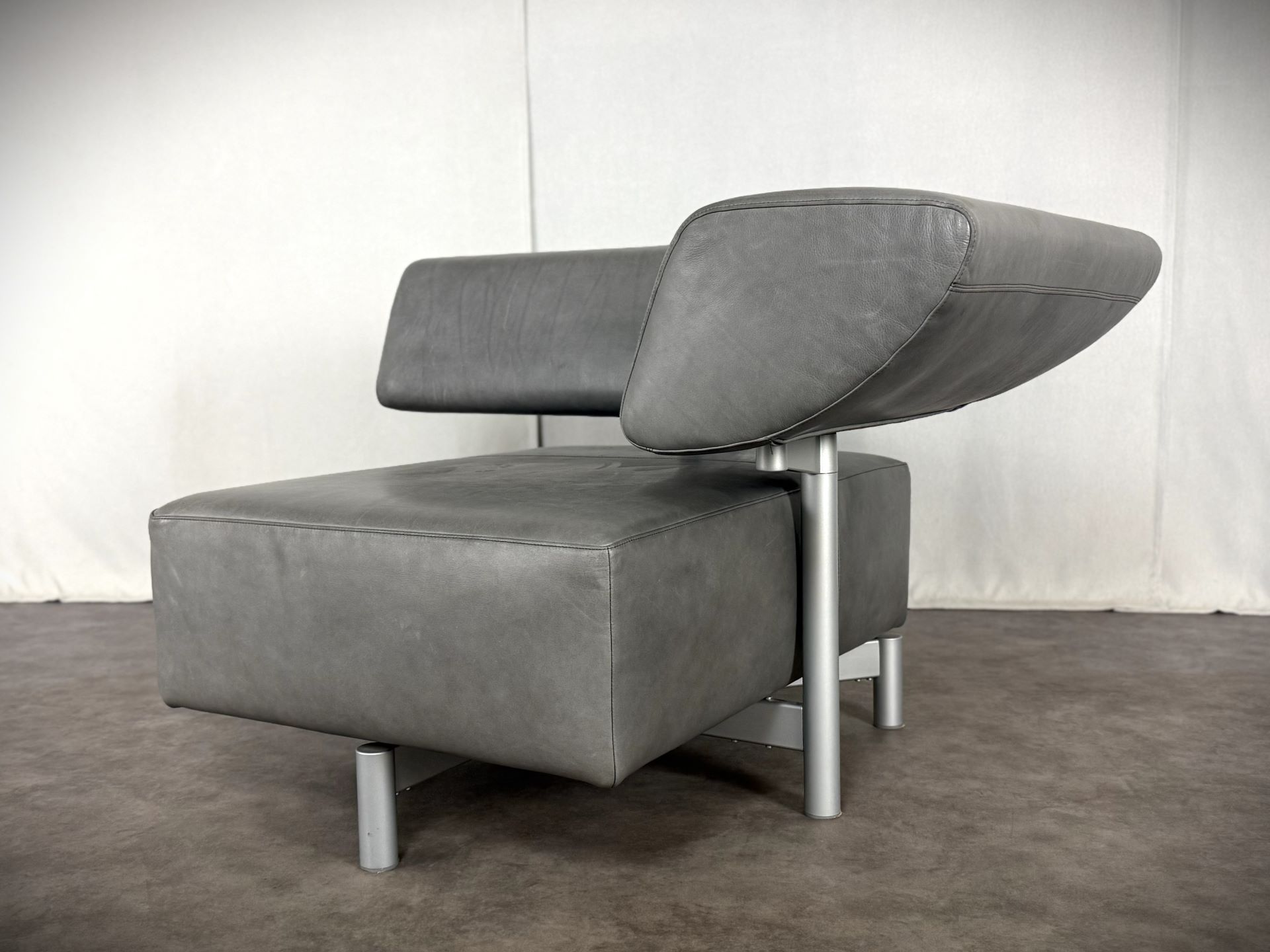 Der Sessel ist mit edlem Leder in einem stilvollen Grauton bezogen, das im Laufe der Zeit eine schöne, authentische Patina entwickelt hat und dem Möbelstück einen besonderen Vintage-Charme verleiht. Die klare Linienführung, kombiniert mit der modernen, fast skulpturalen Gestaltung der verstellbaren Rückenlehne, macht ihn zu einem echten Blickfang – ideal für Designliebhaber, moderne Wohnräume oder stilvolle Büros.