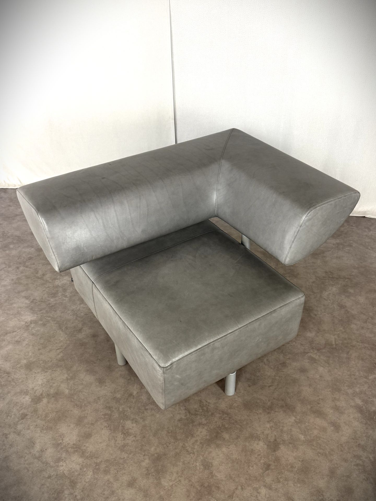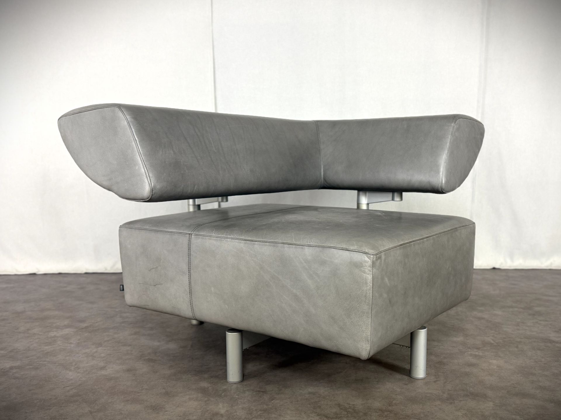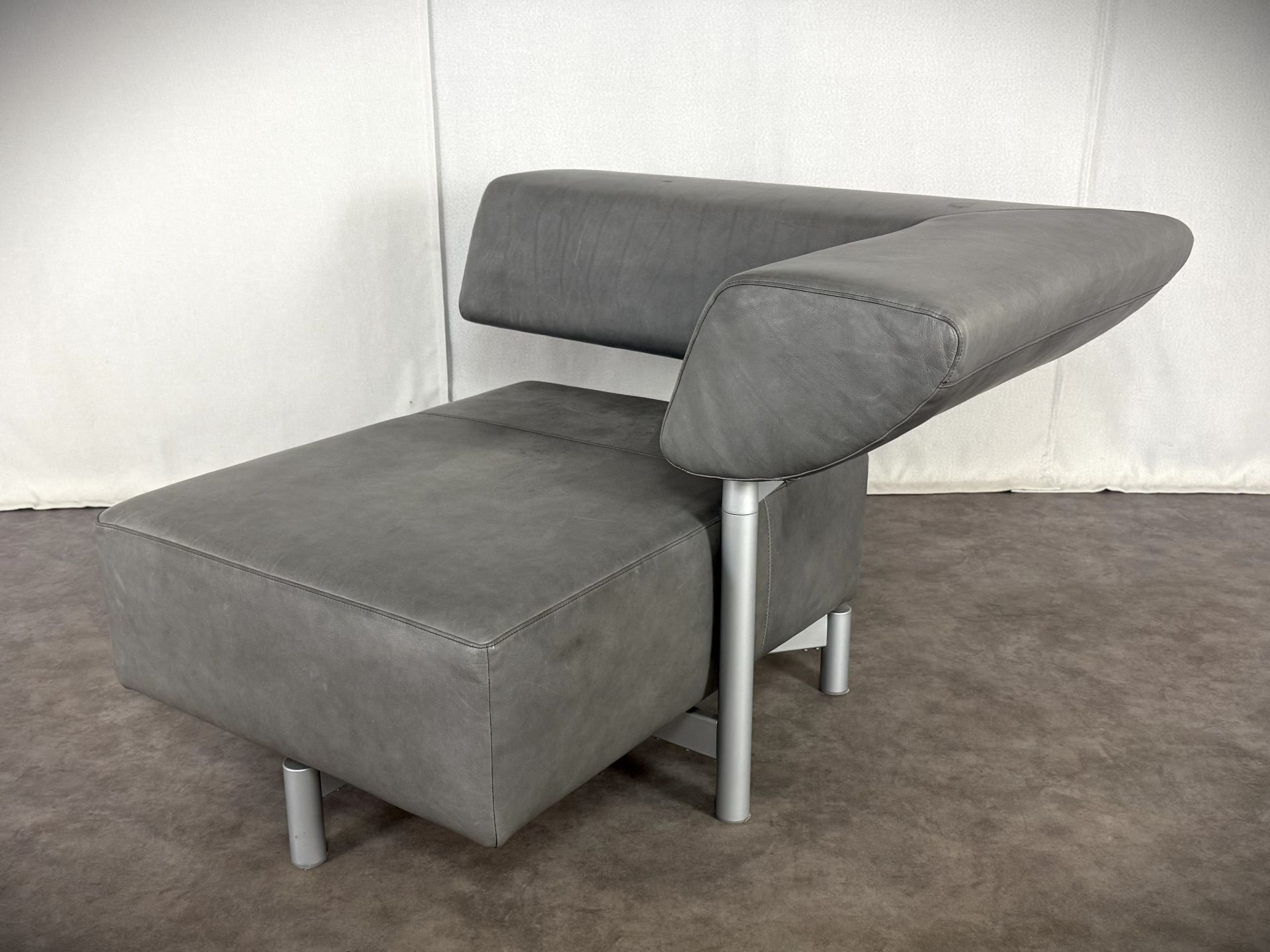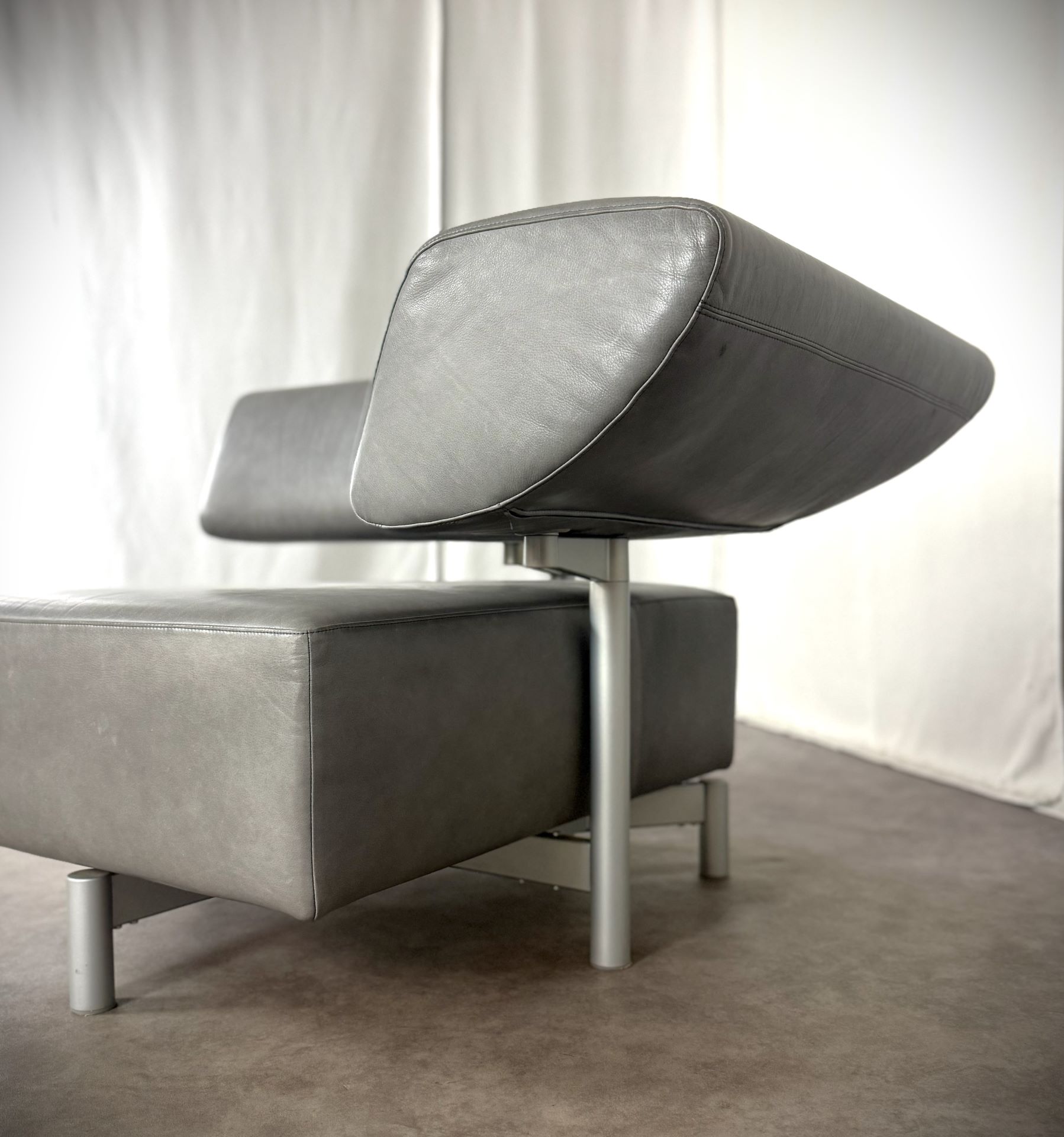 Der Sessel ist mit edlem Leder in einem stilvollen Grauton bezogen, das im Laufe der Zeit eine schöne, authentische Patina entwickelt hat und dem Möbelstück einen besonderen Vintage-Charme verleiht. Die klare Linienführung, kombiniert mit der modernen, fast skulpturalen Gestaltung der verstellbaren Rückenlehne, macht ihn zu einem echten Blickfang – ideal für Designliebhaber, moderne Wohnräume oder stilvolle Büros.