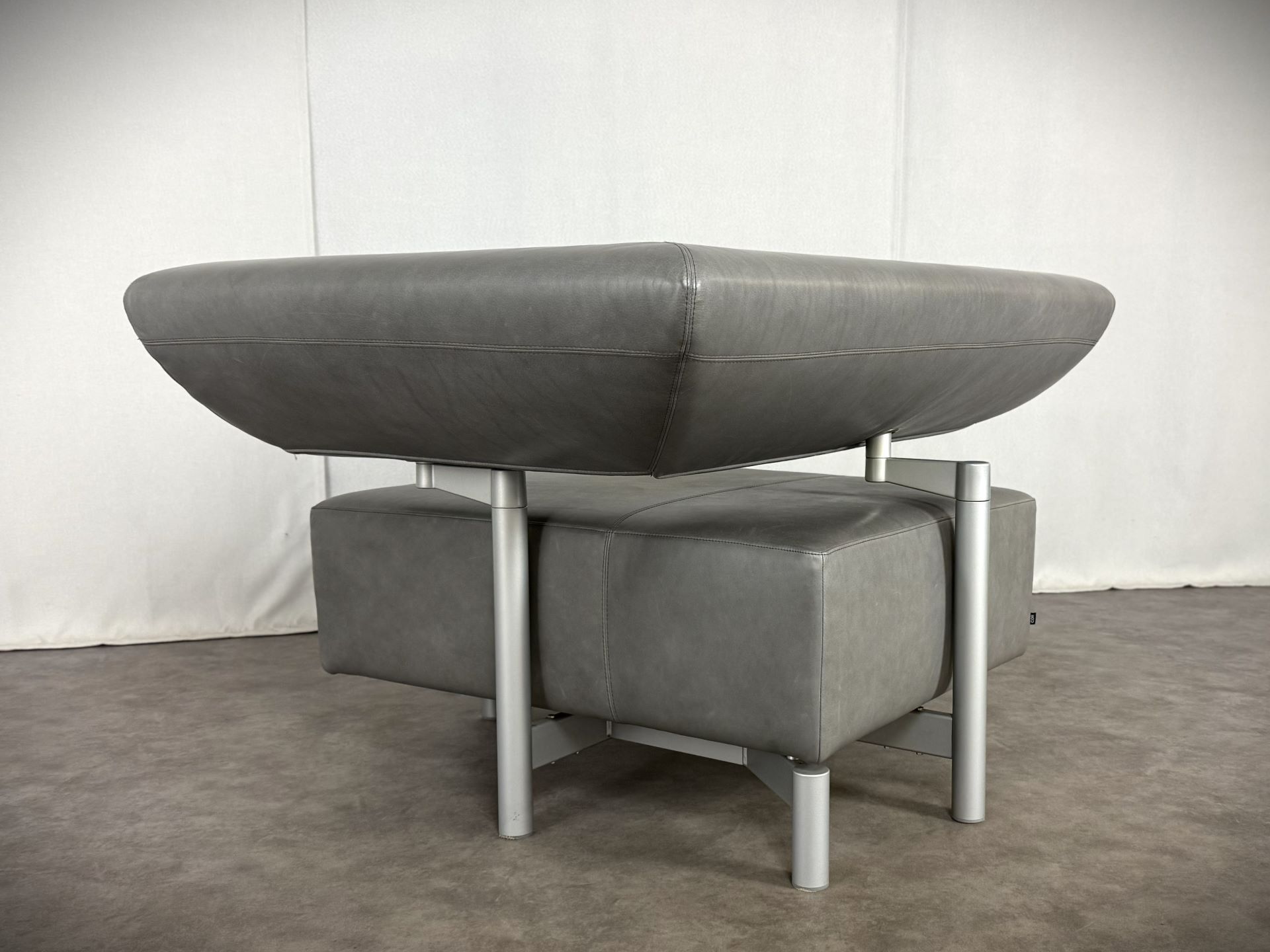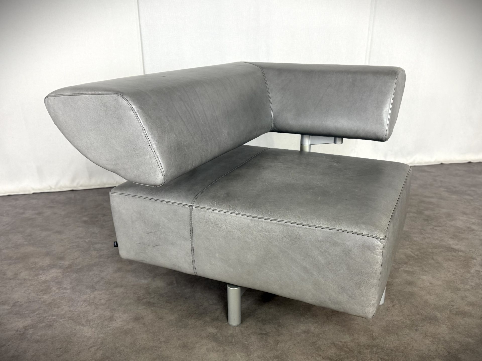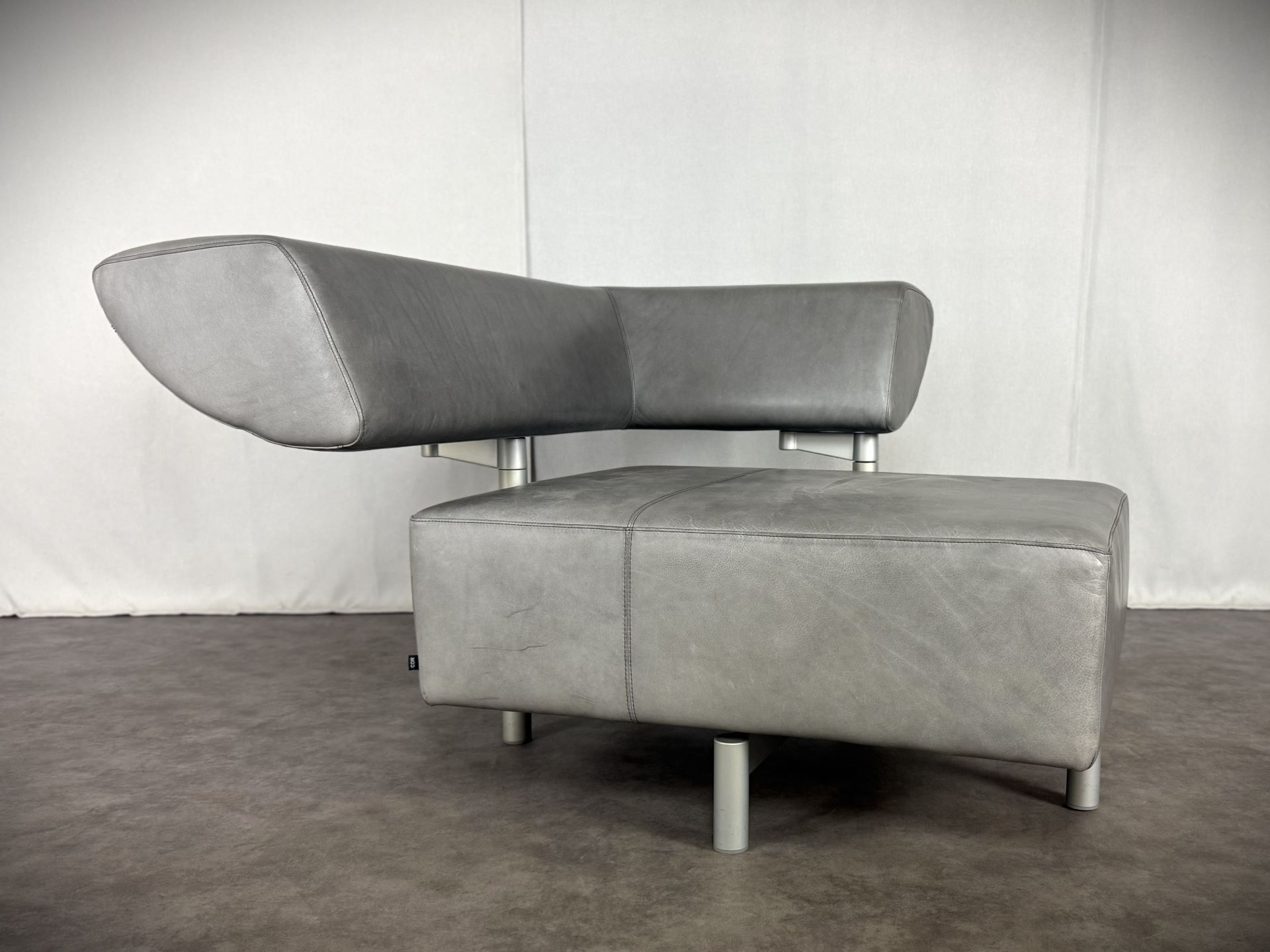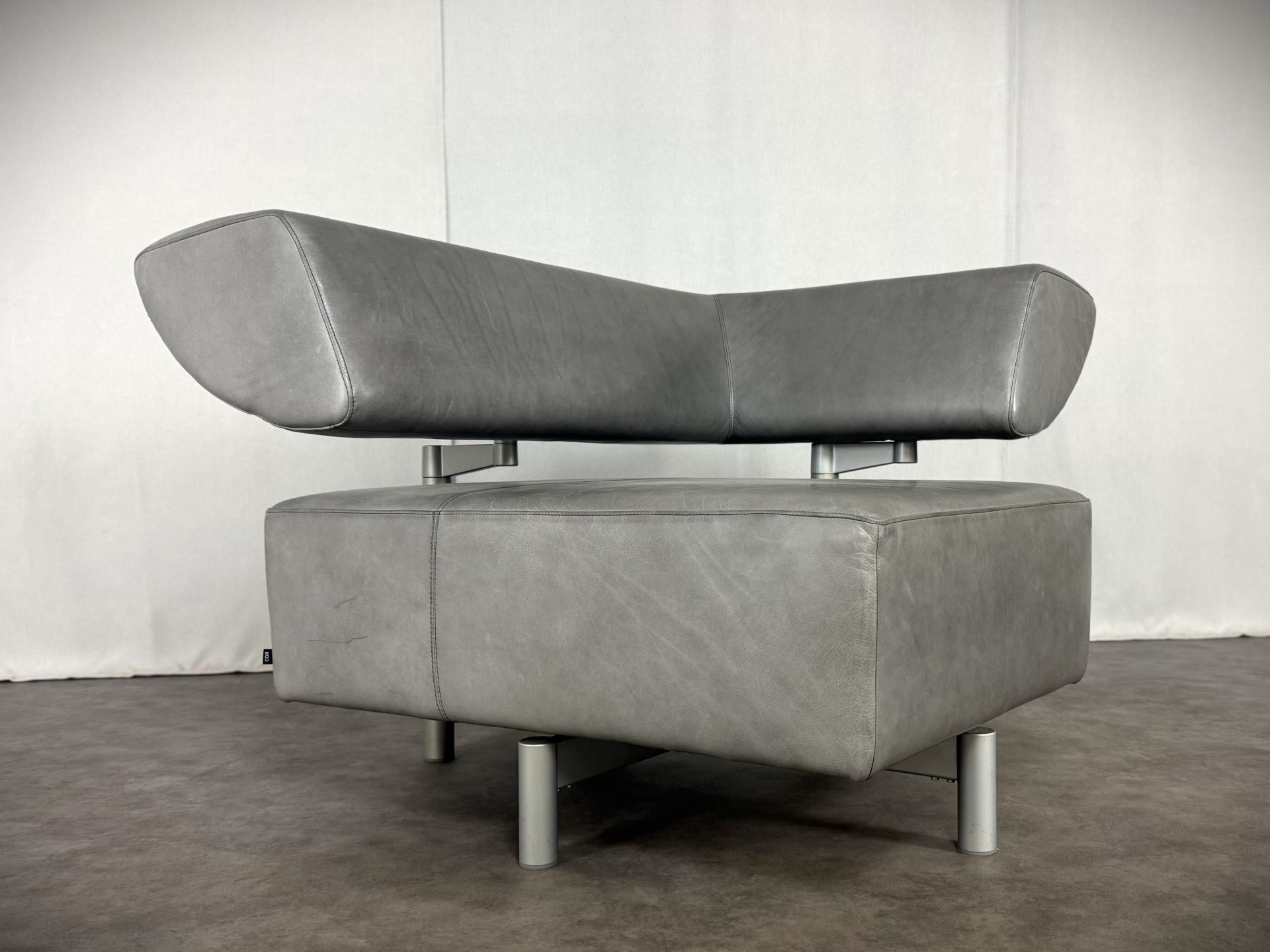 Der Sessel ist mit edlem Leder in einem stilvollen Grauton bezogen, das im Laufe der Zeit eine schöne, authentische Patina entwickelt hat und dem Möbelstück einen besonderen Vintage-Charme verleiht. Die klare Linienführung, kombiniert mit der modernen, fast skulpturalen Gestaltung der verstellbaren Rückenlehne, macht ihn zu einem echten Blickfang – ideal für Designliebhaber, moderne Wohnräume oder stilvolle Büros.