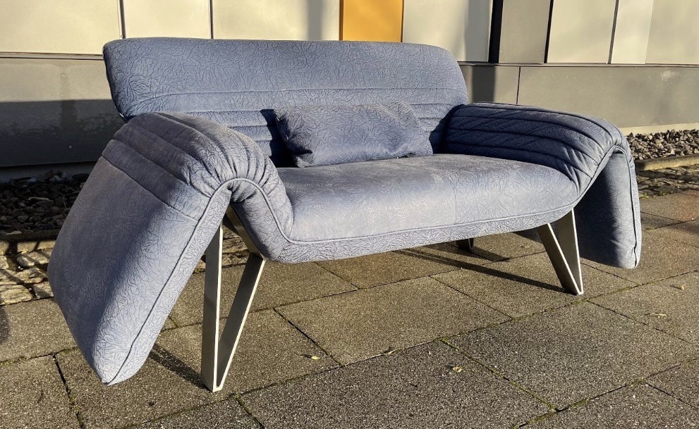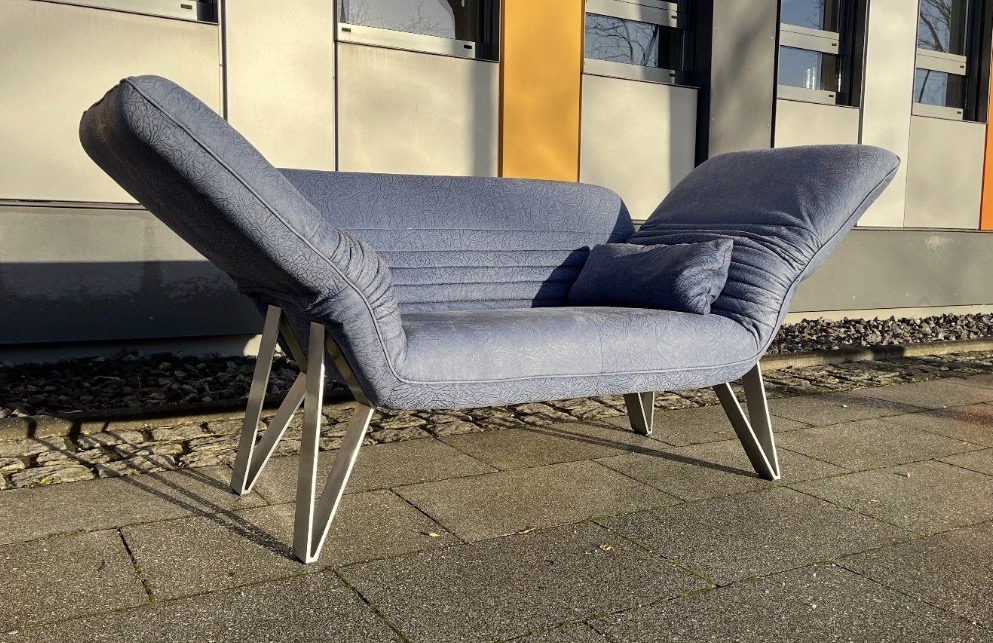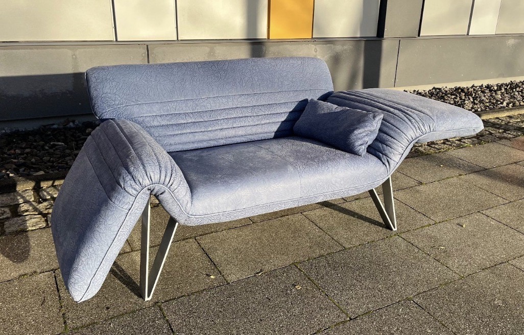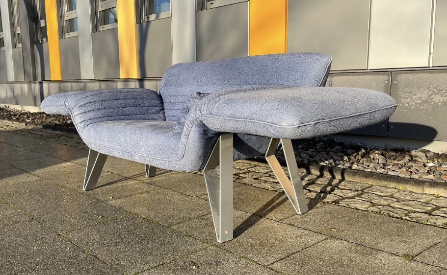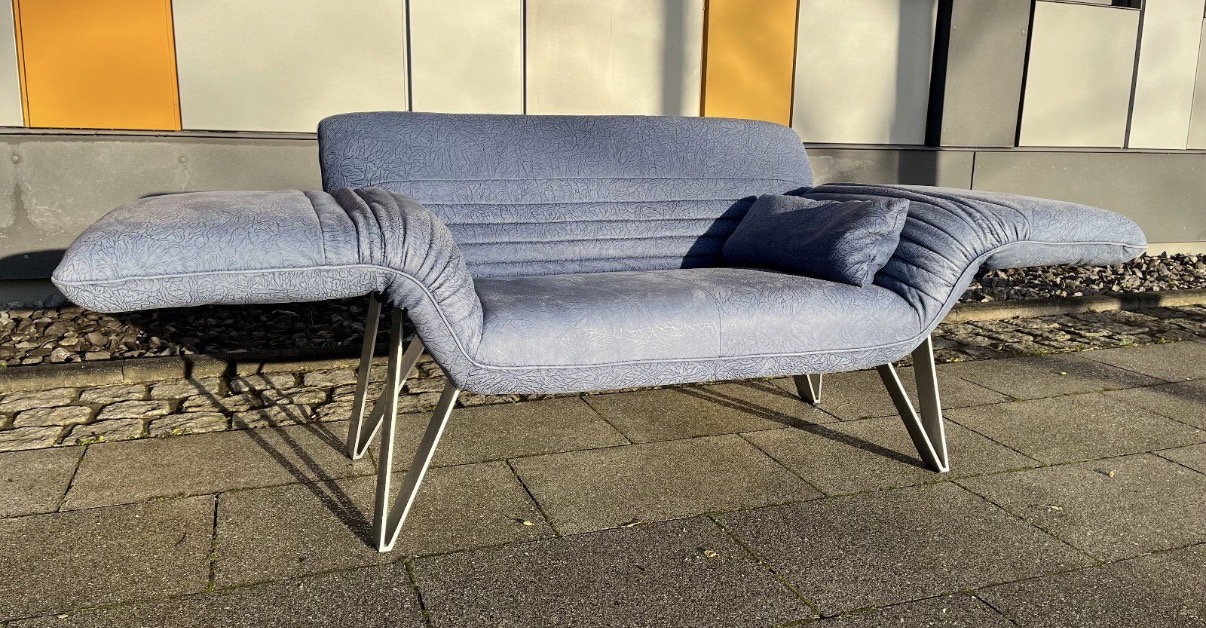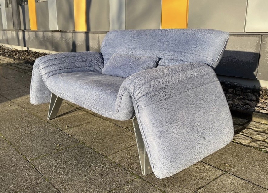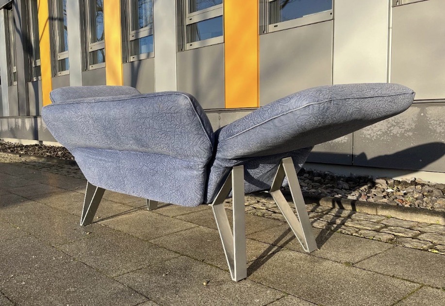 Das Besondere an diesem Sofa sind die Füße, die in Zusammenarbeit mit dem deutschen Premium Hersteller „Musterring“ entstanden sind. Sie sind aus massivem, schweren Edelstahl und ausgesprochen selten bei diesem Modell.