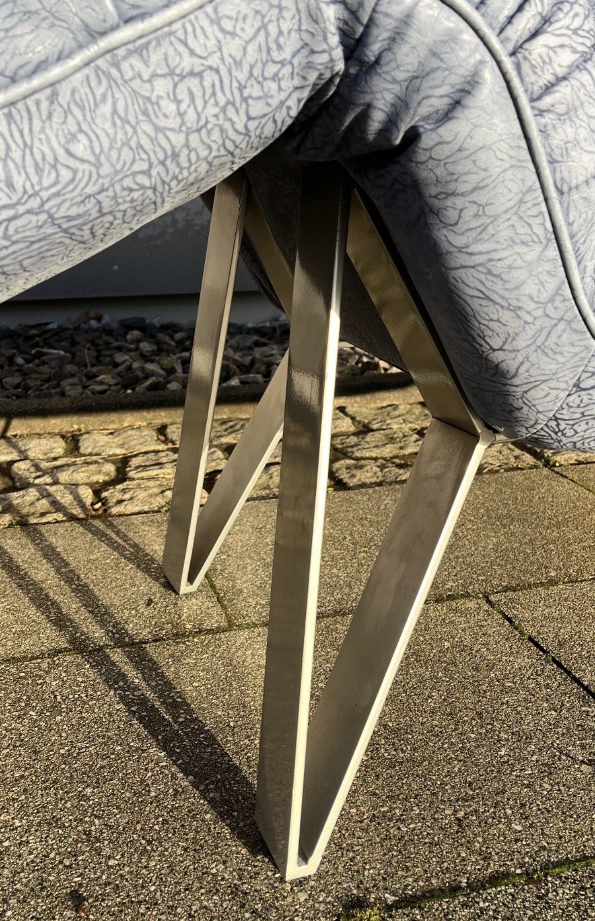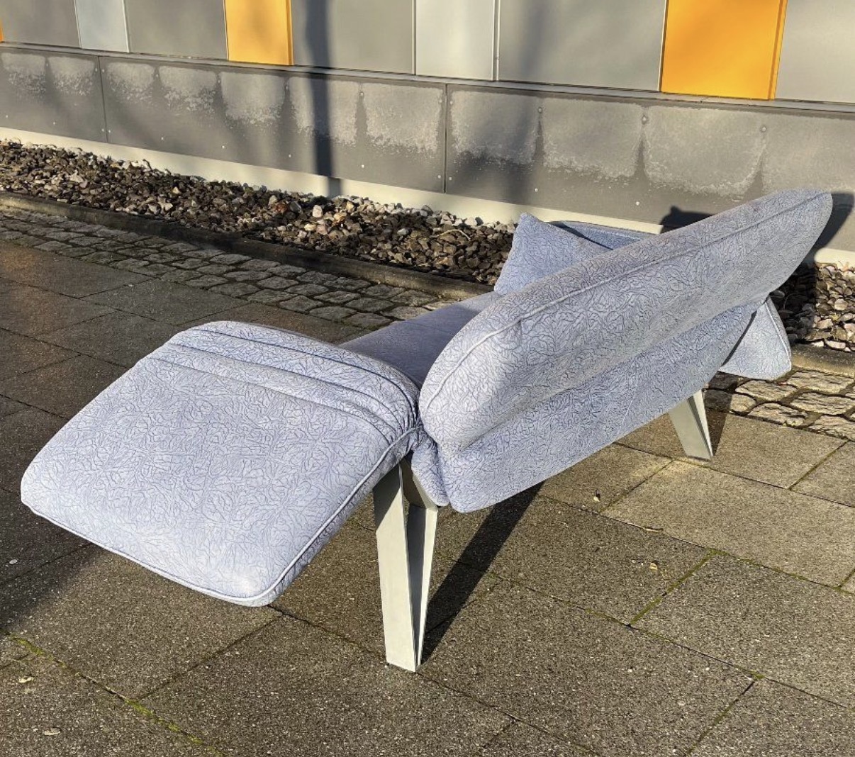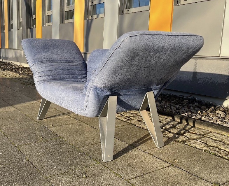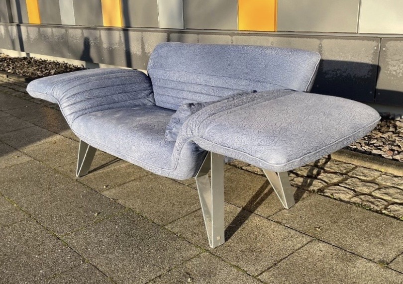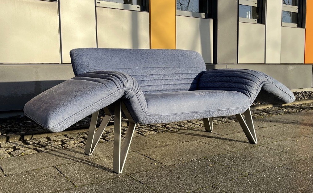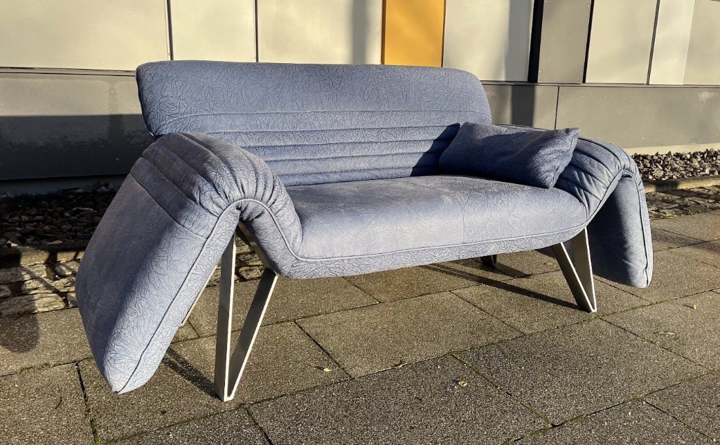 Das Besondere an diesem Sofa sind die Füße, die in Zusammenarbeit mit dem deutschen Premium Hersteller „Musterring“ entstanden sind. Sie sind aus massivem, schweren Edelstahl und ausgesprochen selten bei diesem Modell.