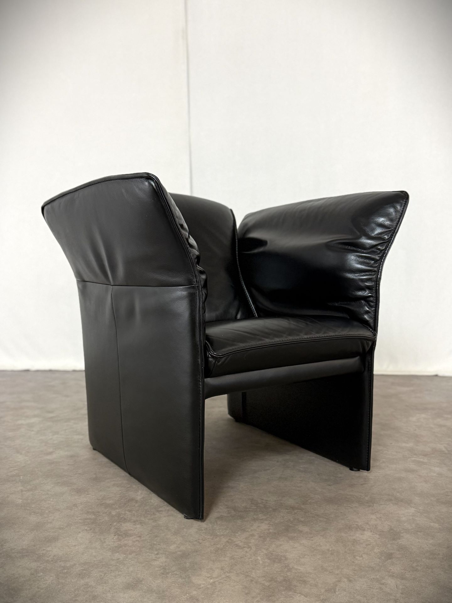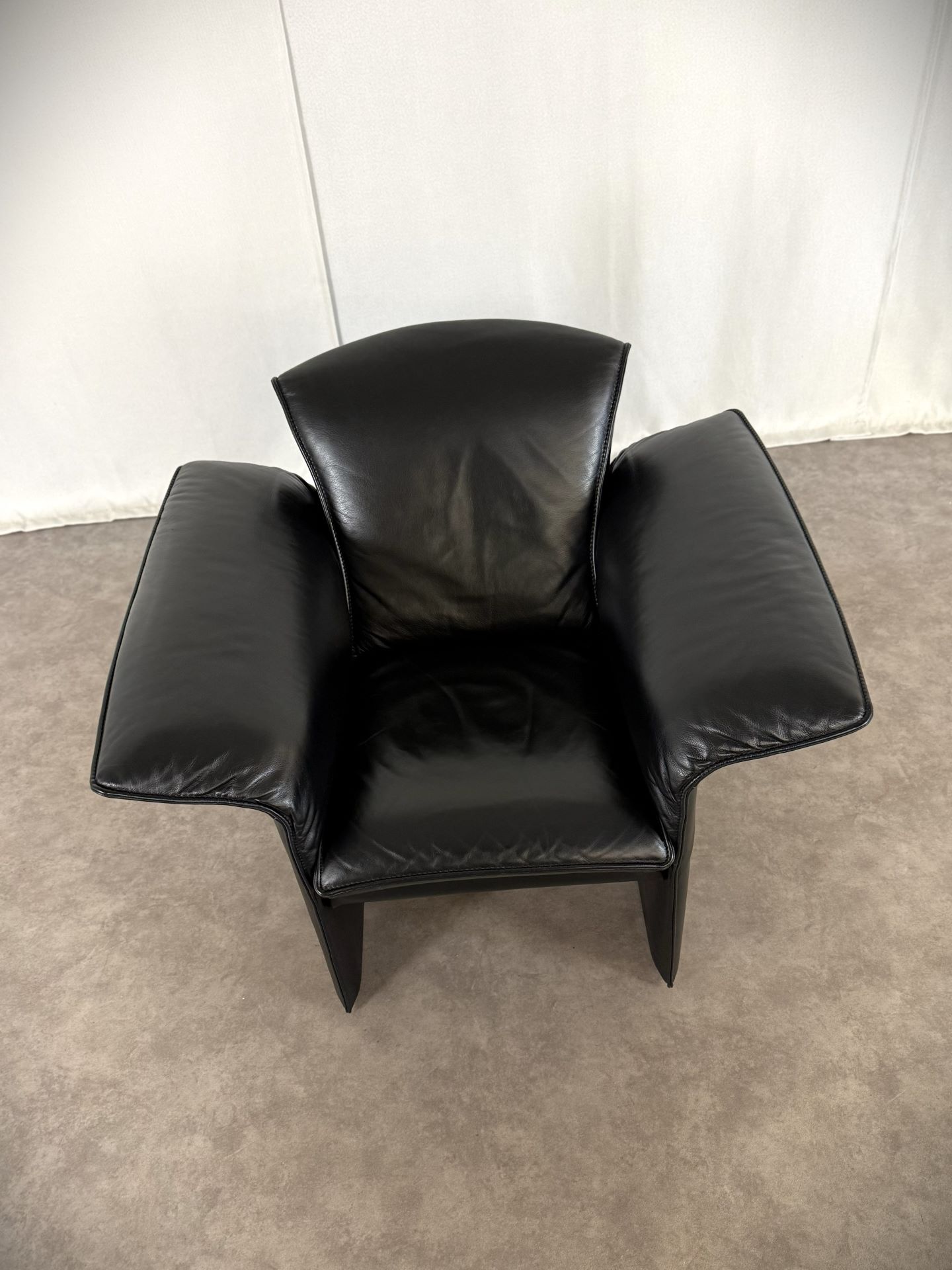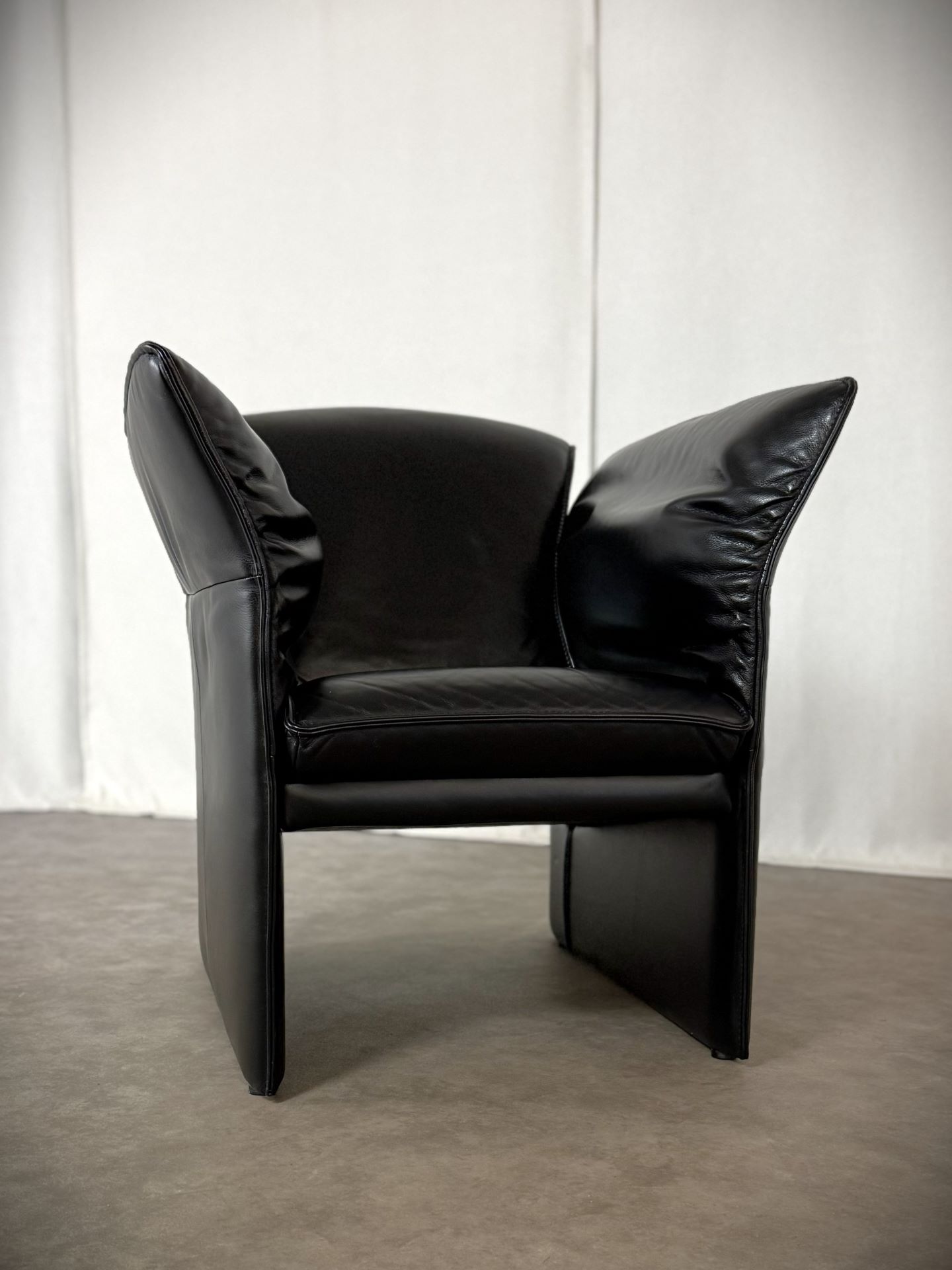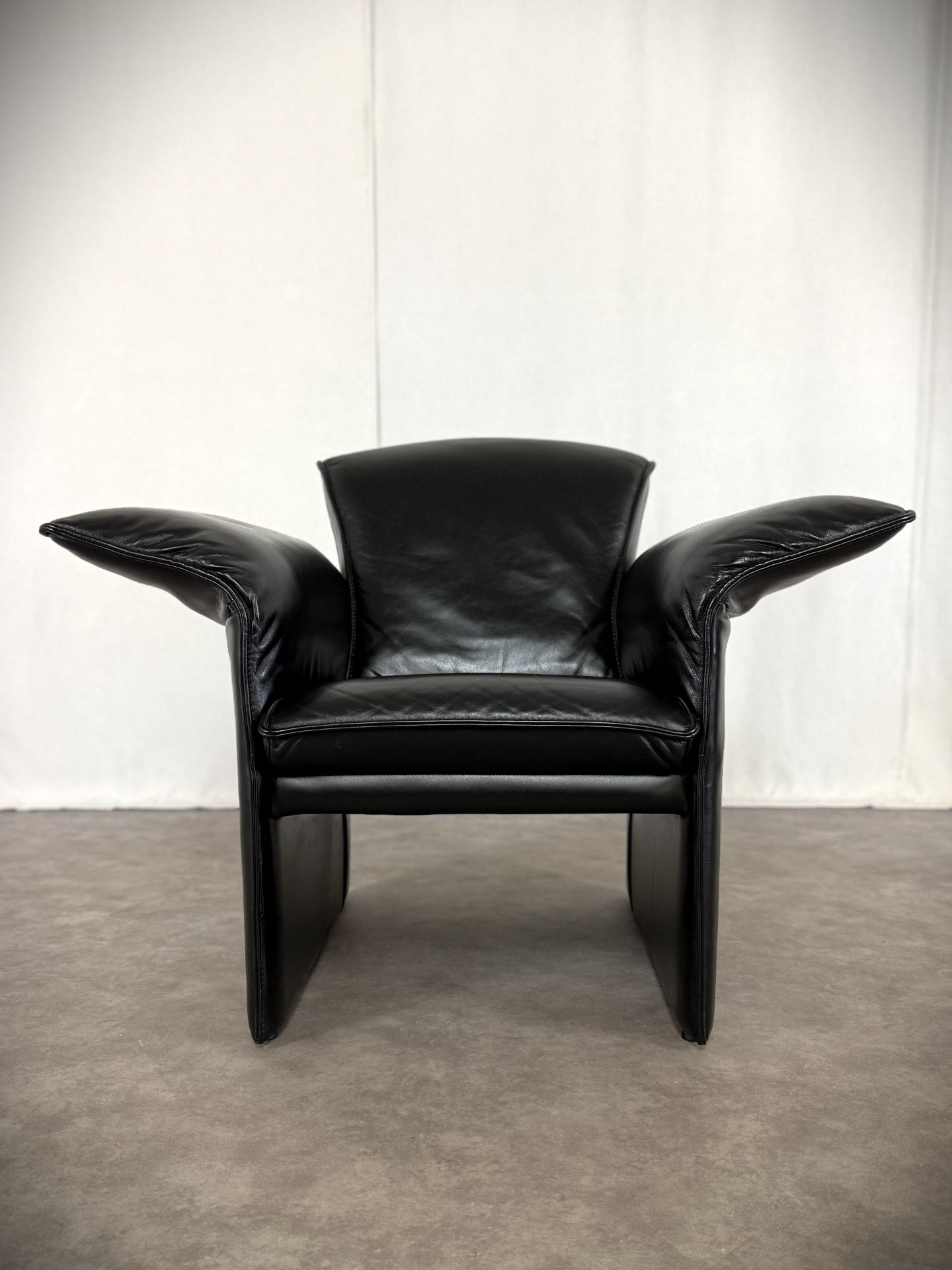 Das edle schwarze Leder ist weich, geschmeidig und unterstreicht die elegante Ausstrahlung. Die charakteristischen, leicht ausgestellten Armlehnen verleihen dem Sessel eine außergewöhnliche Silhouette und machen ihn zu einem echten Blickfang – ob im Wohnzimmer, Büro oder in einer stilvollen Lounge.