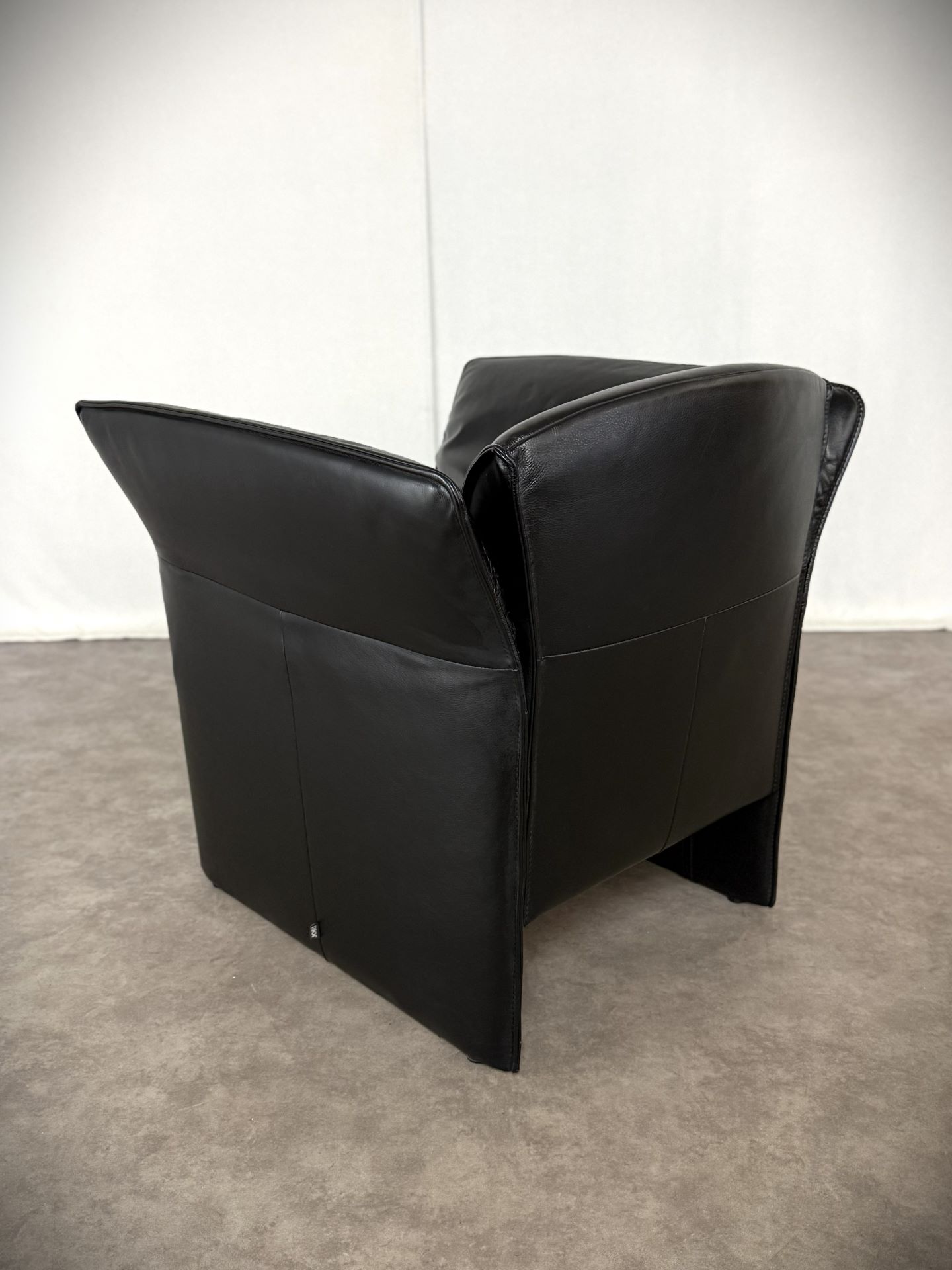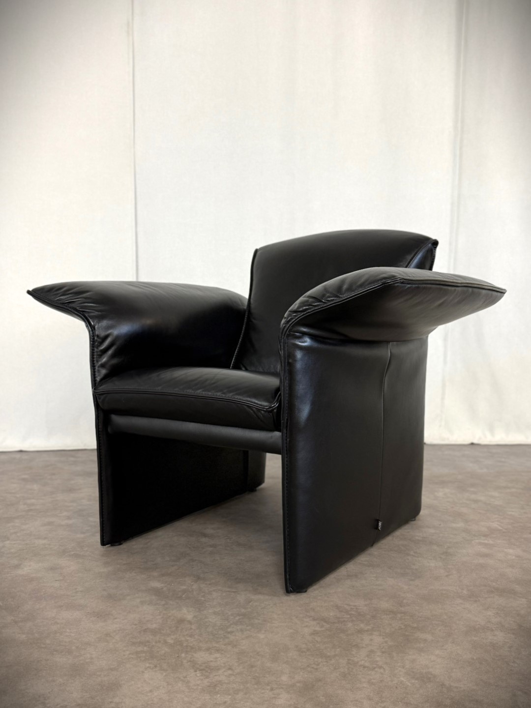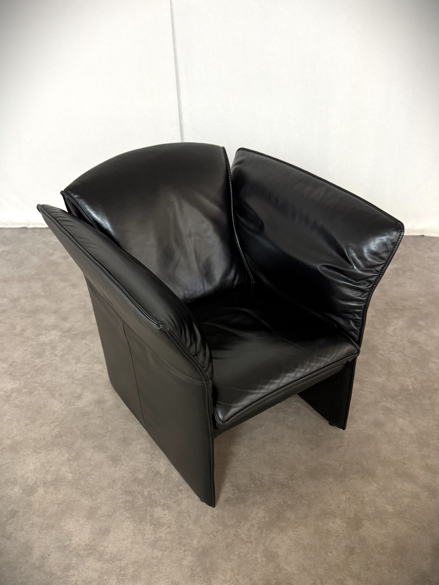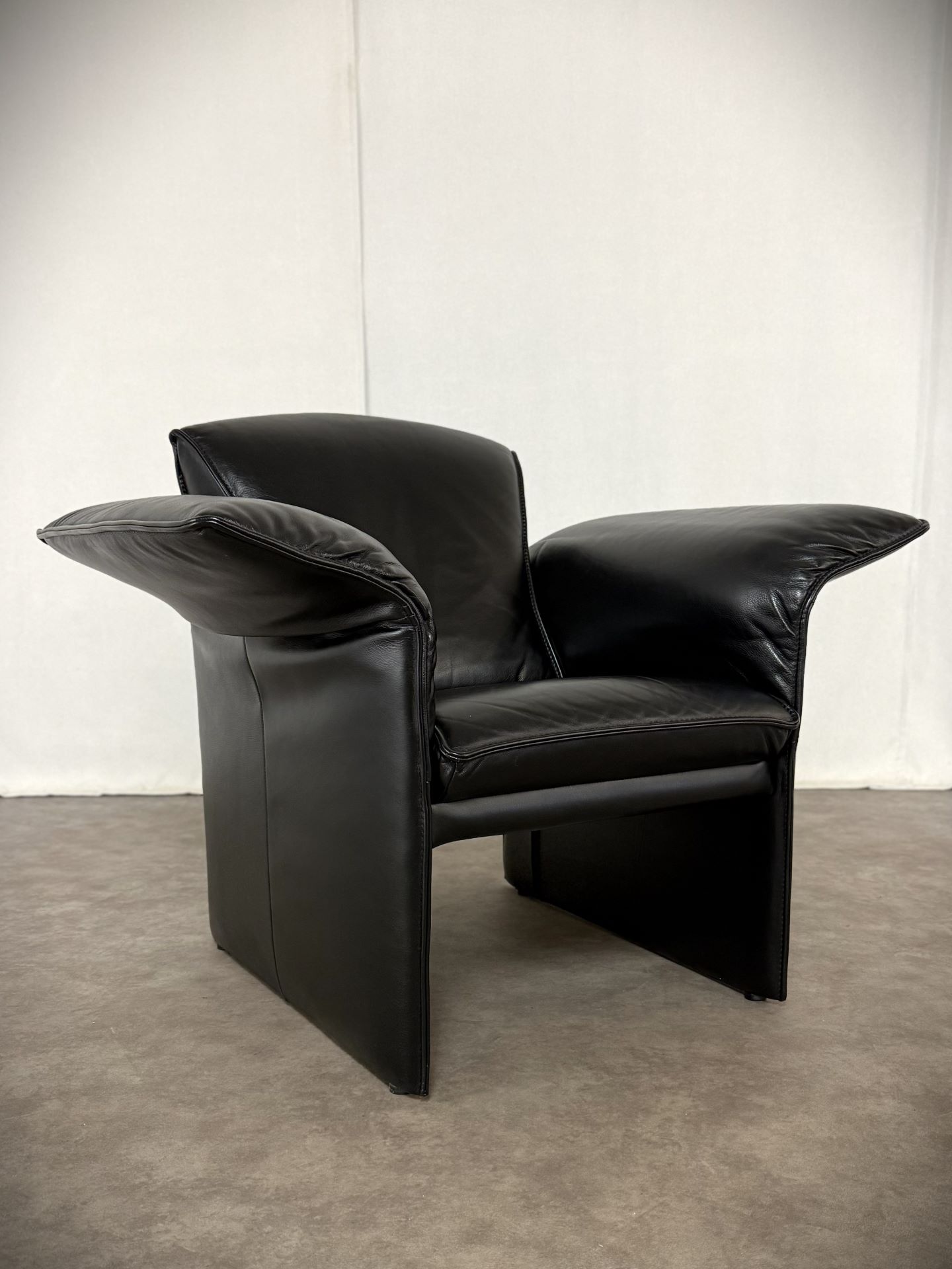 Das edle schwarze Leder ist weich, geschmeidig und unterstreicht die elegante Ausstrahlung. Die charakteristischen, leicht ausgestellten Armlehnen verleihen dem Sessel eine außergewöhnliche Silhouette und machen ihn zu einem echten Blickfang – ob im Wohnzimmer, Büro oder in einer stilvollen Lounge.
