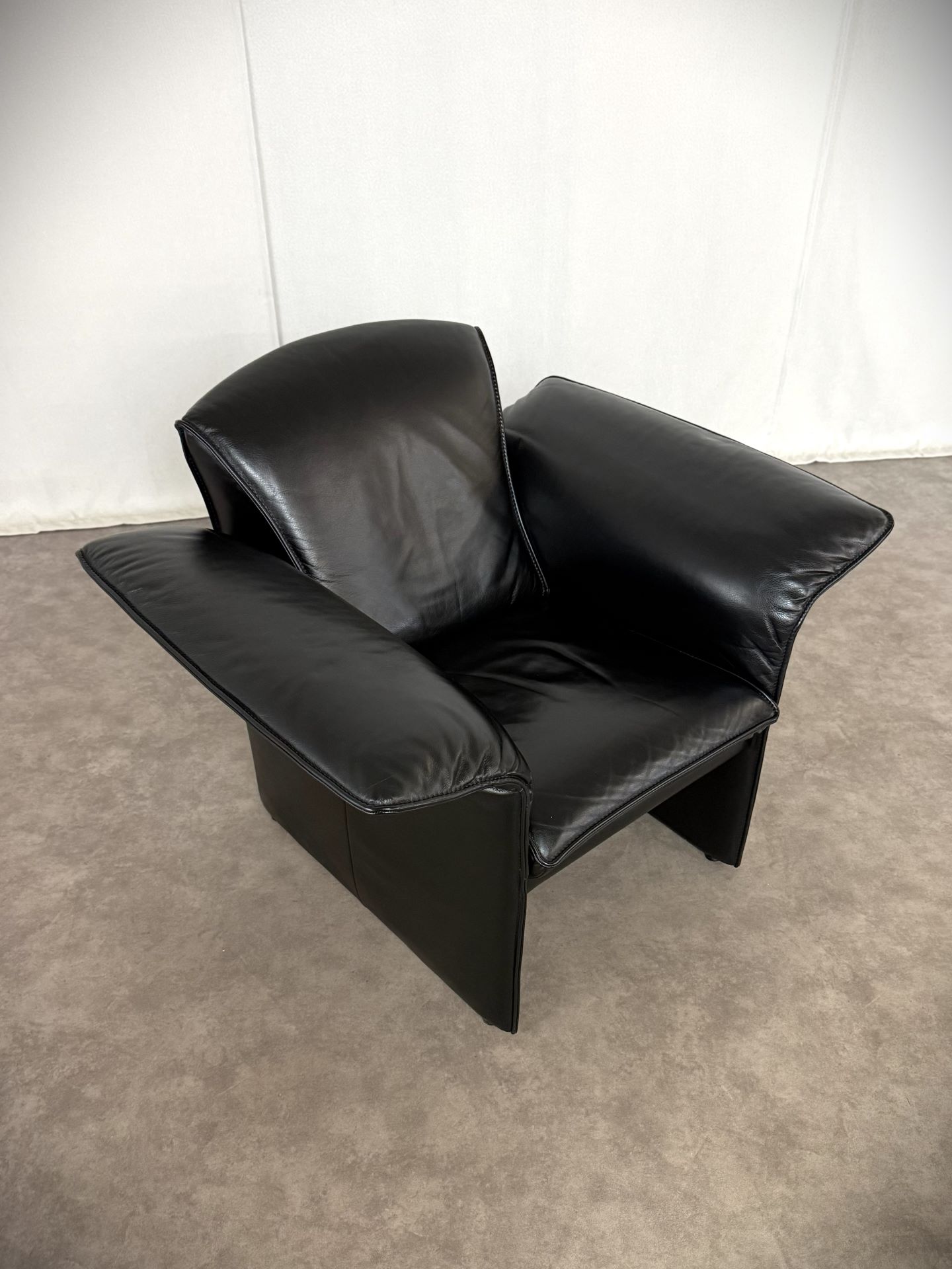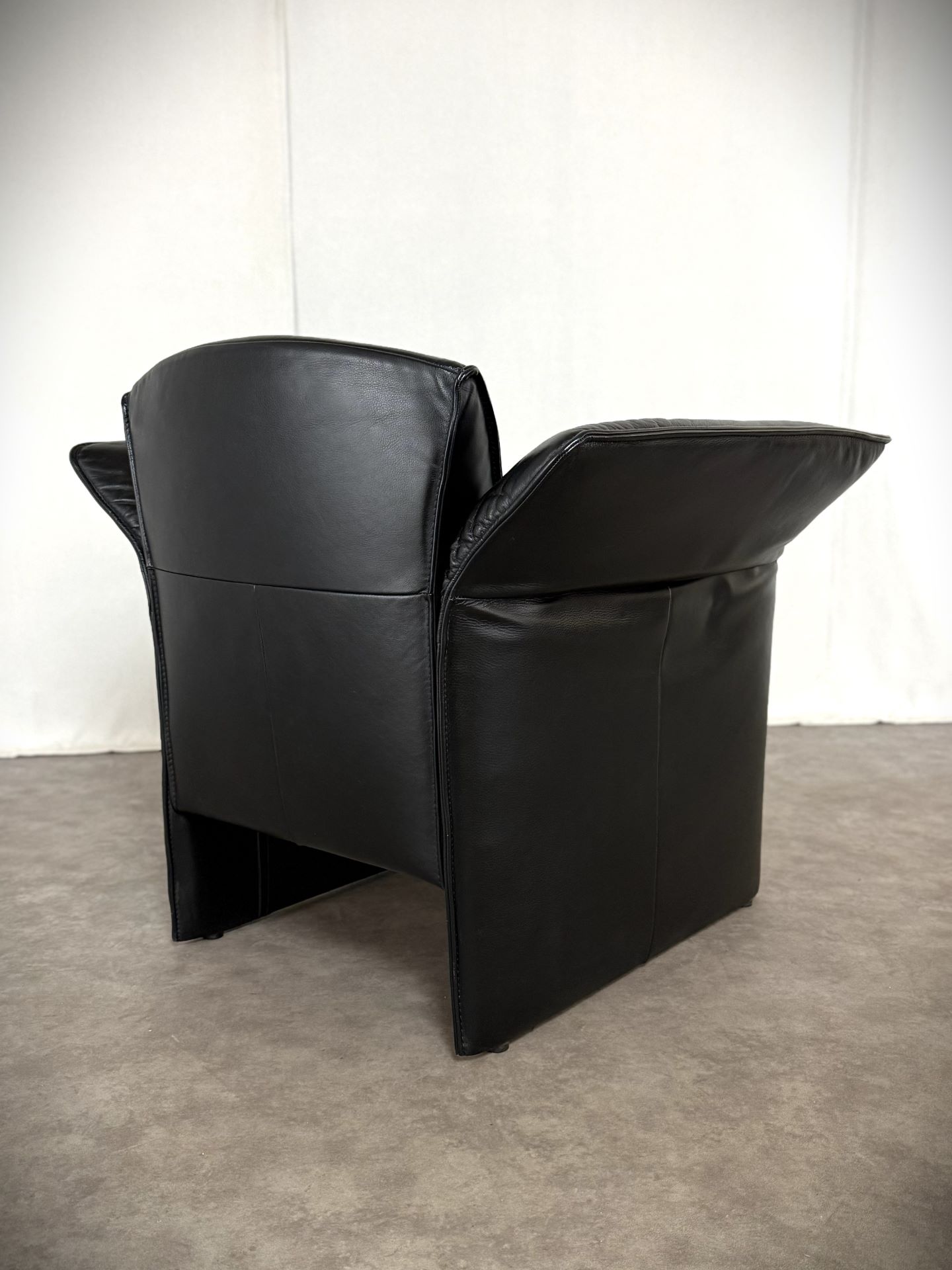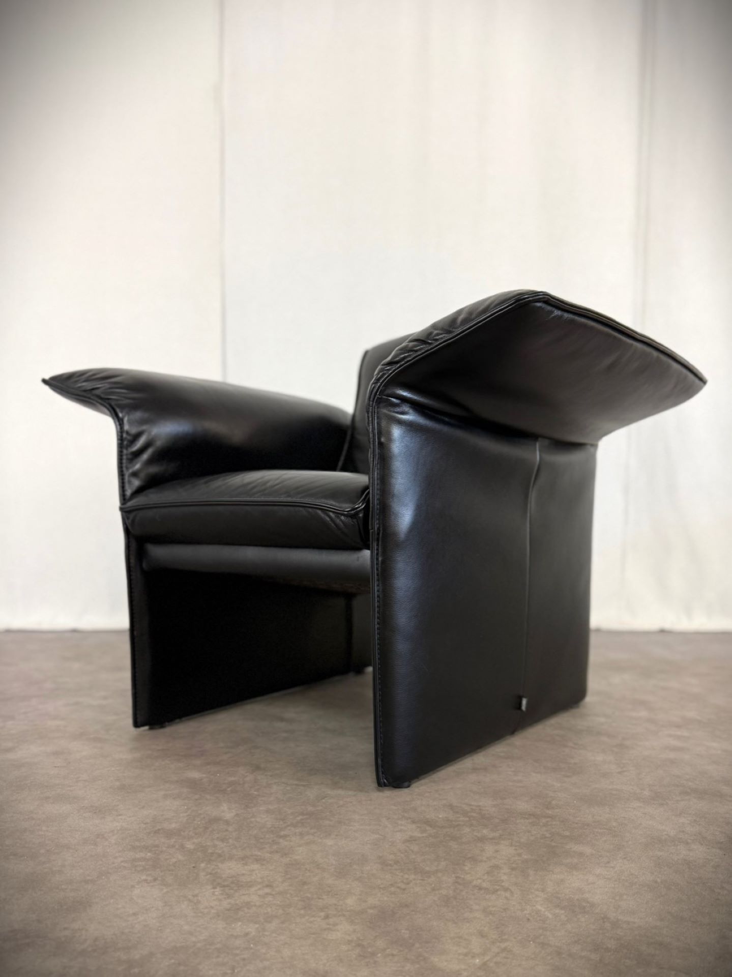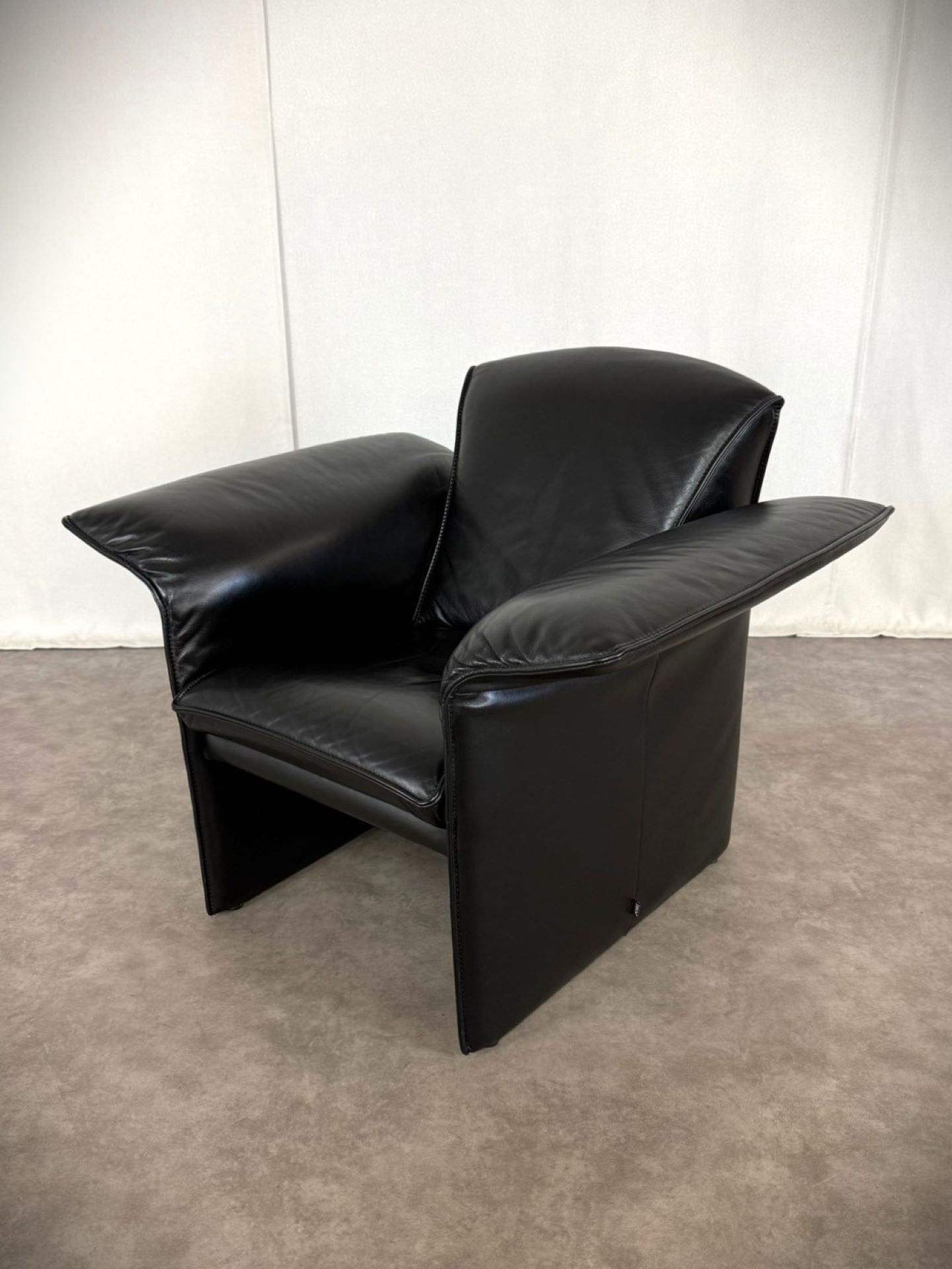 Das edle schwarze Leder ist weich, geschmeidig und unterstreicht die elegante Ausstrahlung. Die charakteristischen, leicht ausgestellten Armlehnen verleihen dem Sessel eine außergewöhnliche Silhouette und machen ihn zu einem echten Blickfang – ob im Wohnzimmer, Büro oder in einer stilvollen Lounge.
