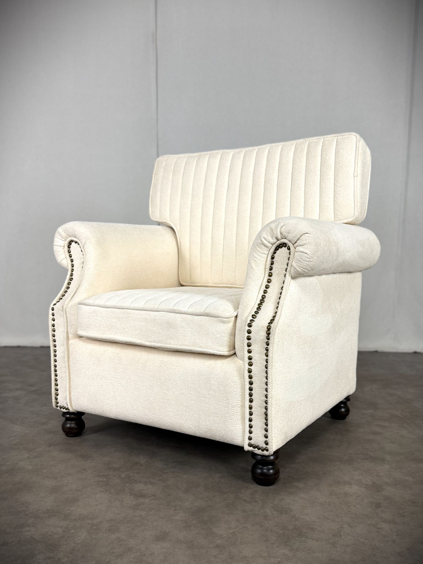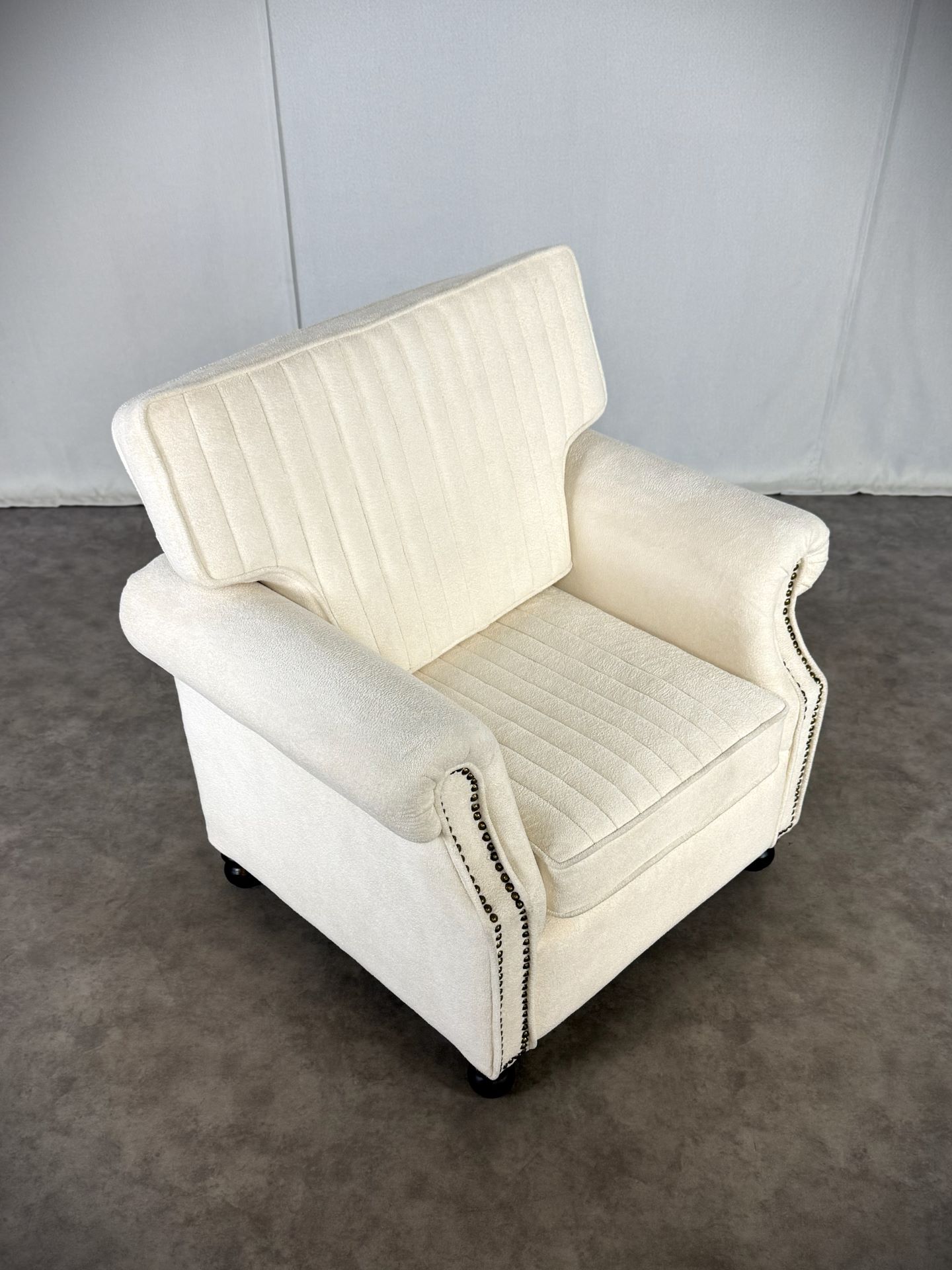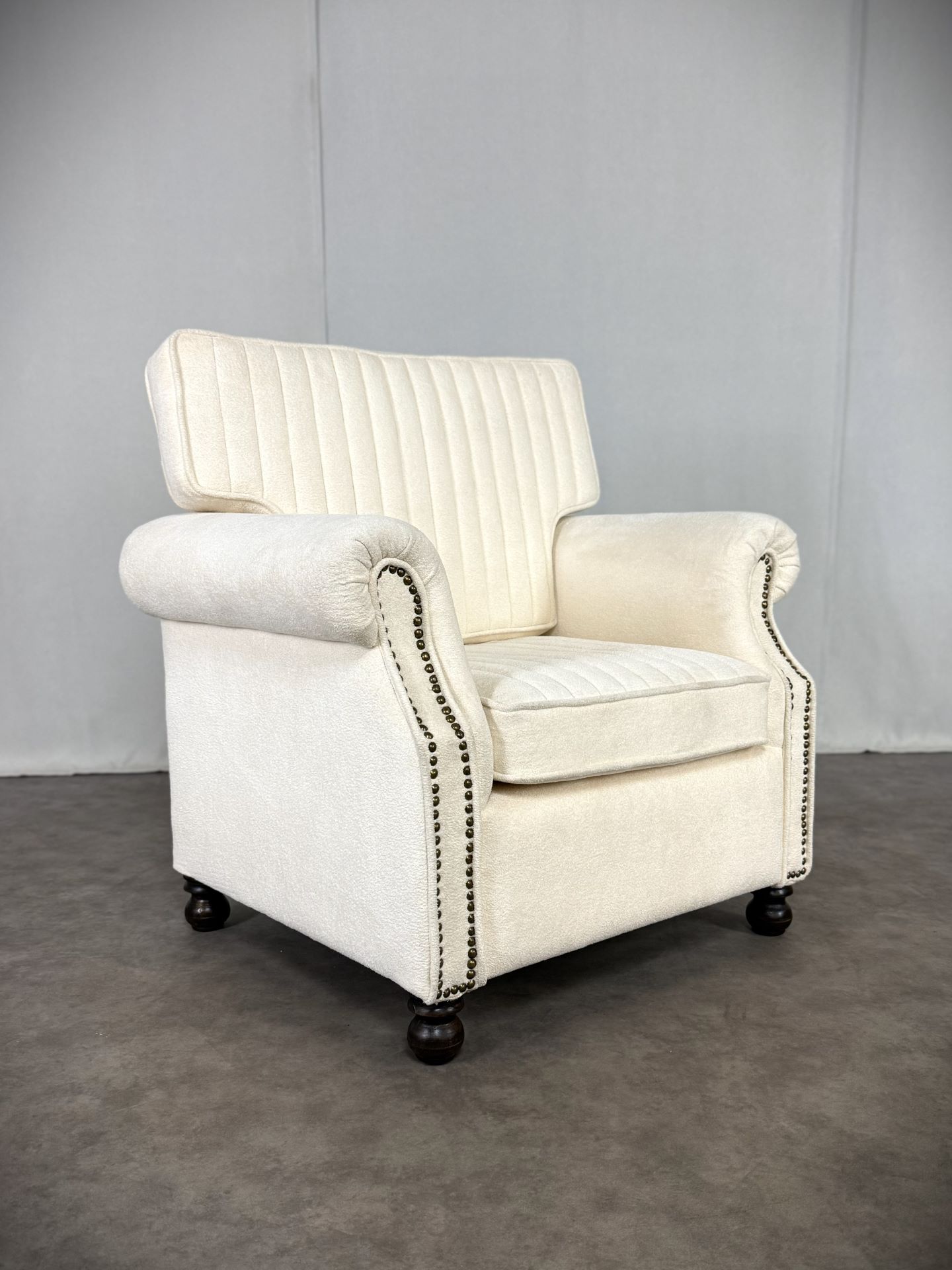 Die hochwertige Polsterung sorgt für ein besonders angenehmes Sitzgefühl, während die weiche Oberfläche im Teddy-Look eine gemütliche und zugleich edle Optik verleiht. Die vertikal gesteppten Rückenlehnen-Details unterstreichen den Vintage-Charakter und machen den Sessel zu einem echten Blickfang.