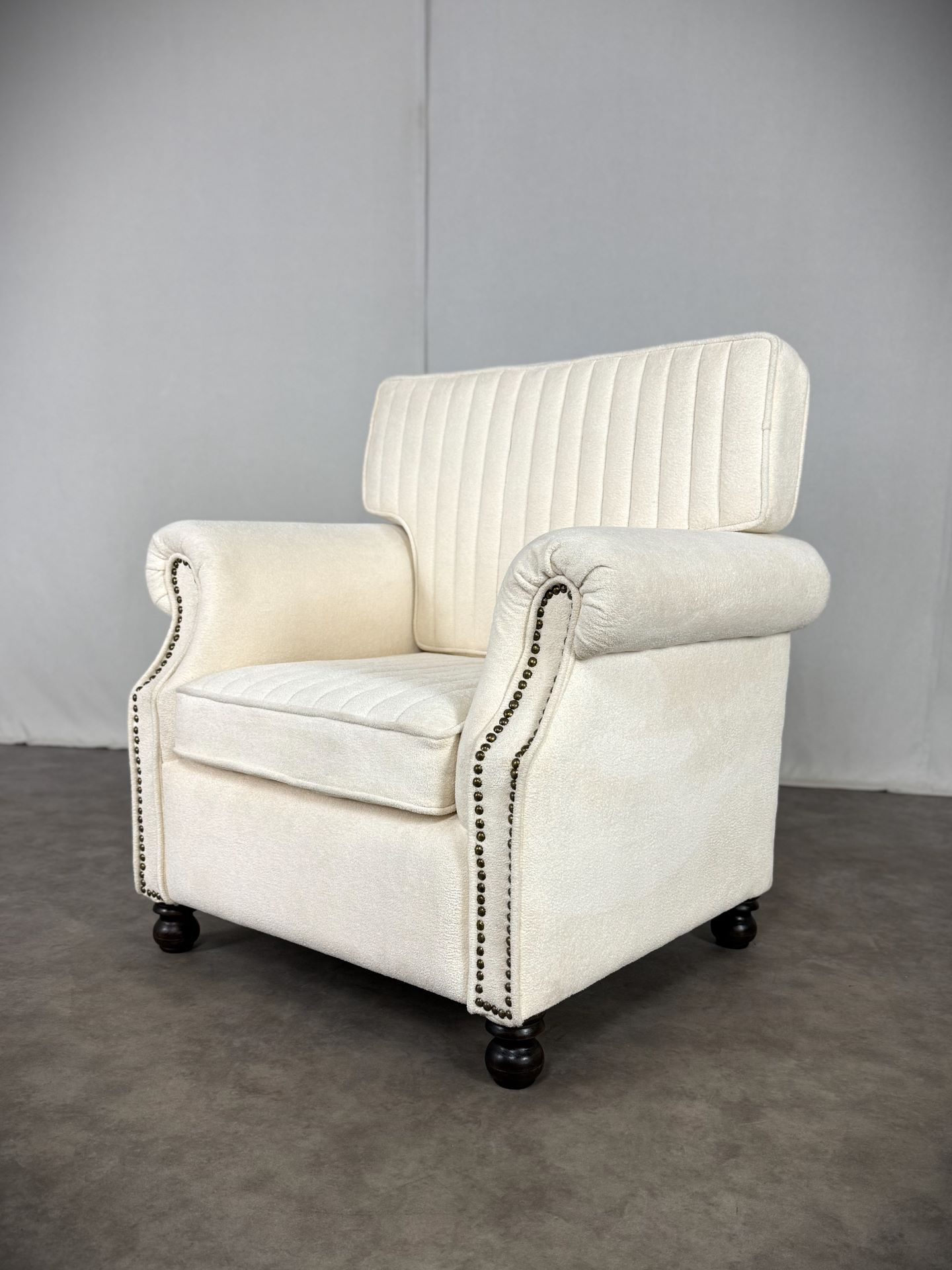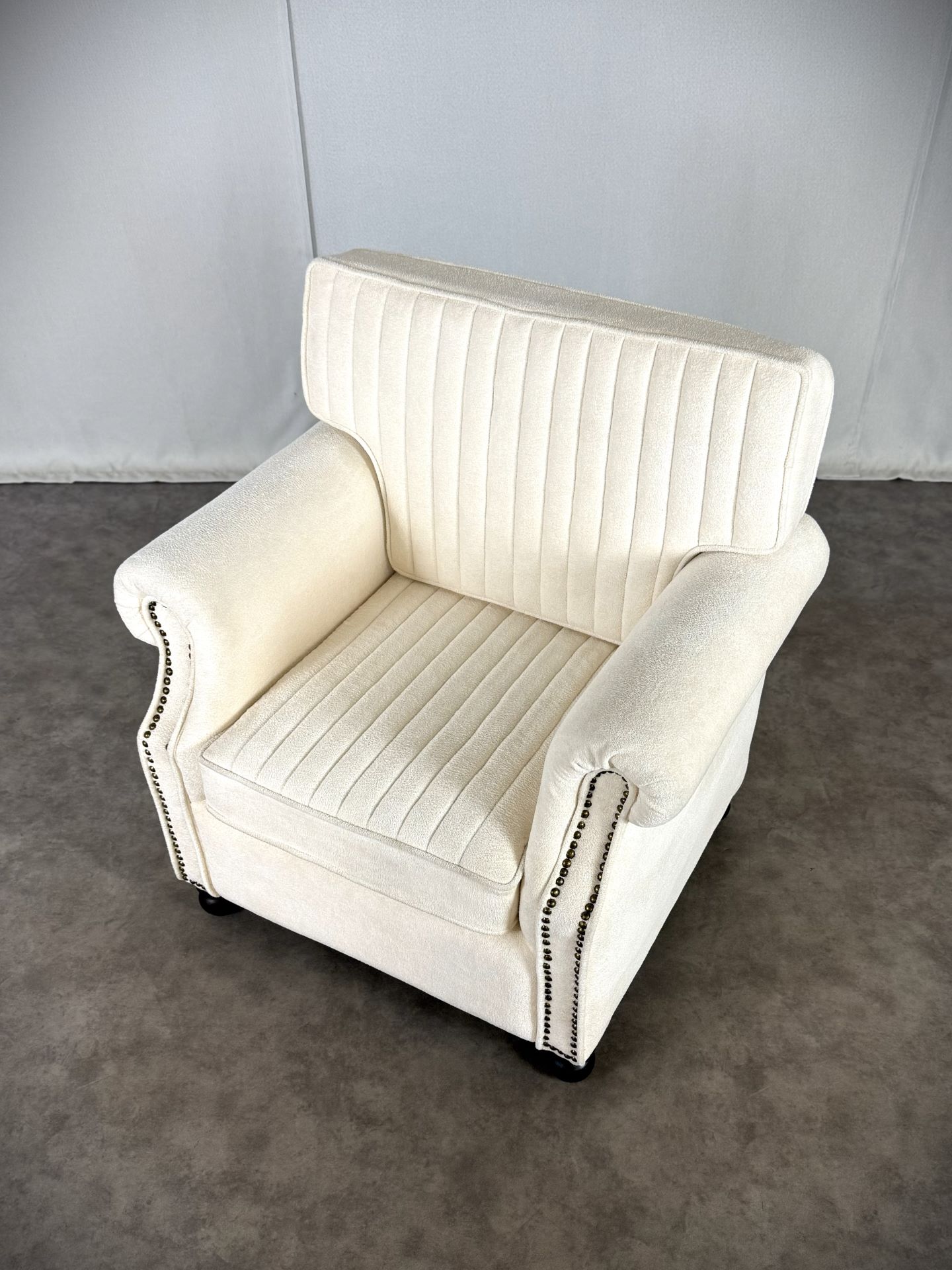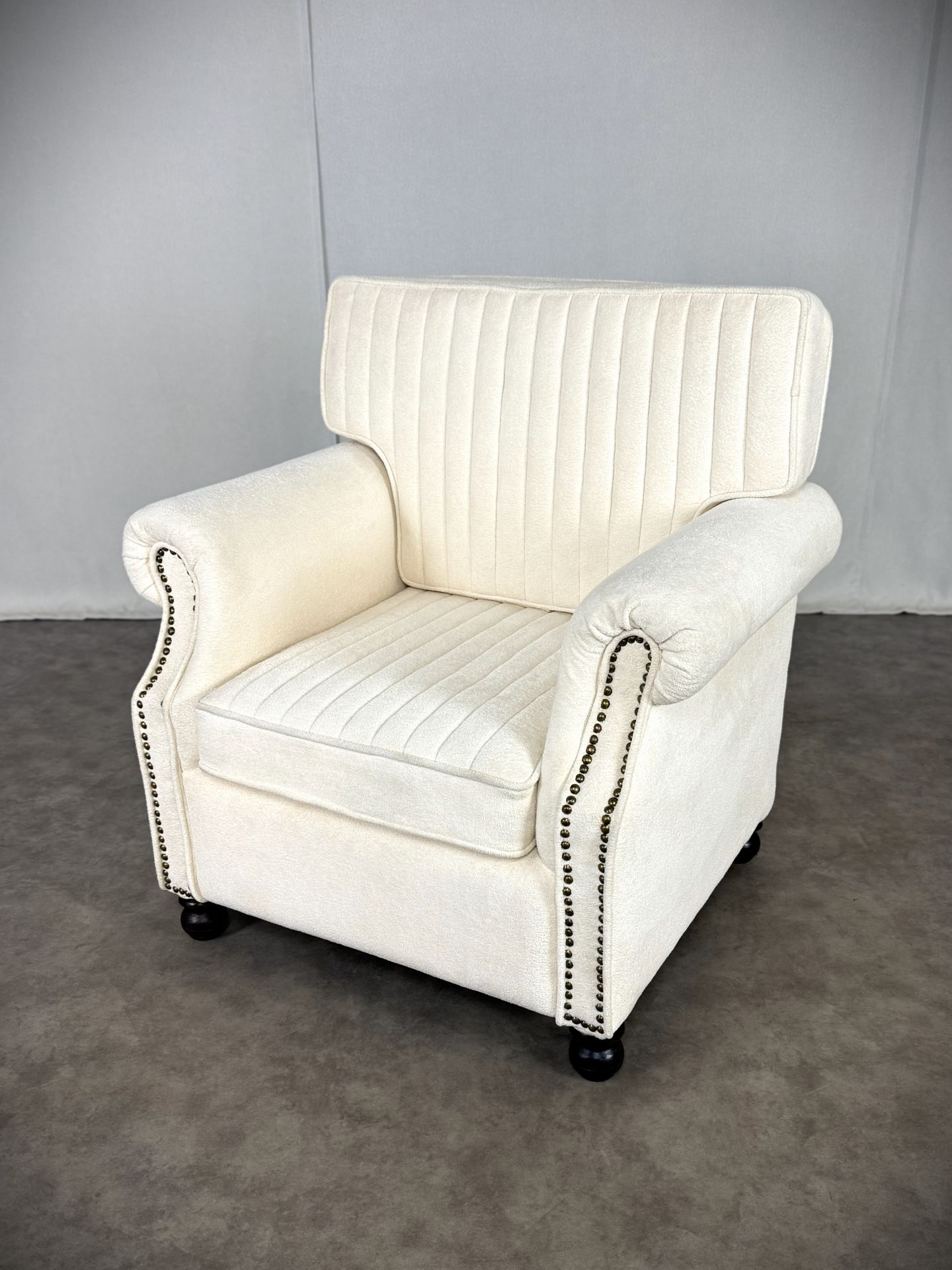 Die hochwertige Polsterung sorgt für ein besonders angenehmes Sitzgefühl, während die weiche Oberfläche im Teddy-Look eine gemütliche und zugleich edle Optik verleiht. Die vertikal gesteppten Rückenlehnen-Details unterstreichen den Vintage-Charakter und machen den Sessel zu einem echten Blickfang.