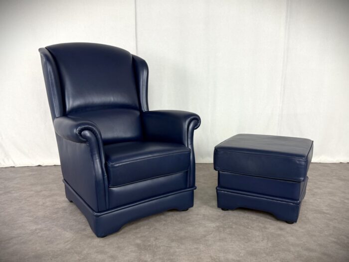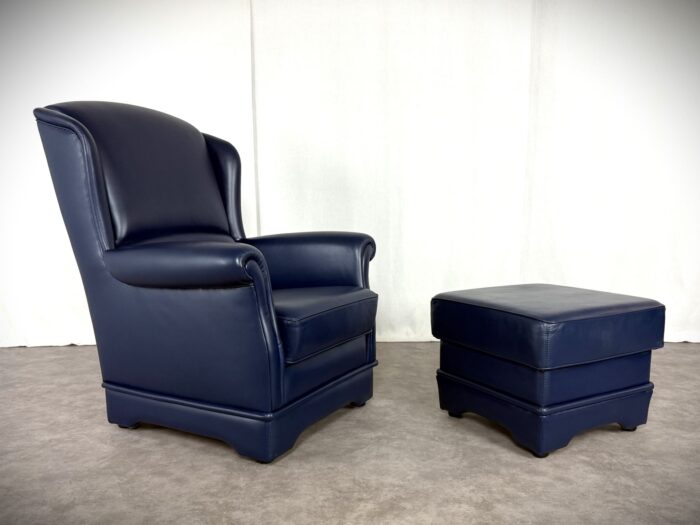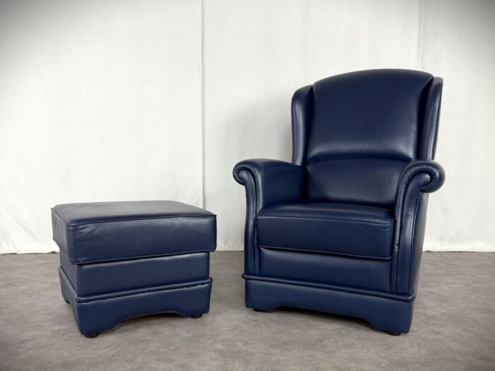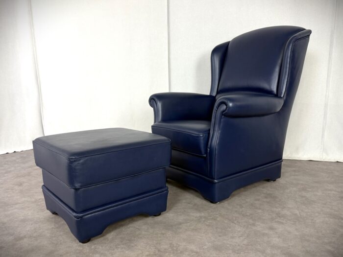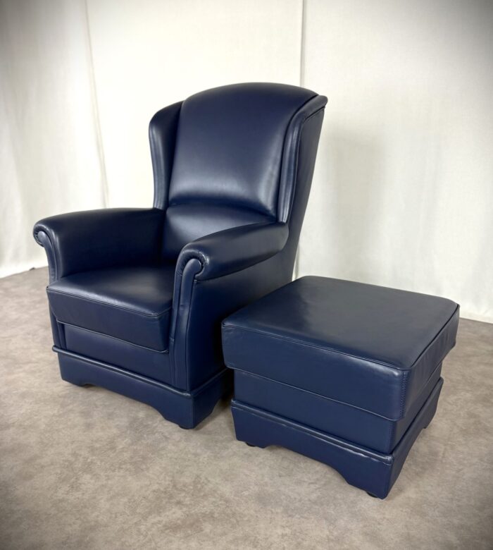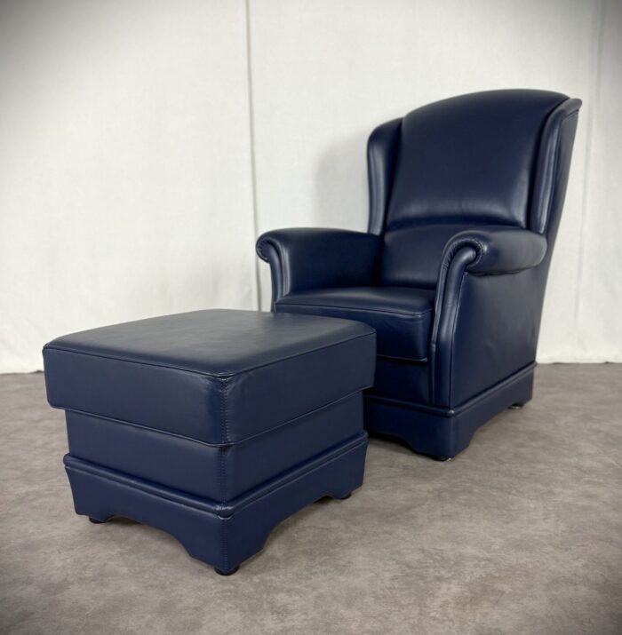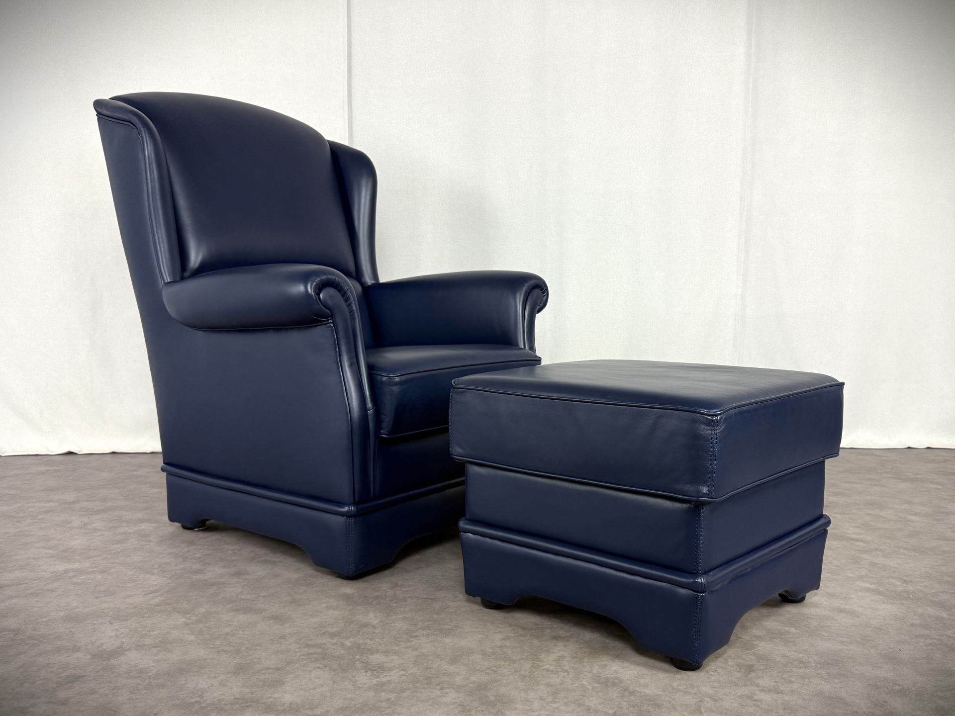 Zum Verkauf steht ein eleganter „Glad Stone“ Design Ohrensessel aus hochwertigem, blauen Rindleder mit dazugehörigem Hocker. Der Sessel überzeugt durch seine hohe Rückenlehne, zeitlosen Stil und den hohen Sitzkomfort. Perfekt für Wohn- oder Arbeitsbereiche.