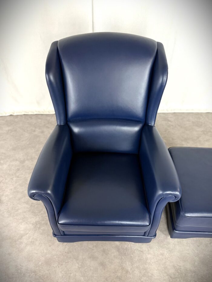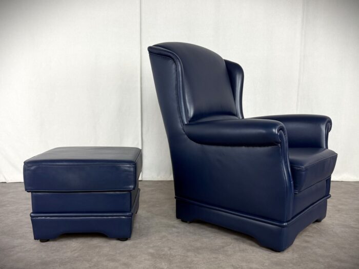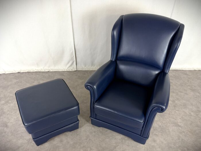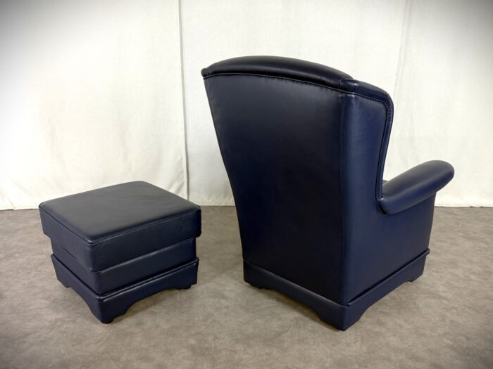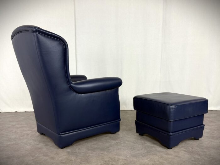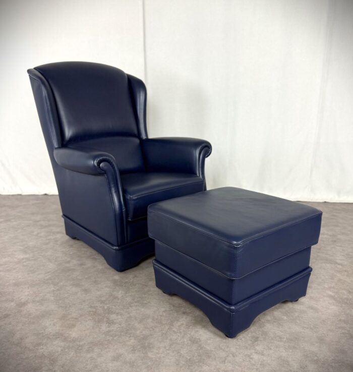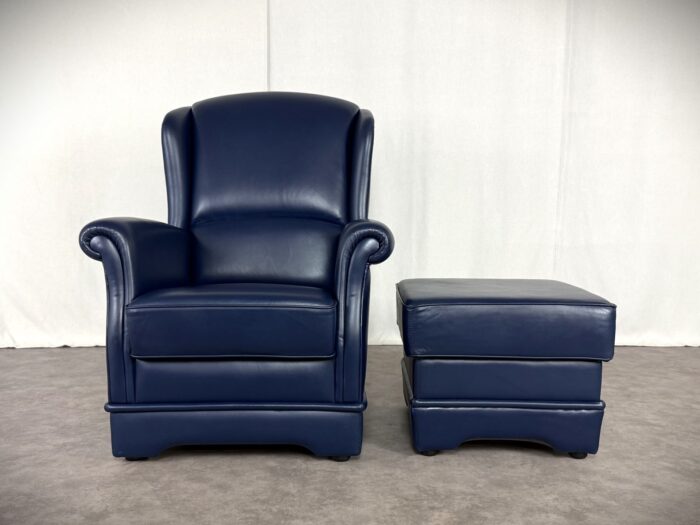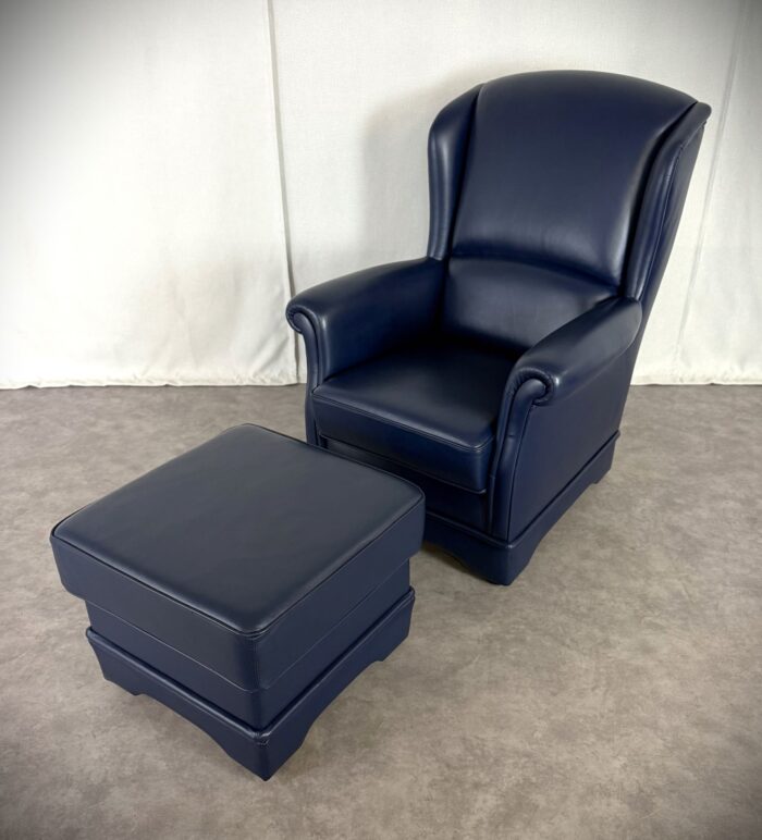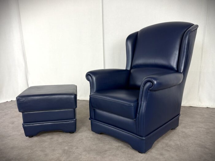 Zum Verkauf steht ein eleganter „Glad Stone“ Design Ohrensessel aus hochwertigem, blauen Rindleder mit dazugehörigem Hocker. Der Sessel überzeugt durch seine hohe Rückenlehne, zeitlosen Stil und den hohen Sitzkomfort. Perfekt für Wohn- oder Arbeitsbereiche.