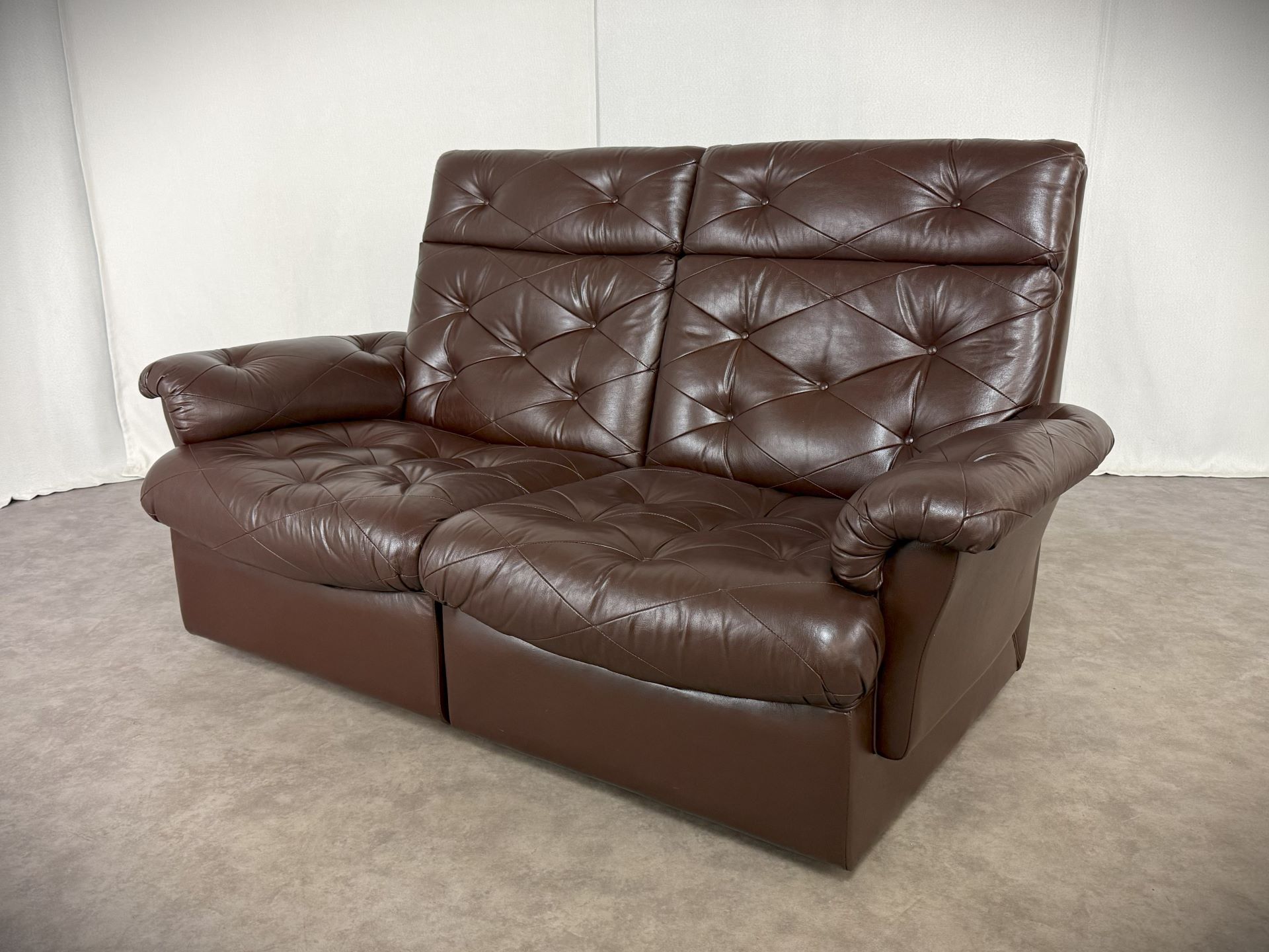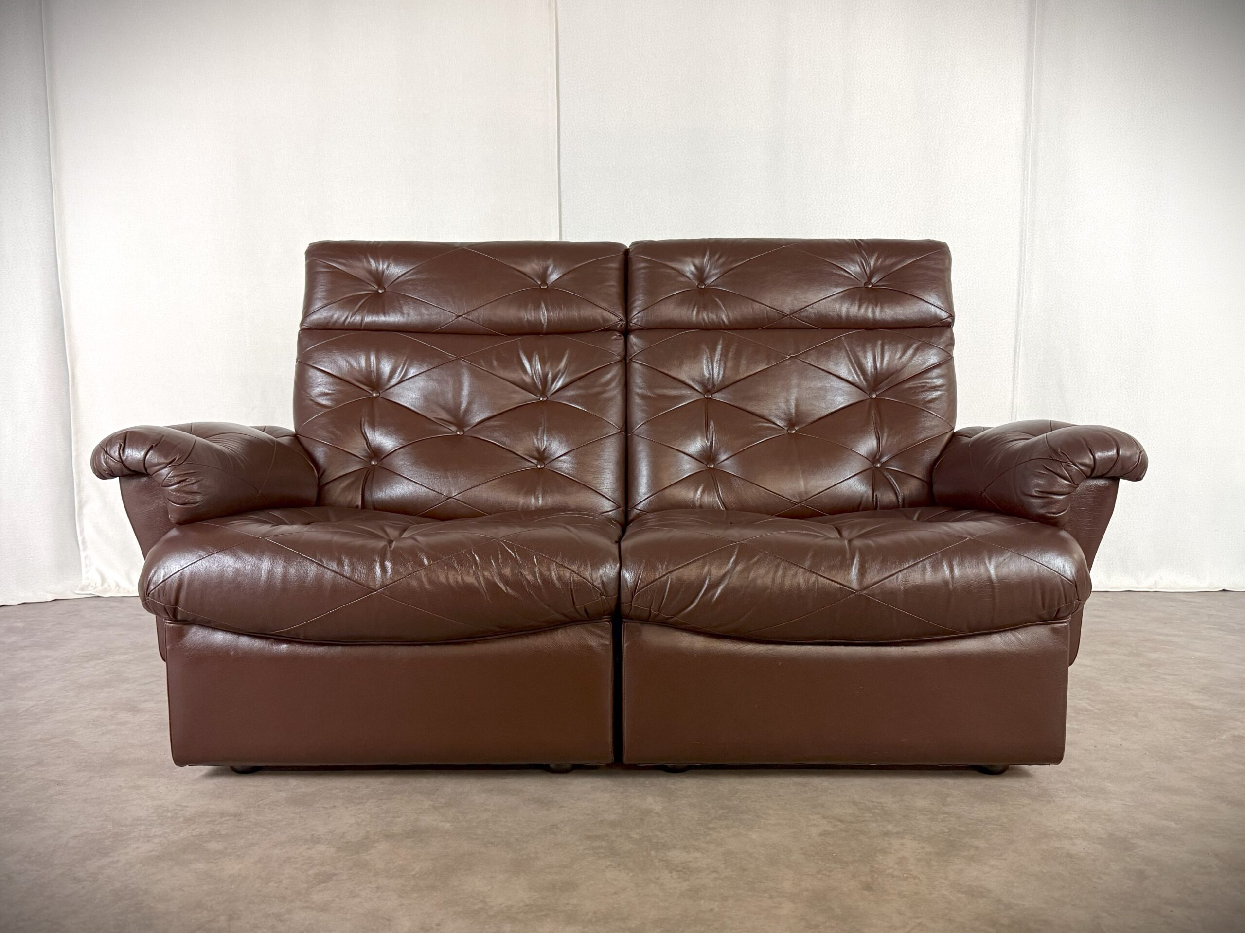 Zum Verkauf steht ein exklusives und seltenes Ledersofa aus den 1970er Jahren, das sich blitzschnell in zwei vollwertige Sessel zerlegen lässt – perfekt für flexible Wohnkonzepte oder als stylisches Ensemble.