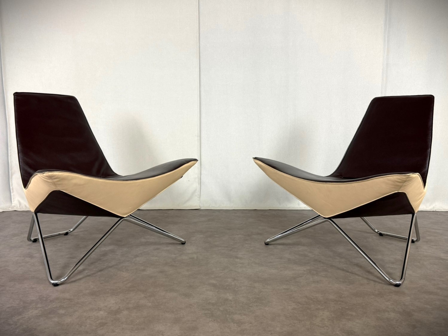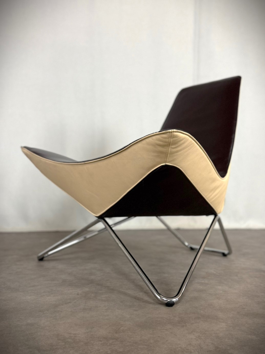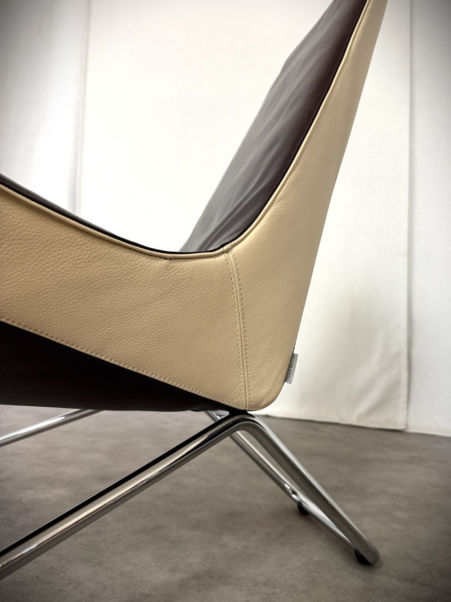 Fließende Linien formen die ergonomische Silhouette und sorgen für entspanntes Sitzen. Schräge, runde und gerade Flächen wechseln sich harmonisch ab und lassen Fußgestell, Sitz und Rückenlehne zu einer kraftvollen Komposition verschmelzen. Das weich modellierte Braun-Beige Leder bildet konvexe und konkave Formen, die Komfort und Design perfekt vereinen.