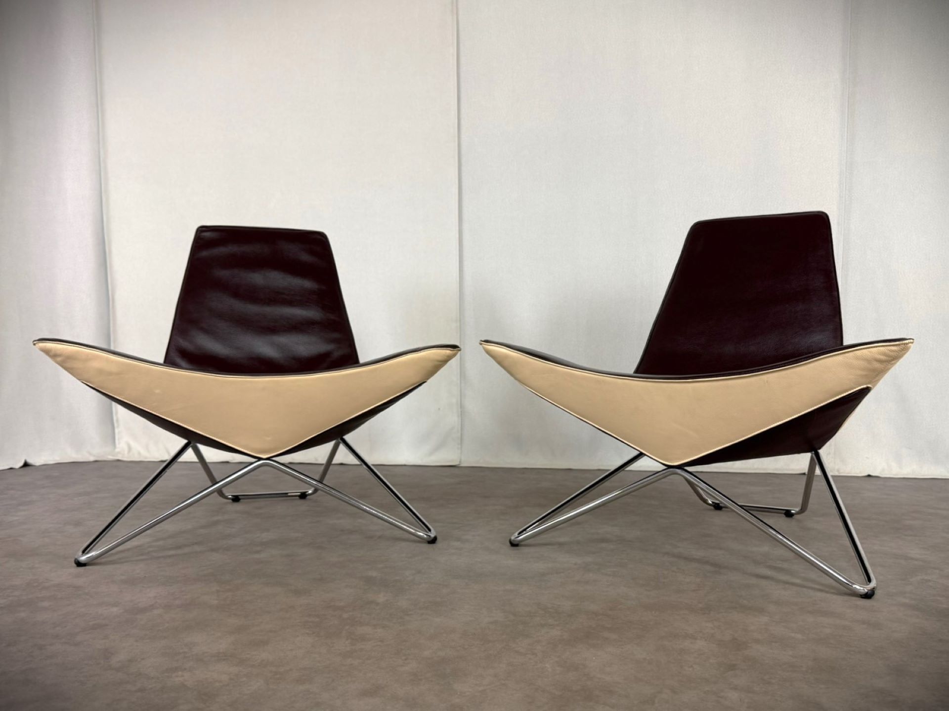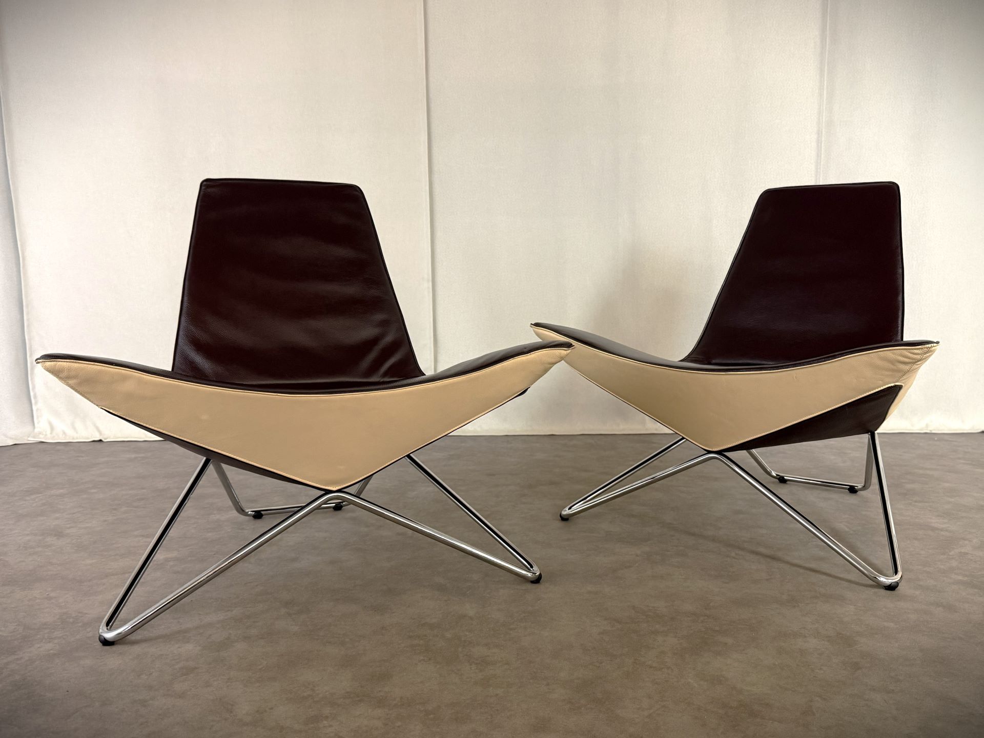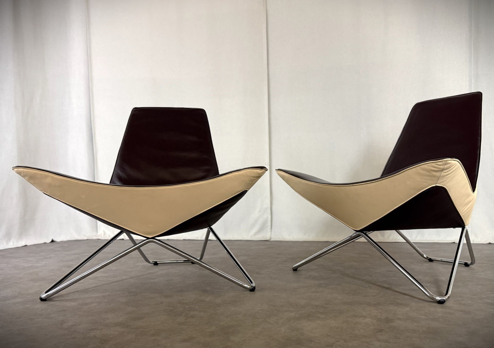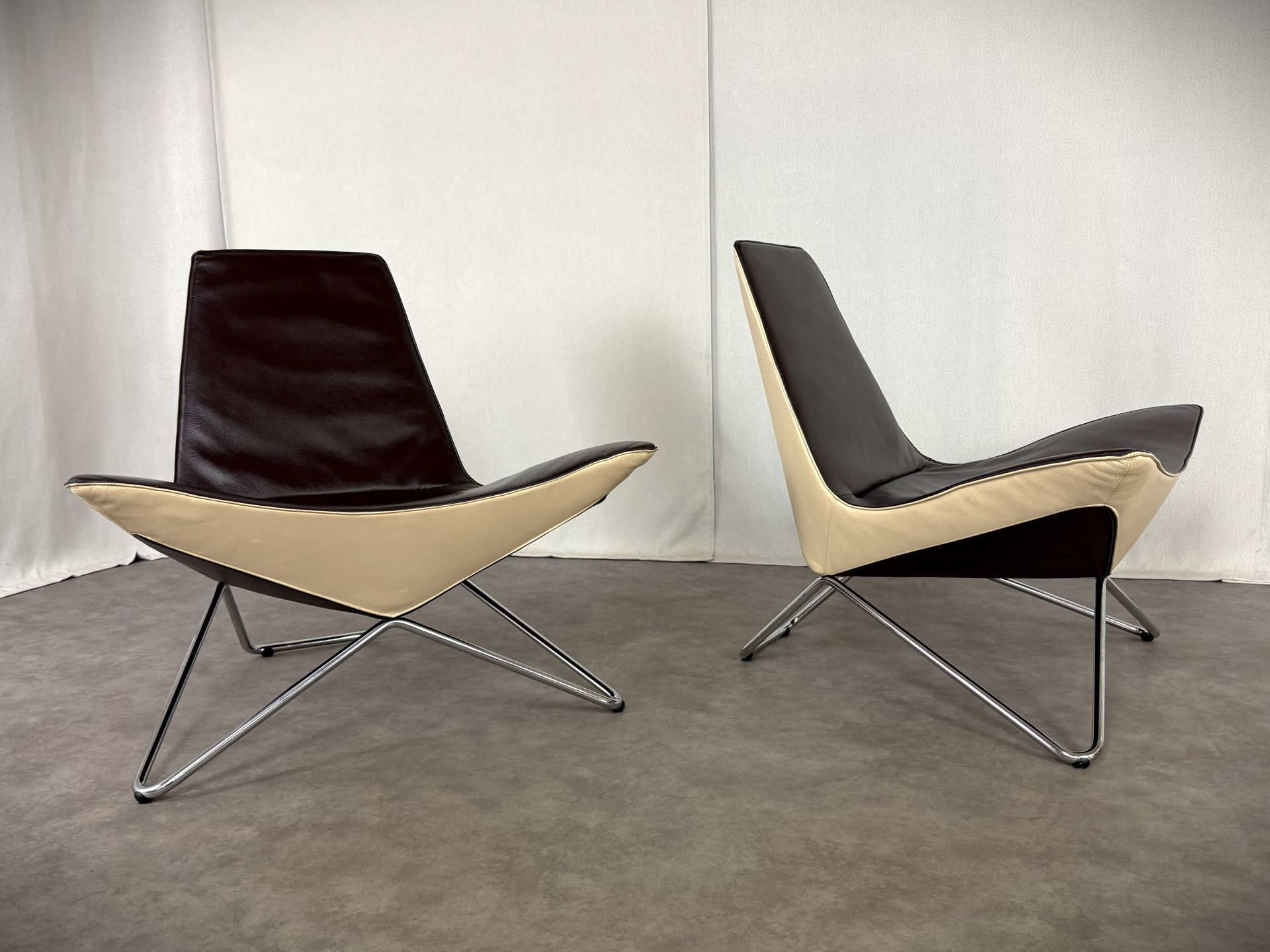 Fließende Linien formen die ergonomische Silhouette und sorgen für entspanntes Sitzen. Schräge, runde und gerade Flächen wechseln sich harmonisch ab und lassen Fußgestell, Sitz und Rückenlehne zu einer kraftvollen Komposition verschmelzen. Das weich modellierte Braun-Beige Leder bildet konvexe und konkave Formen, die Komfort und Design perfekt vereinen.